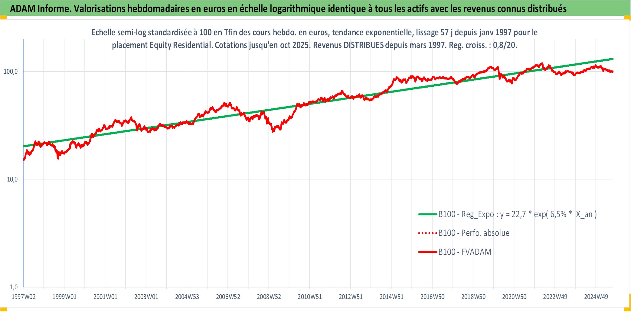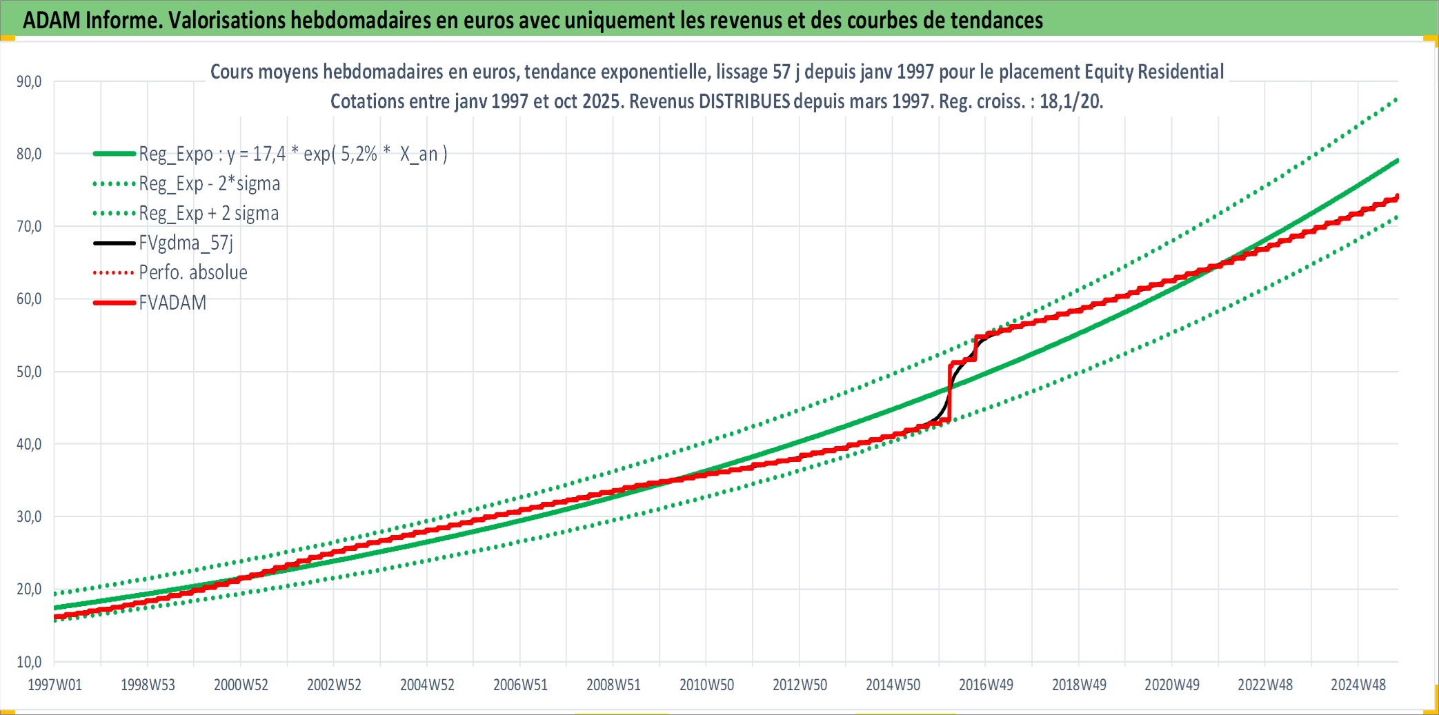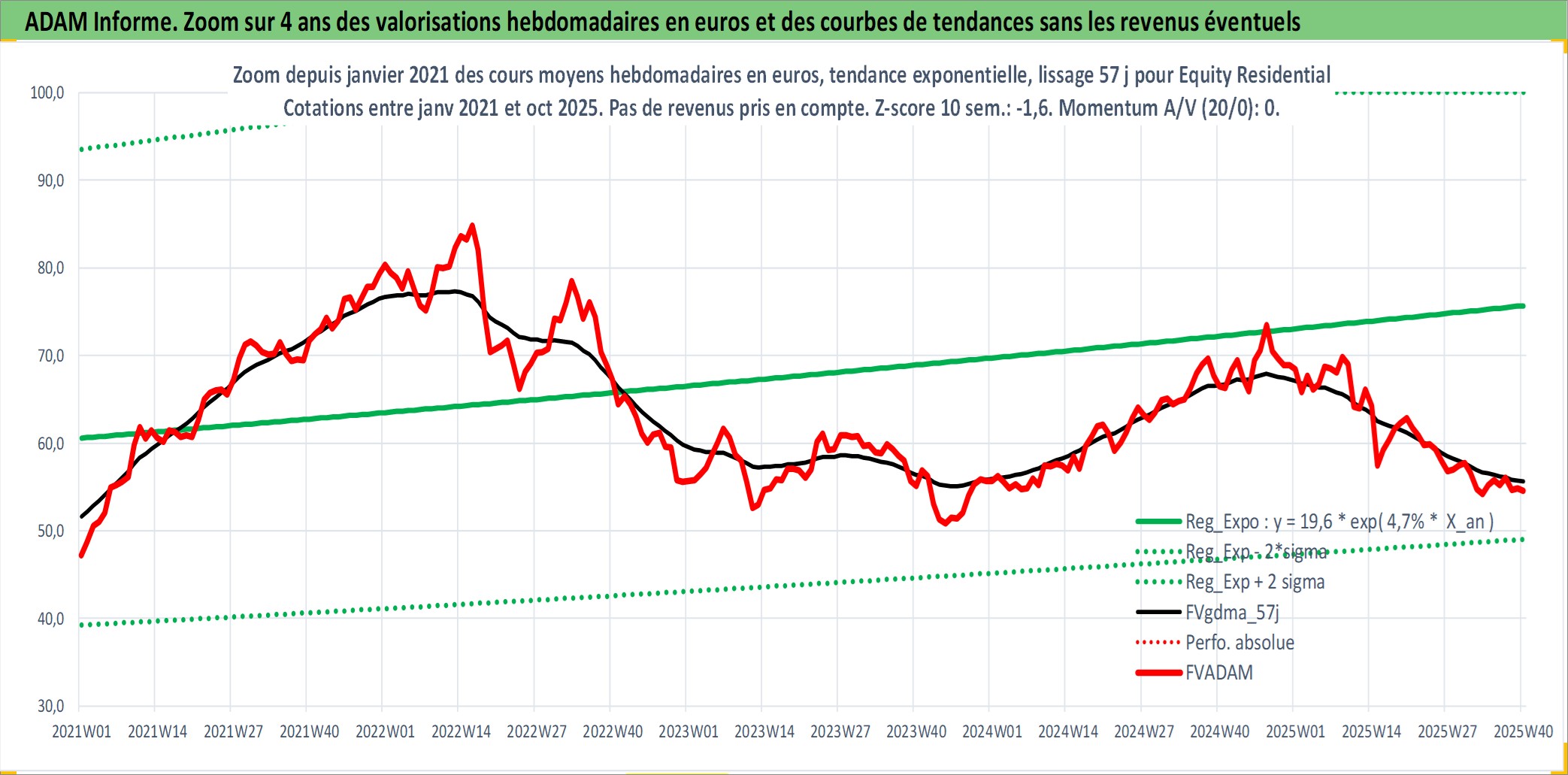 Site dédié aux investisseursPage dédiée sur site financeAnalyse des valorisations hebdomadaires de l'action Equity Residential. Cet actif est cote en USD. Les valorisations sont en contrevaleur EURO et couvrent les semaines 1997W01 a 2025W40. Les revenus de cet actif financier sont pris en compte depuis la semaine 1997W13. La note globale ESG de cet actif est estimee a 16.0 (apres rebasage entre 0 et 20).