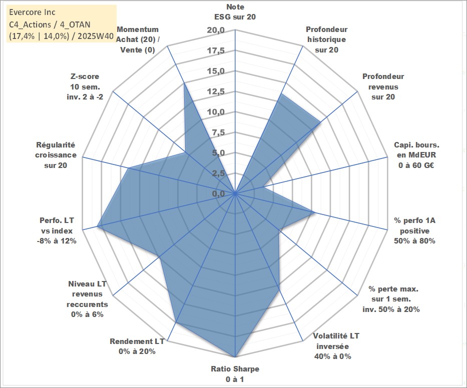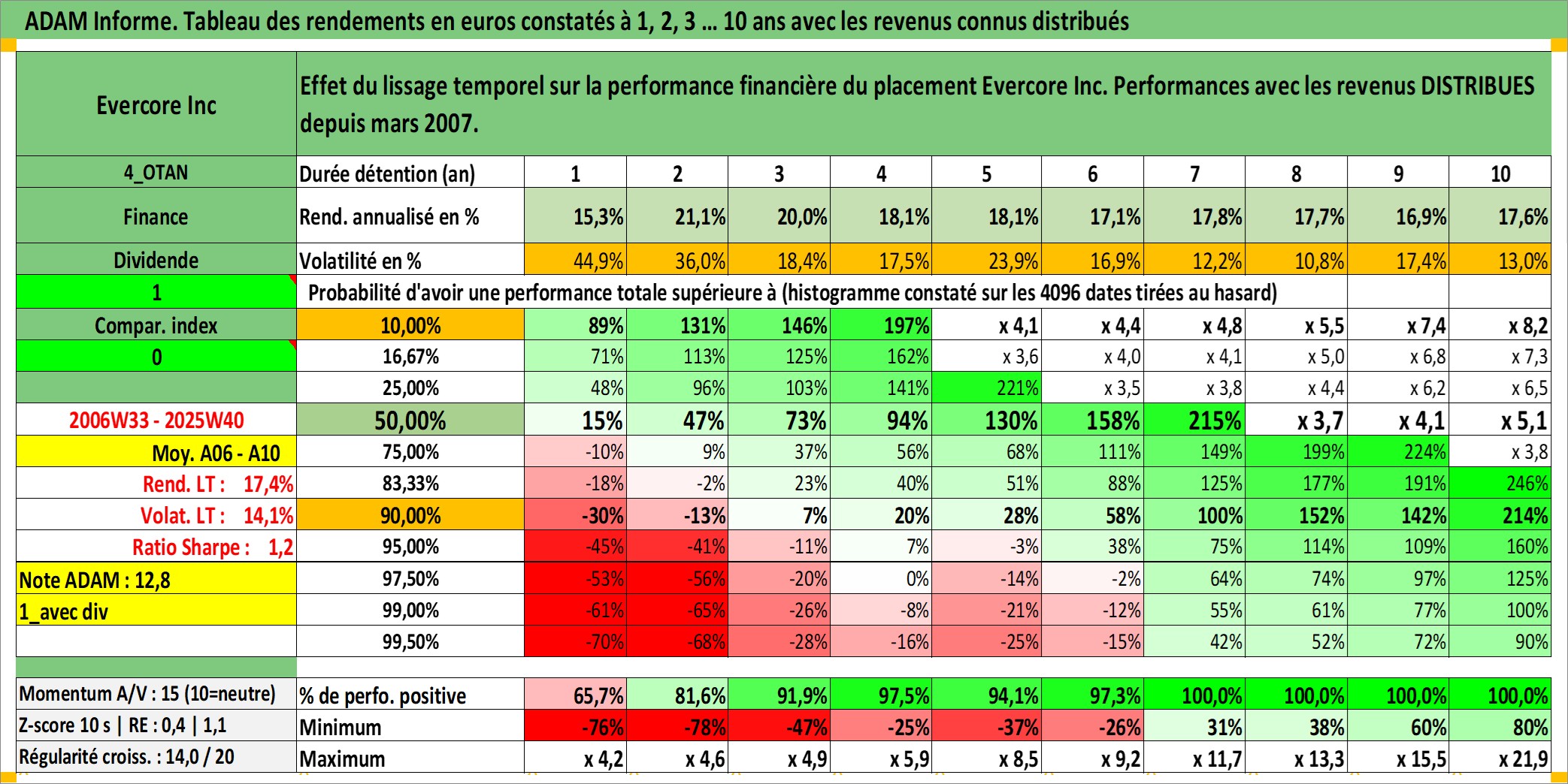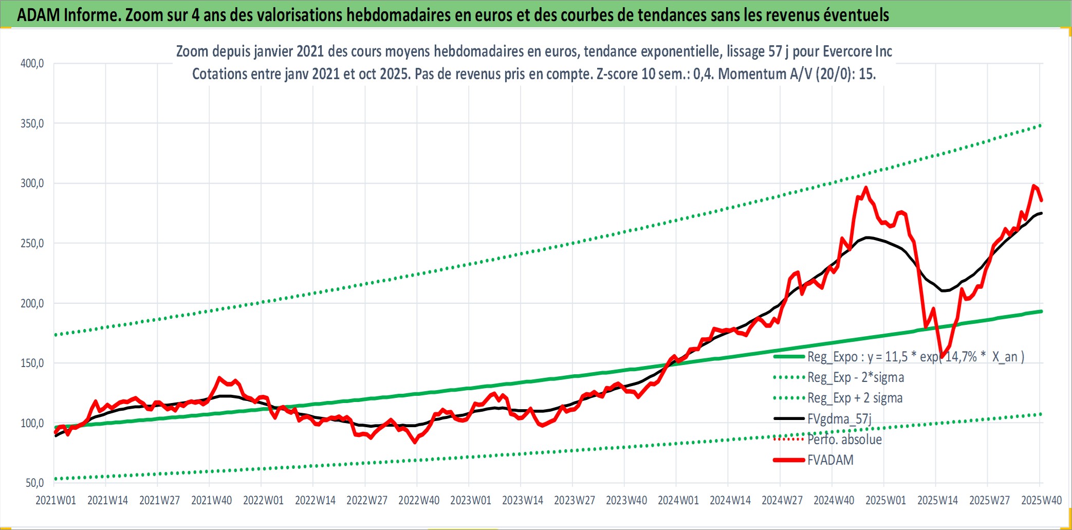 Site dédié aux investisseursPage dédiée sur site financeAnalyse des valorisations hebdomadaires de l'action Evercore Inc. Cet actif est cote en USD. Les valorisations sont en contrevaleur EURO et couvrent les semaines 2006W33 a 2025W40. Les revenus de cet actif financier sont pris en compte depuis la semaine 2007W10. La note ESG de cet actif n'est pas connue.