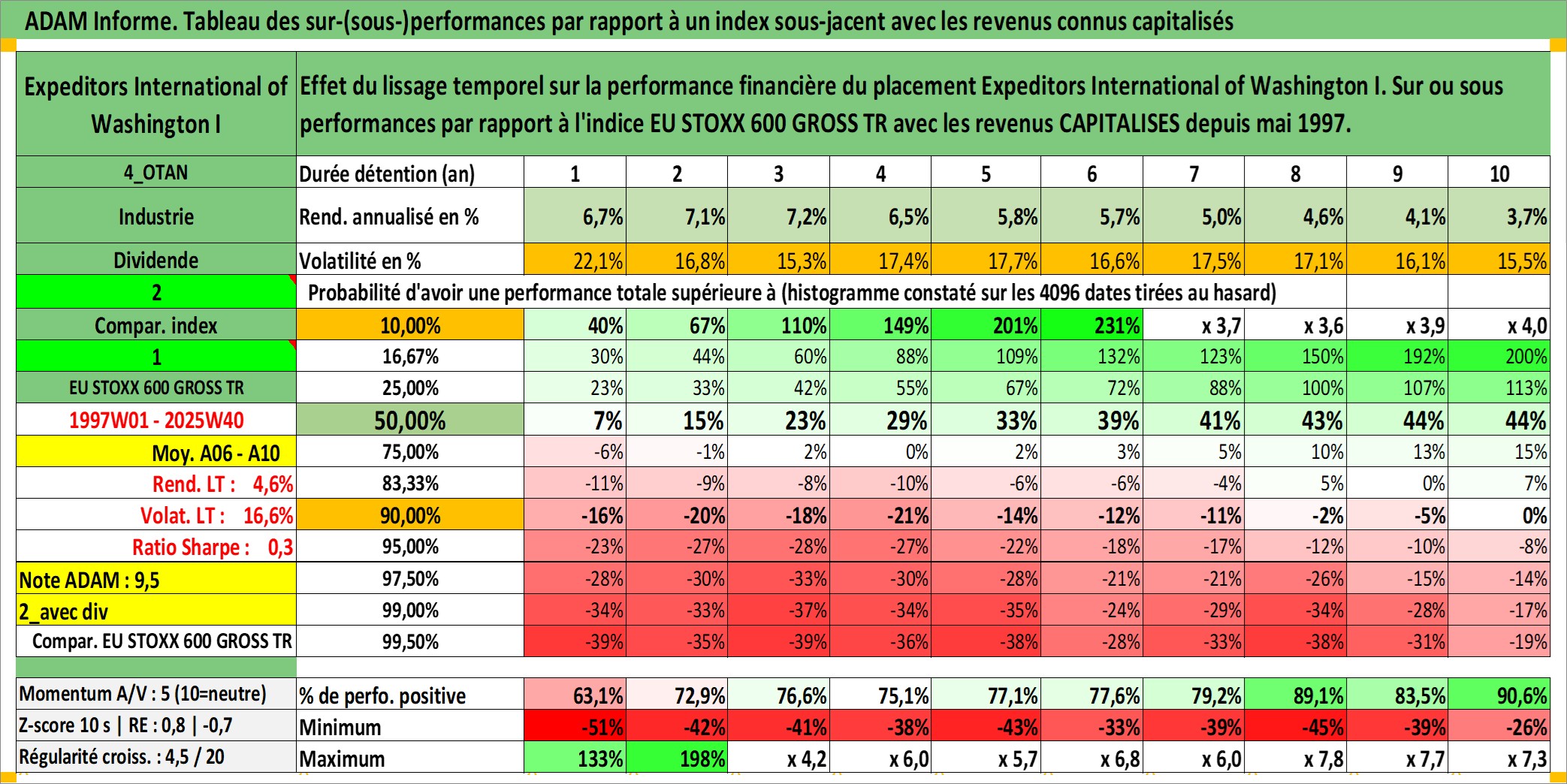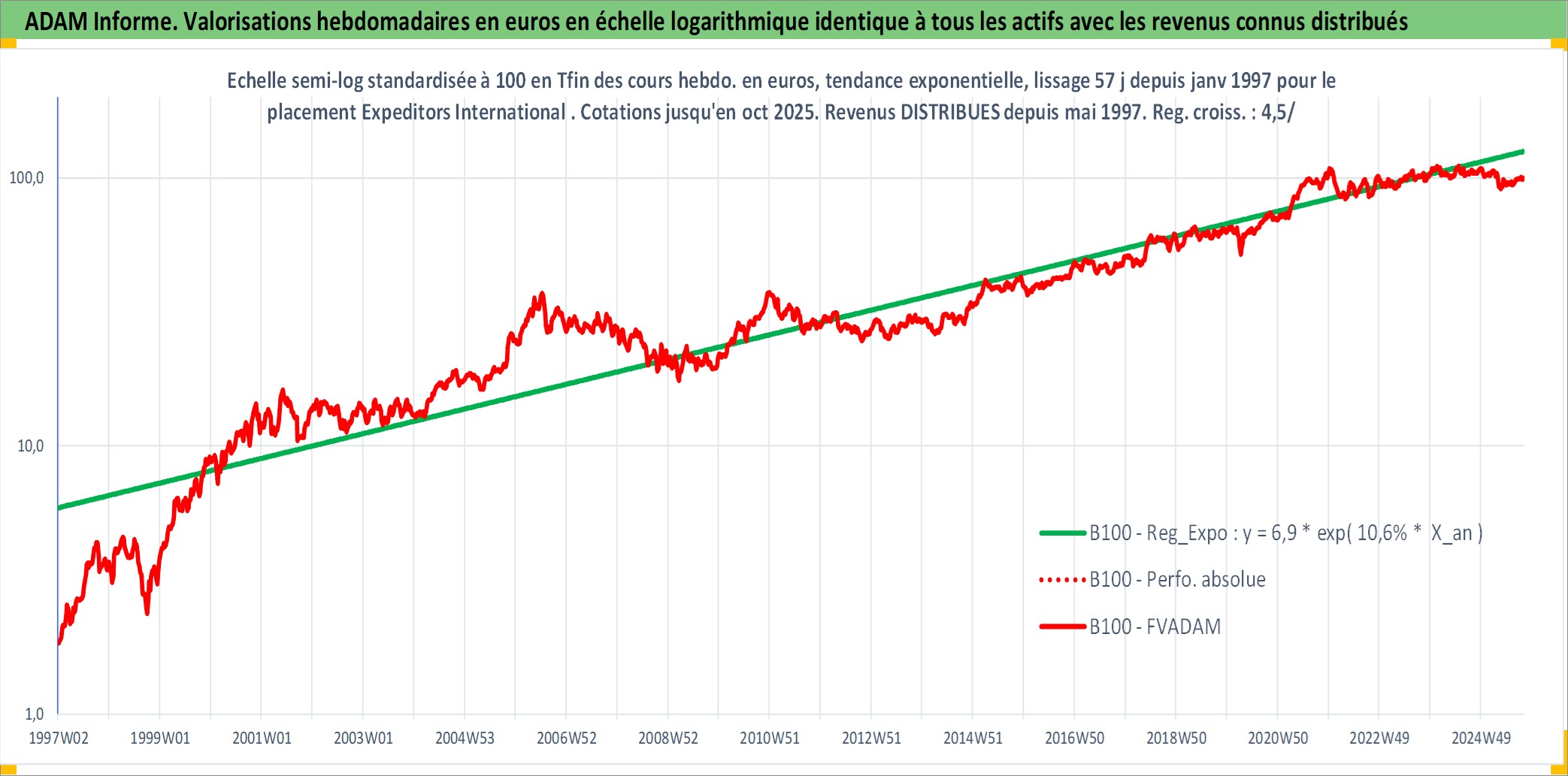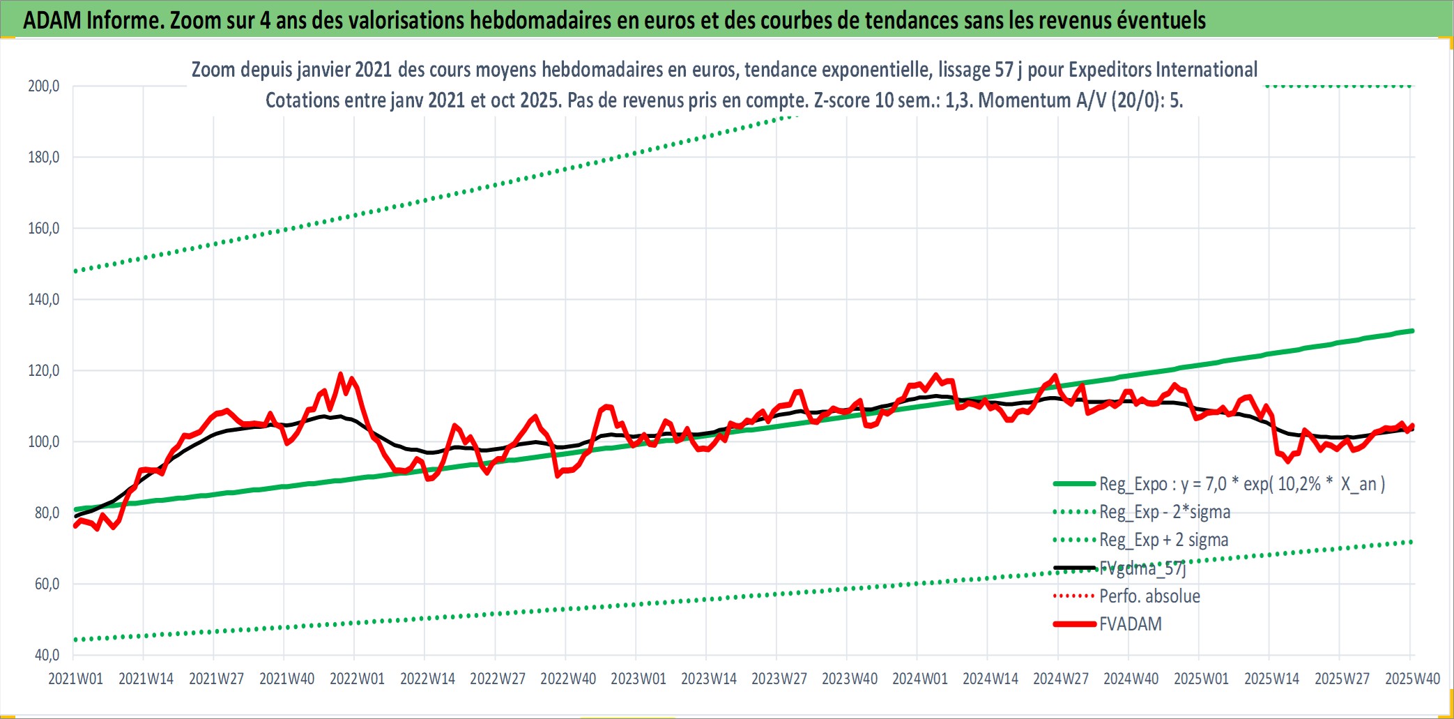 Site dédié aux investisseursPage dédiée sur site financeAnalyse des valorisations hebdomadaires de l'action Expeditors International of Washington I. Cet actif est cote en USD. Les valorisations sont en contrevaleur EURO et couvrent les semaines 1997W01 a 2025W40. Les revenus de cet actif financier sont pris en compte depuis la semaine 1997W22. La note globale ESG de cet actif est estimee a 13.0 (apres rebasage entre 0 et 20).