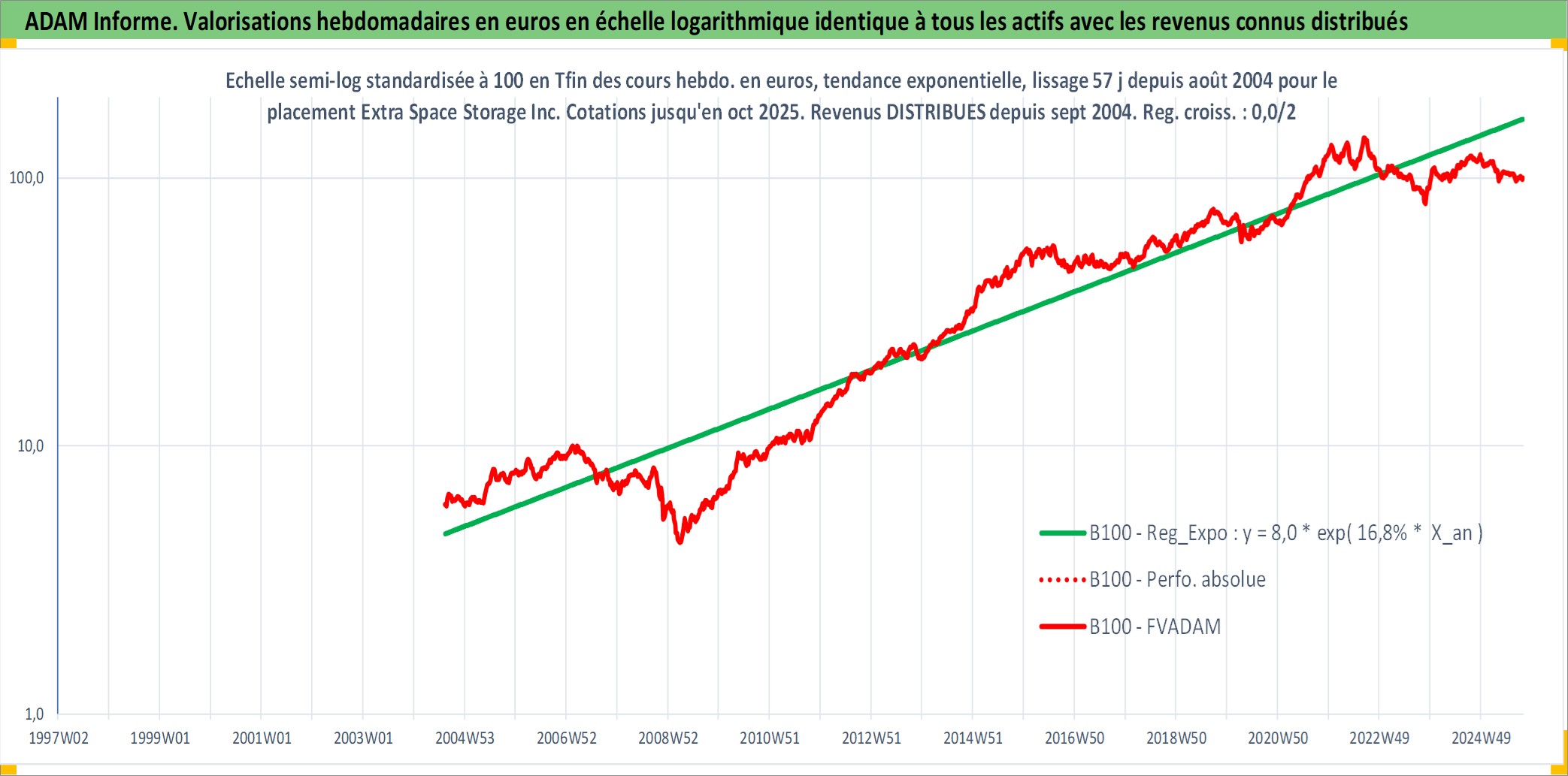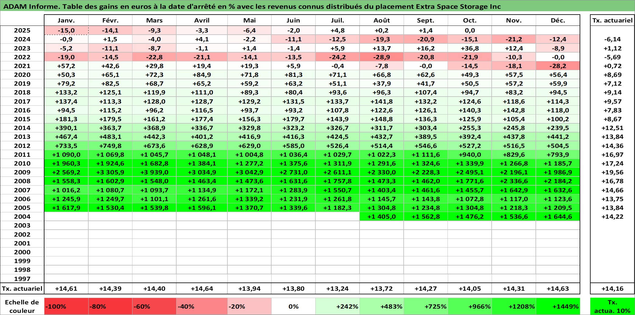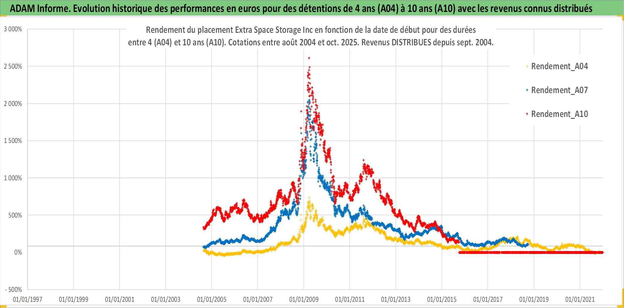 Site dédié aux investisseursPage dédiée sur site financeAnalyse des valorisations hebdomadaires de l'action Extra Space Storage Inc. Cet actif est cote en USD. Les valorisations sont en contrevaleur EURO et couvrent les semaines 2004W33 a 2025W40. Les revenus de cet actif financier sont pris en compte depuis la semaine 2004W38. La note globale ESG de cet actif est estimee a 14.0 (apres rebasage entre 0 et 20).