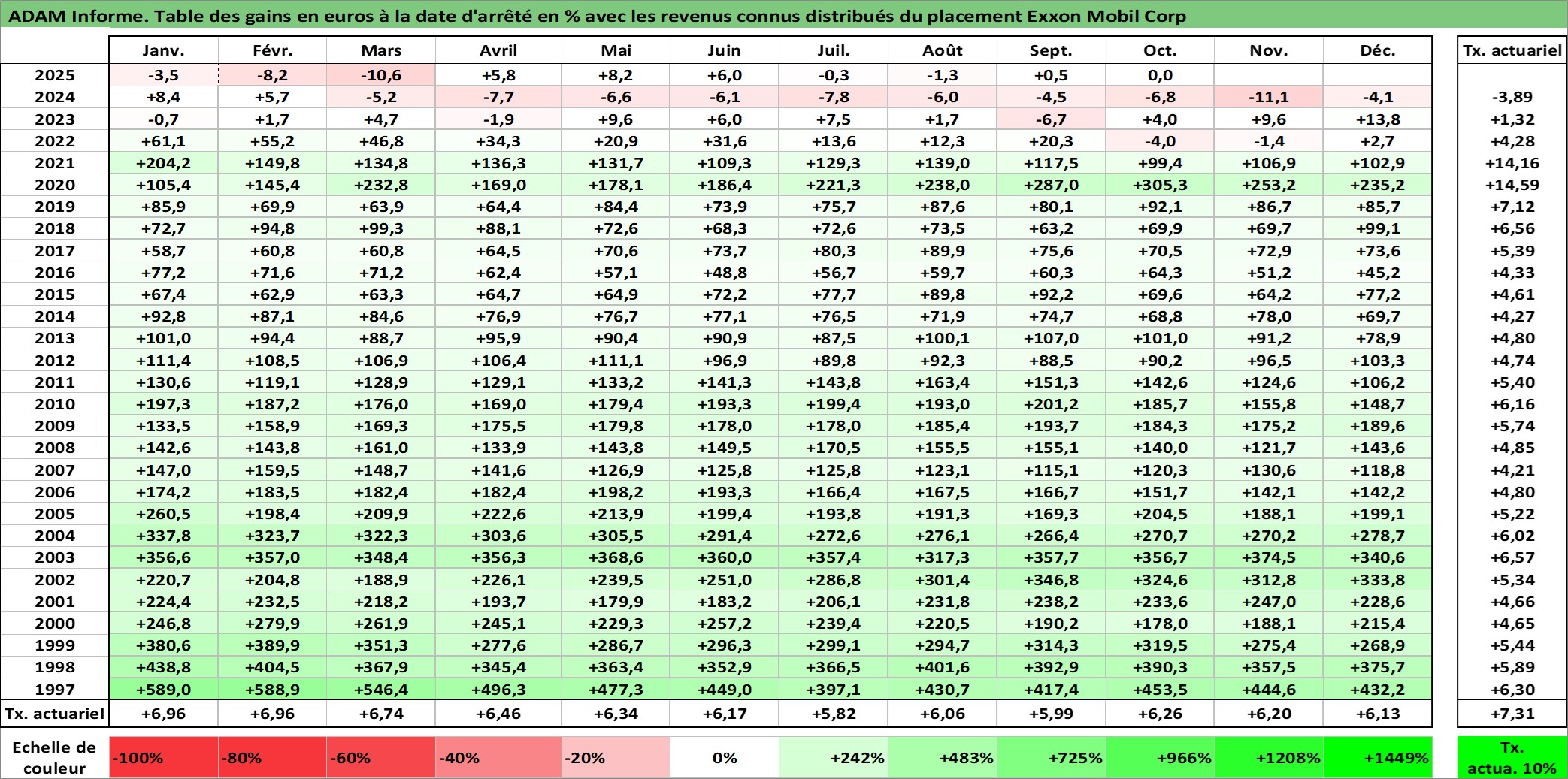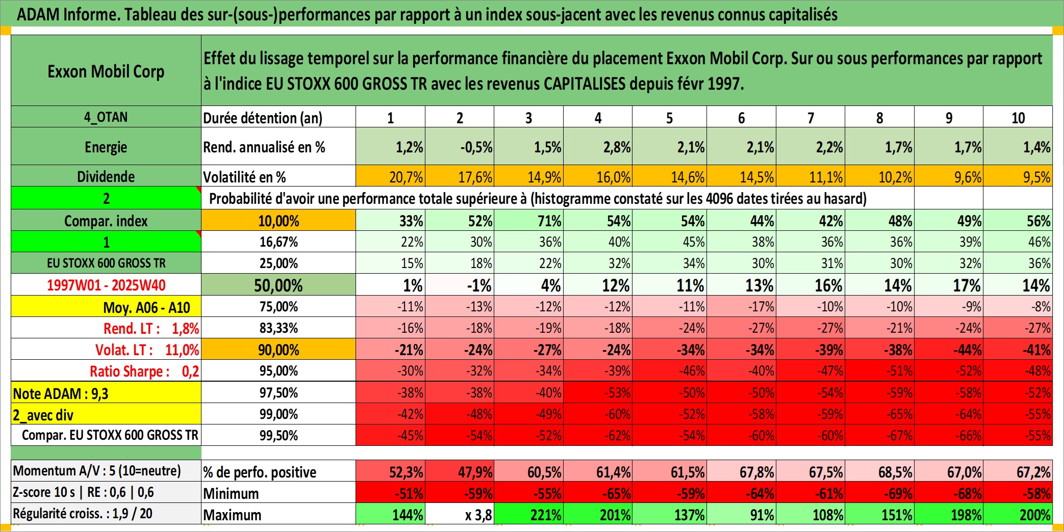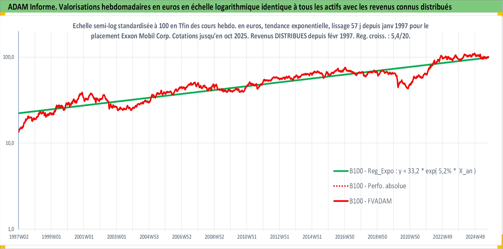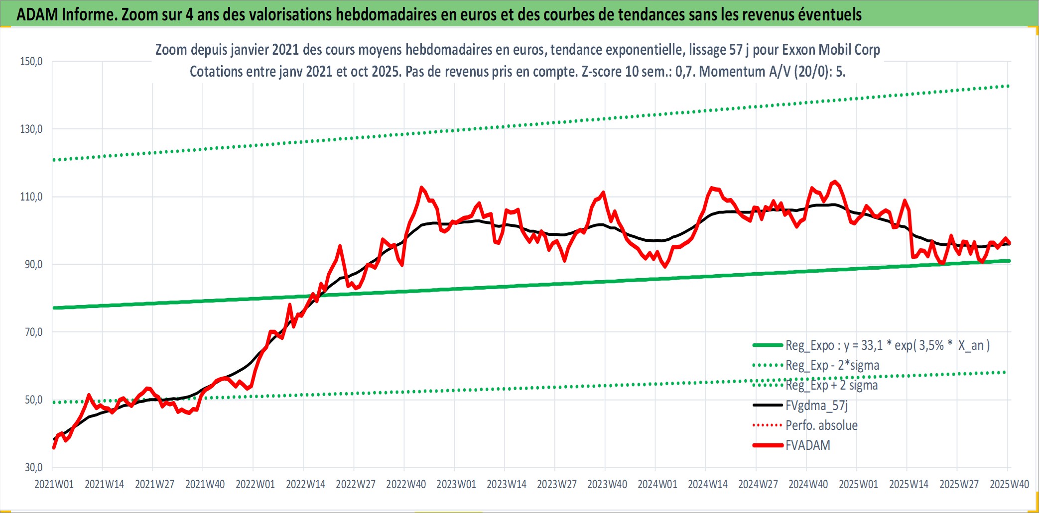 Site dédié aux investisseursPage dédiée sur site financeAnalyse des valorisations hebdomadaires de l'action Exxon Mobil Corp. Cet actif est cote en USD. Les valorisations sont en contrevaleur EURO et couvrent les semaines 1997W01 a 2025W40. Les revenus de cet actif financier sont pris en compte depuis la semaine 1997W06. La note globale ESG de cet actif est estimee a 3.0 (apres rebasage entre 0 et 20).