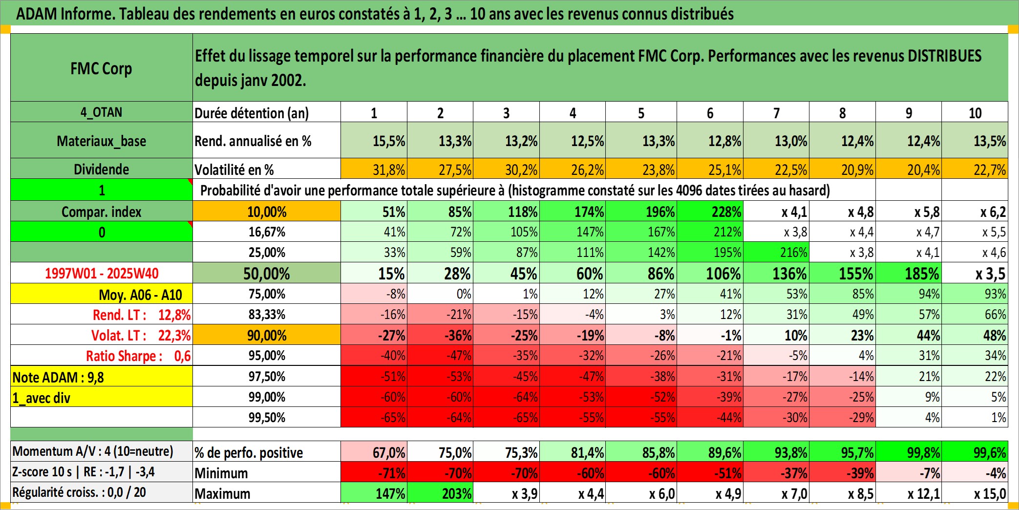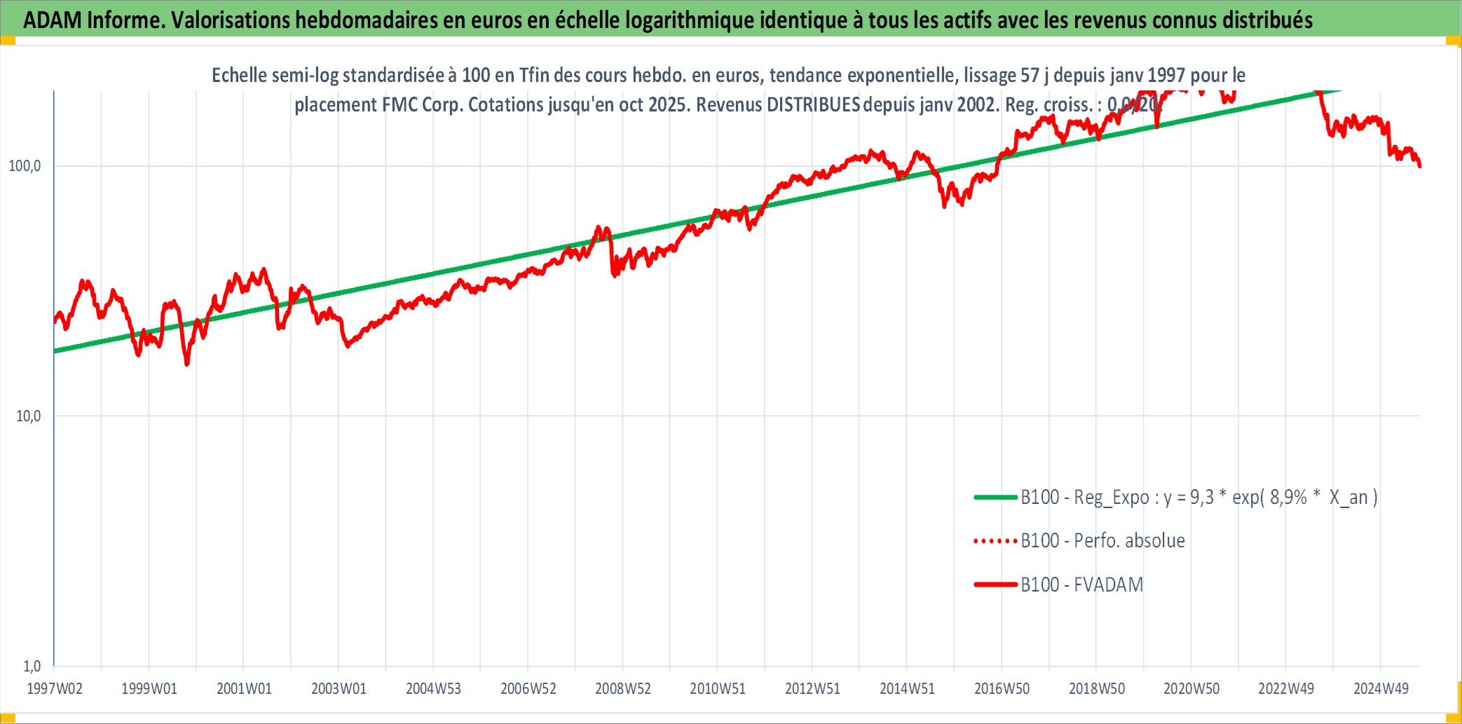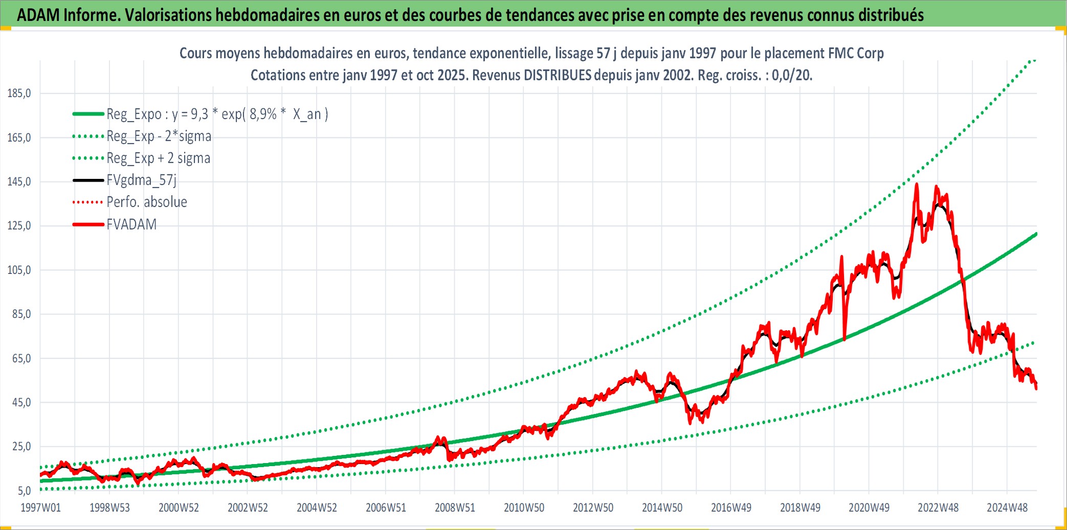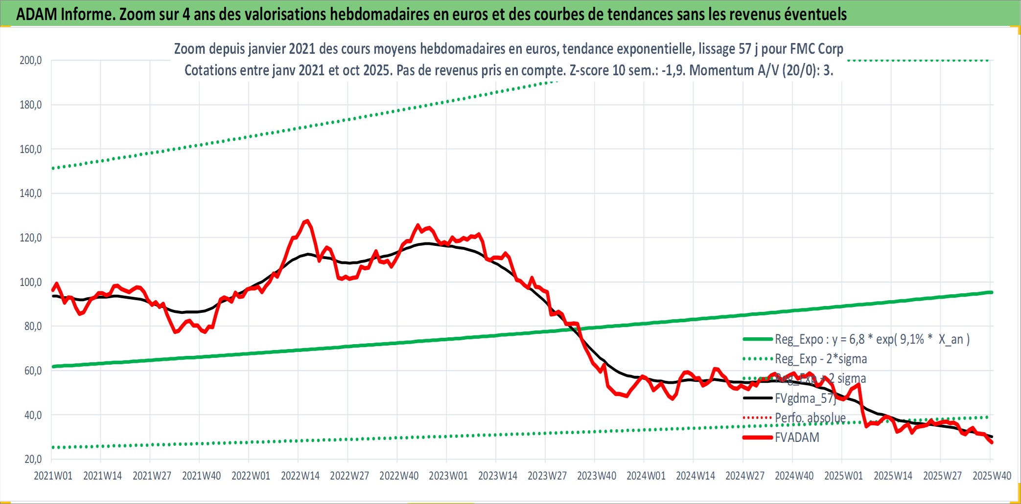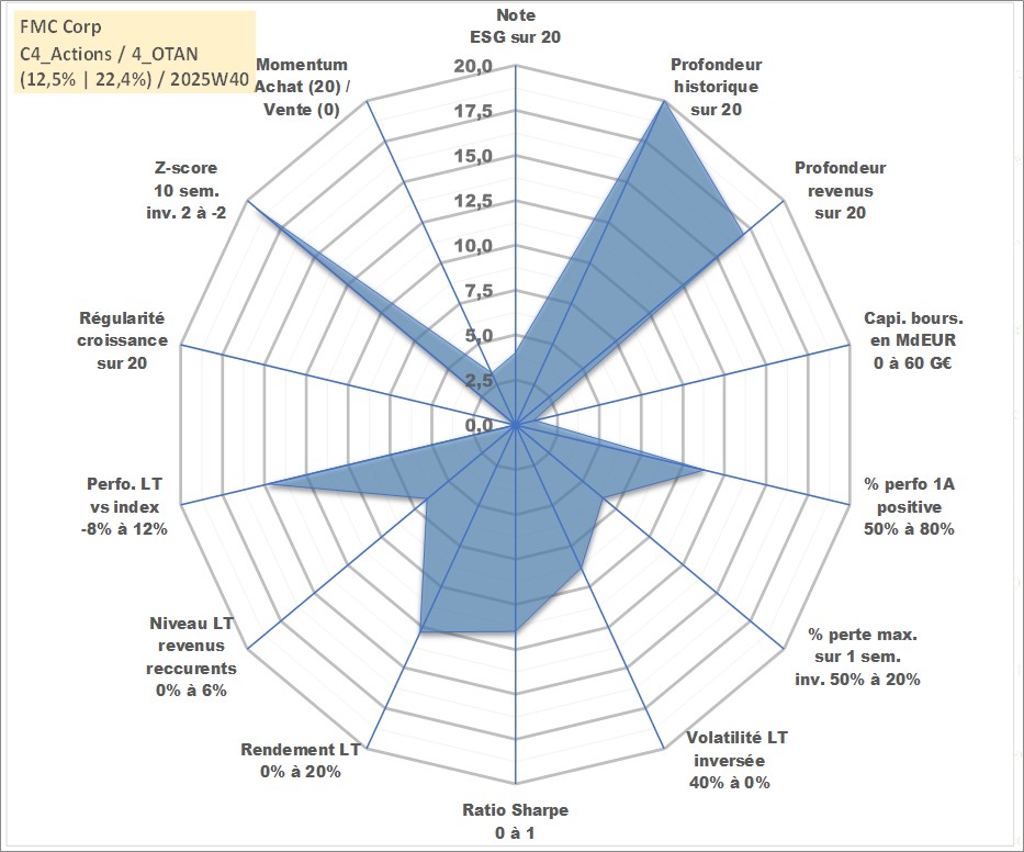 Site dédié aux investisseursPage dédiée sur site financeAnalyse des valorisations hebdomadaires de l'action FMC Corp. Cet actif est cote en USD. Les valorisations sont en contrevaleur EURO et couvrent les semaines 1997W01 a 2025W40. Les revenus de cet actif financier sont pris en compte depuis la semaine 2002W01. La note globale ESG de cet actif est estimee a 4.0 (apres rebasage entre 0 et 20).