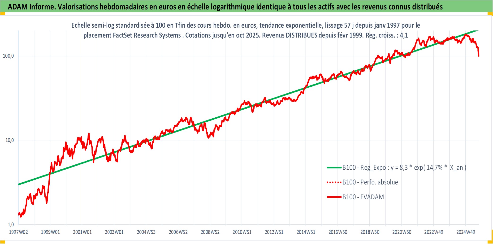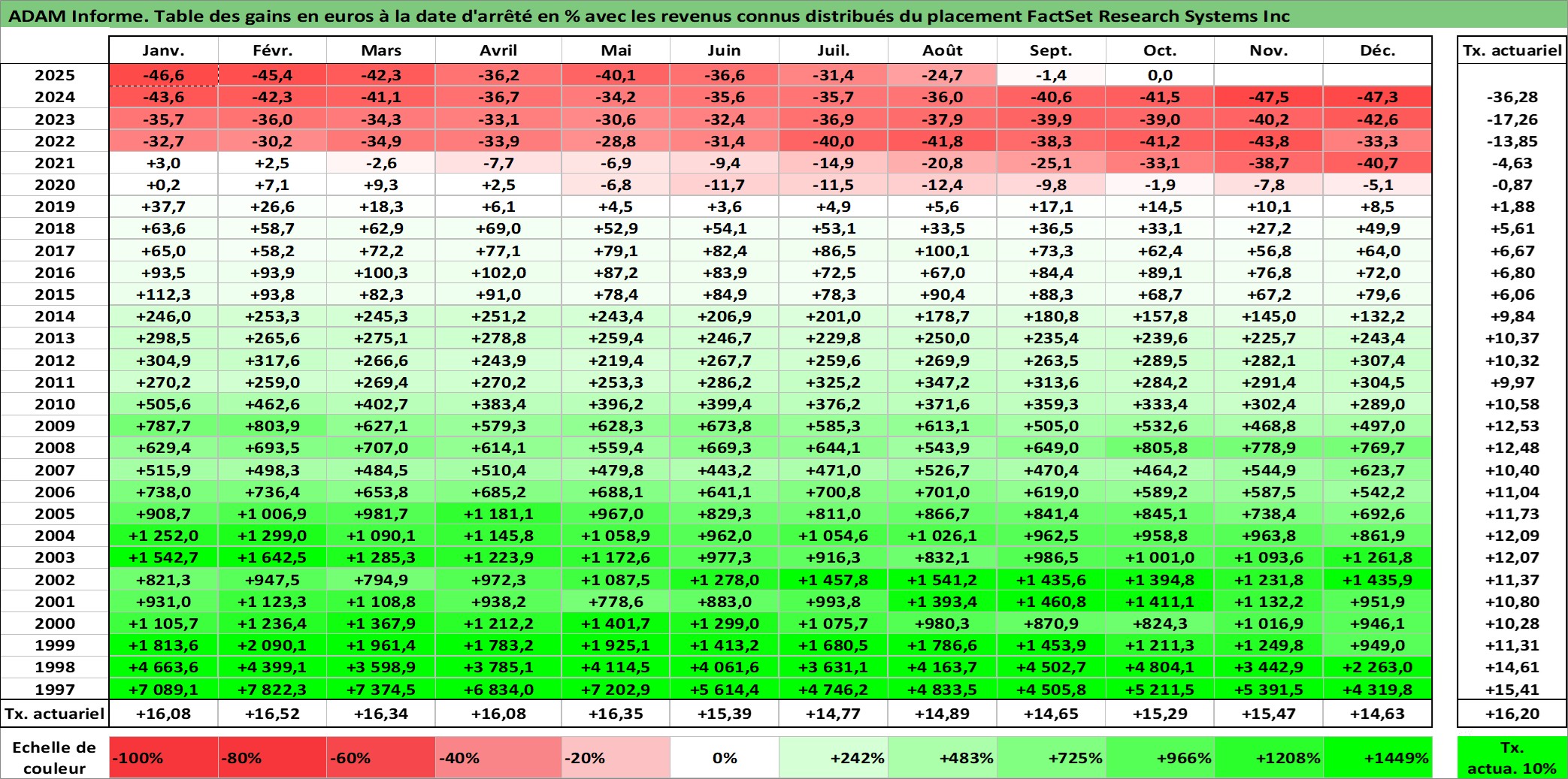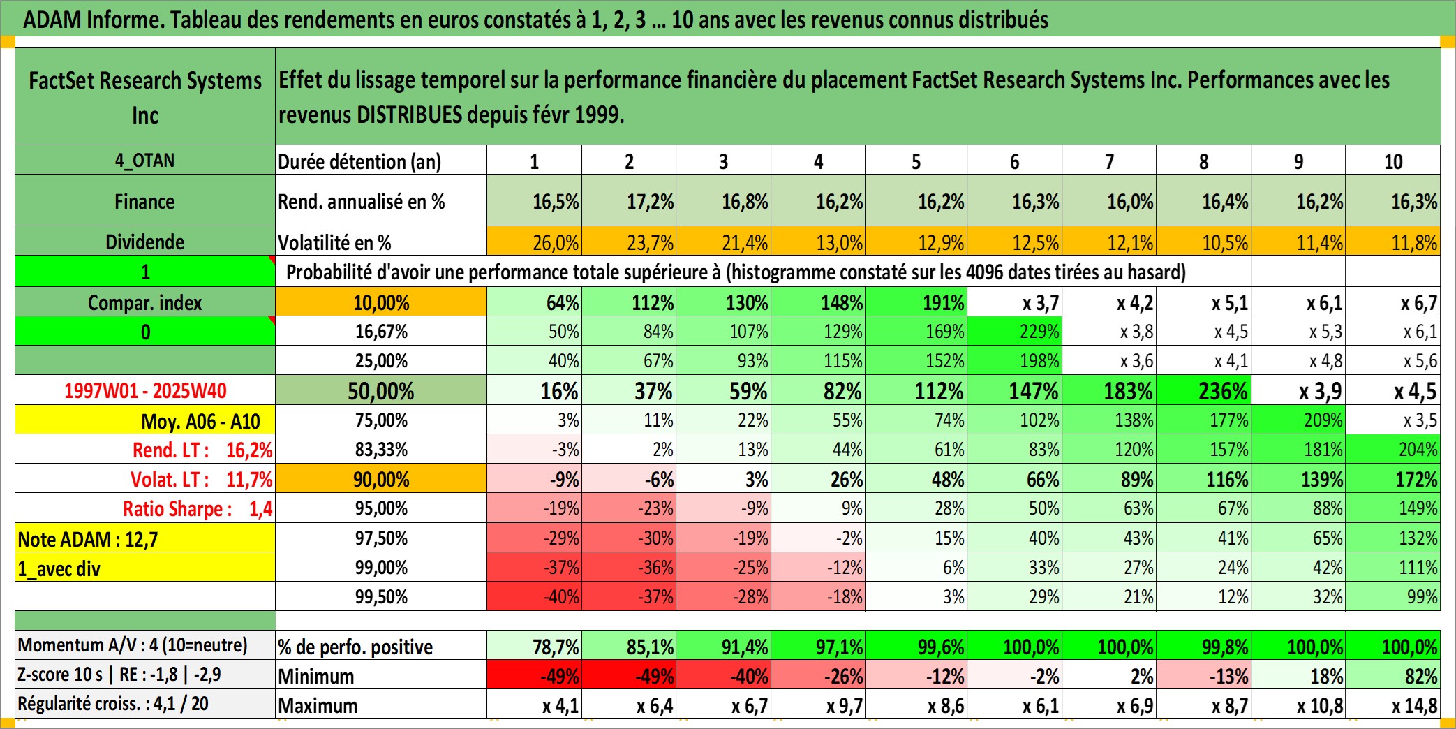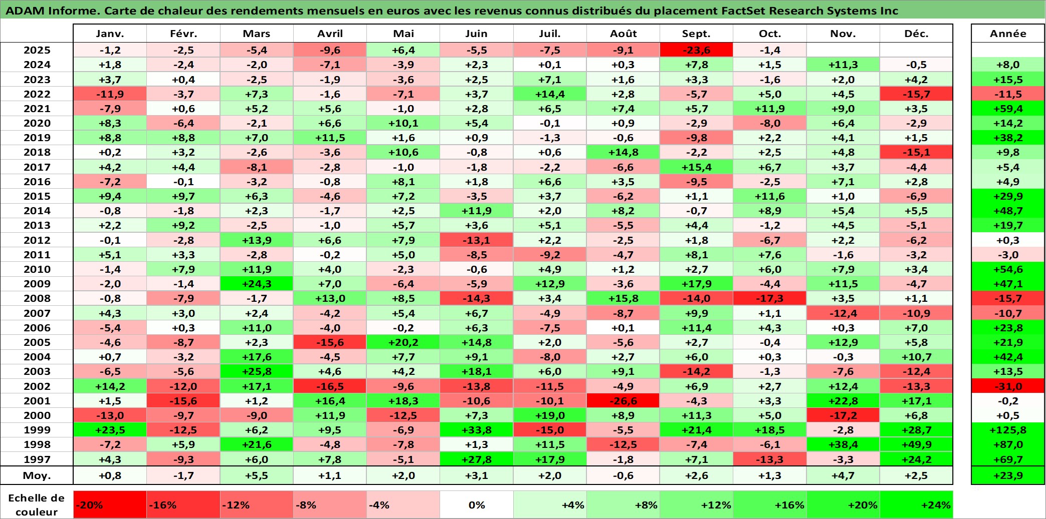 Site dédié aux investisseursPage dédiée sur site financeAnalyse des valorisations hebdomadaires de l'action FactSet Research Systems Inc. Cet actif est cote en USD. Les valorisations sont en contrevaleur EURO et couvrent les semaines 1997W01 a 2025W40. Les revenus de cet actif financier sont pris en compte depuis la semaine 1999W08. La note globale ESG de cet actif est estimee a 10.0 (apres rebasage entre 0 et 20).