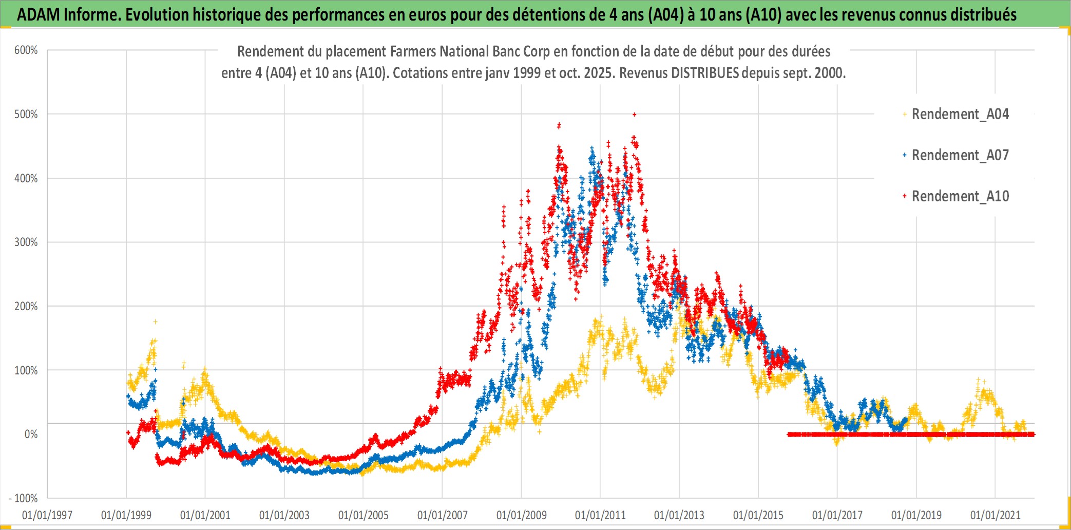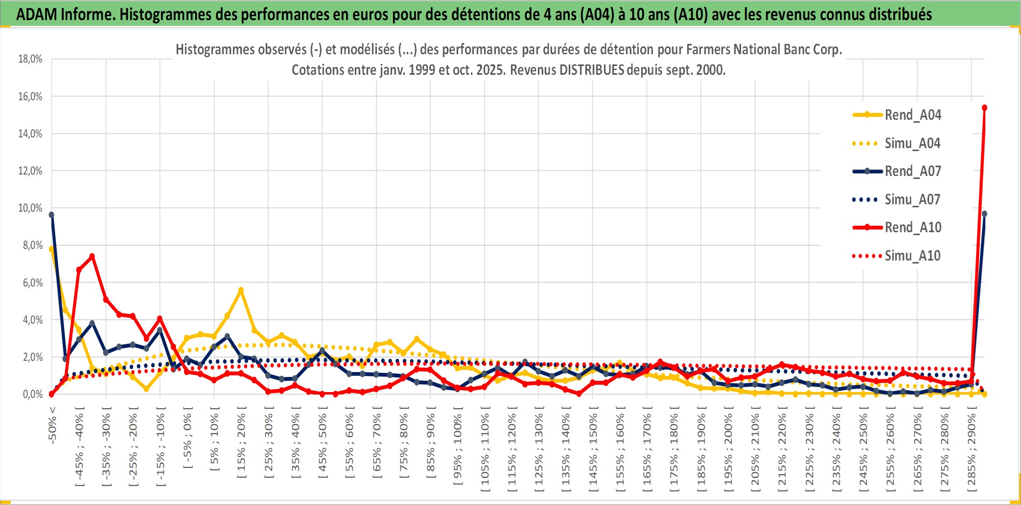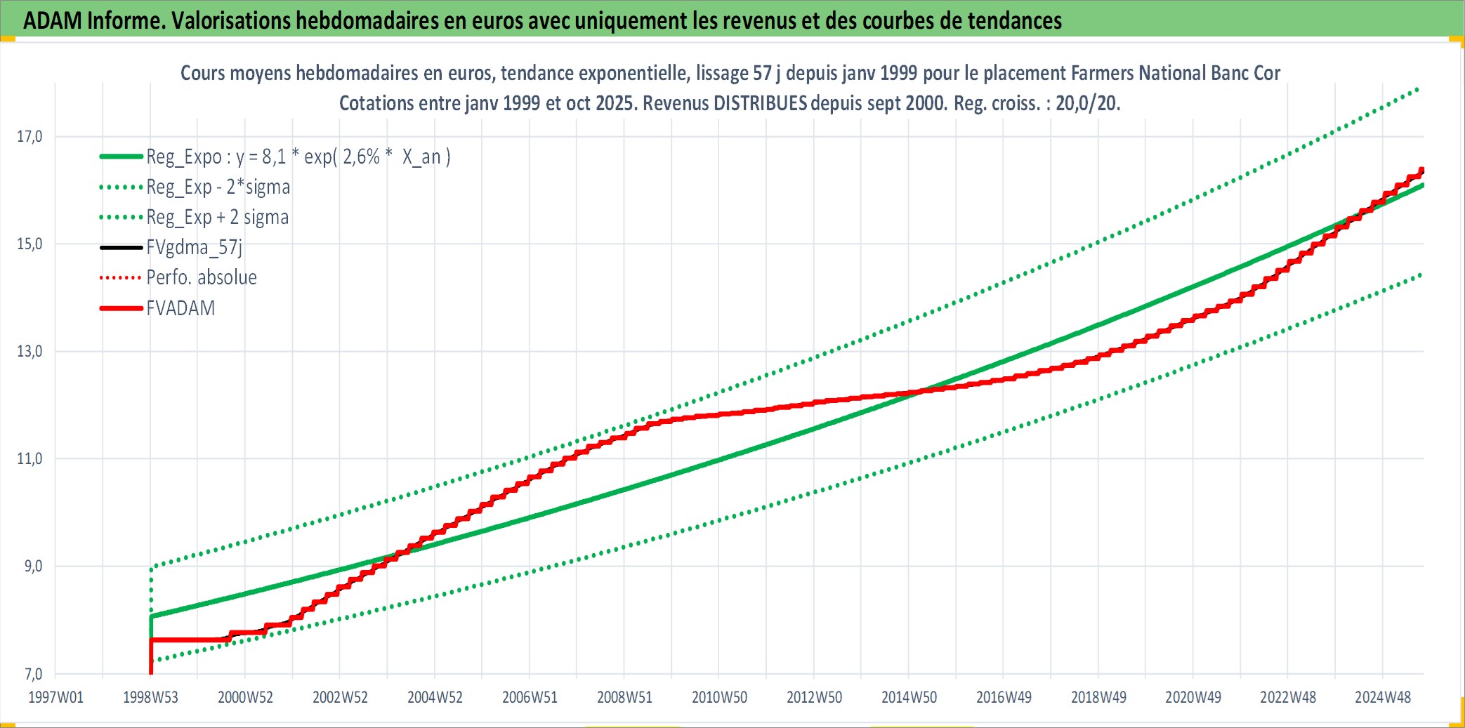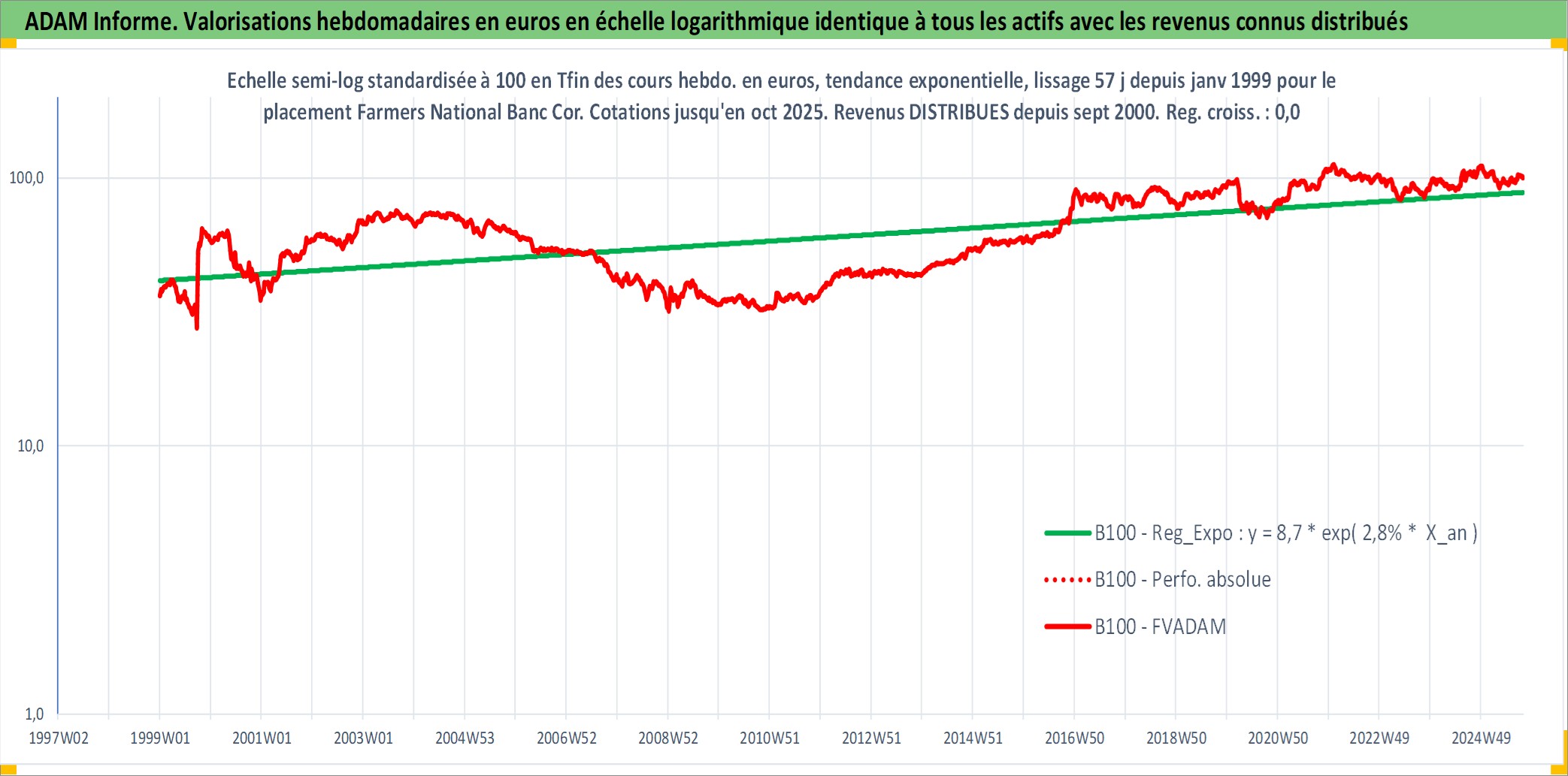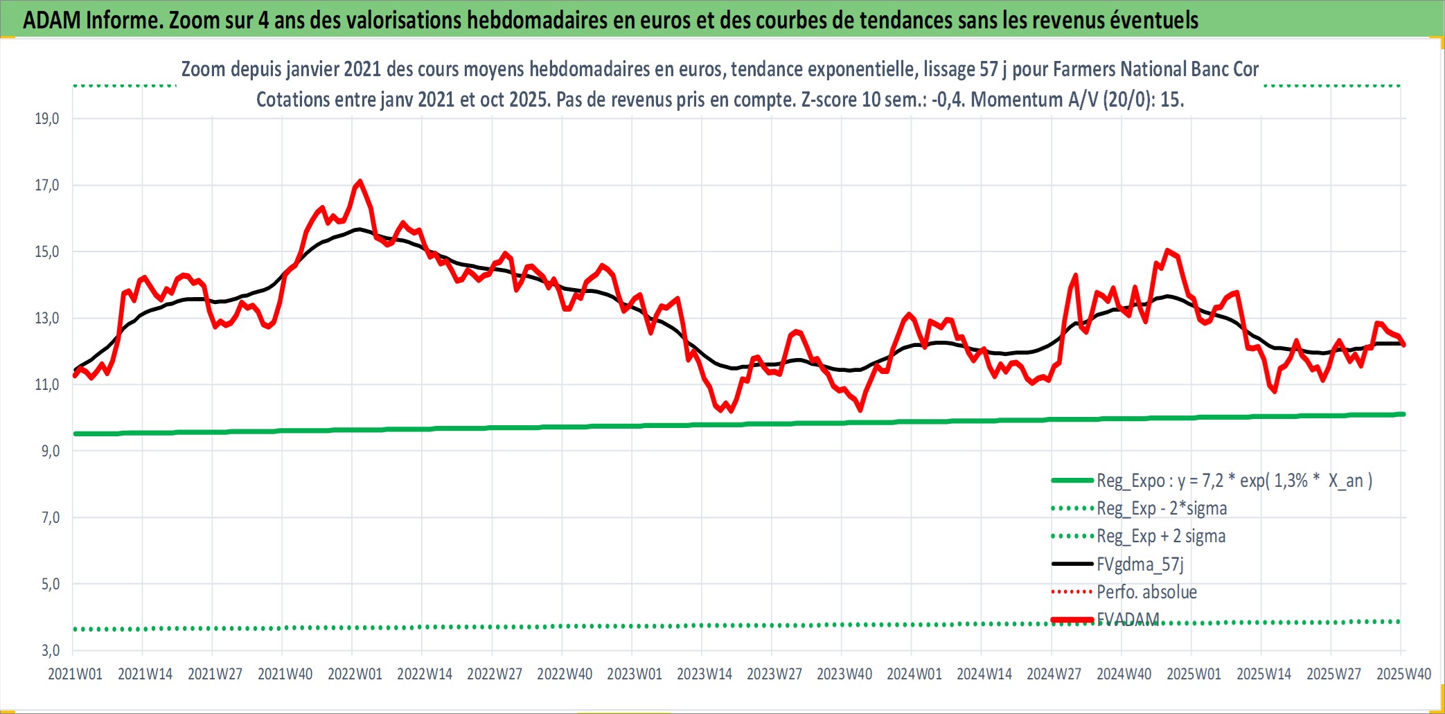 Site dédié aux investisseursPage dédiée sur site financeAnalyse des valorisations hebdomadaires de l'action Farmers National Banc Corp. Cet actif est cote en USD. Les valorisations sont en contrevaleur EURO et couvrent les semaines 1999W01 a 2025W40. Les revenus de cet actif financier sont pris en compte depuis la semaine 2000W36. La note ESG de cet actif n'est pas connue.