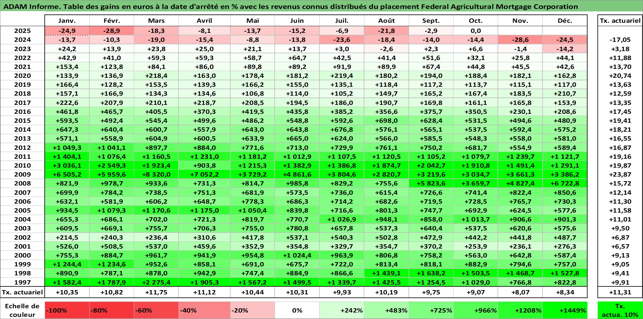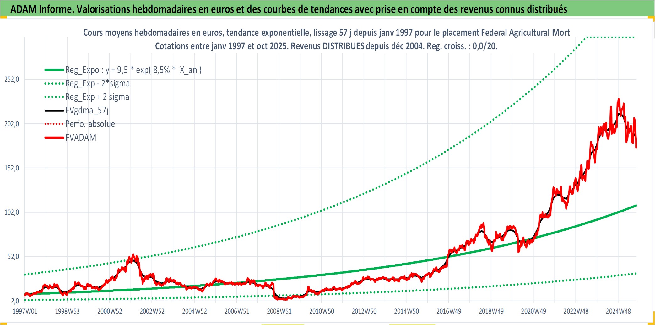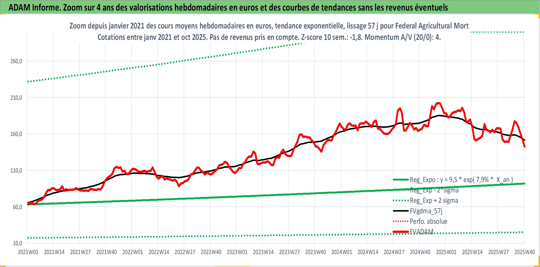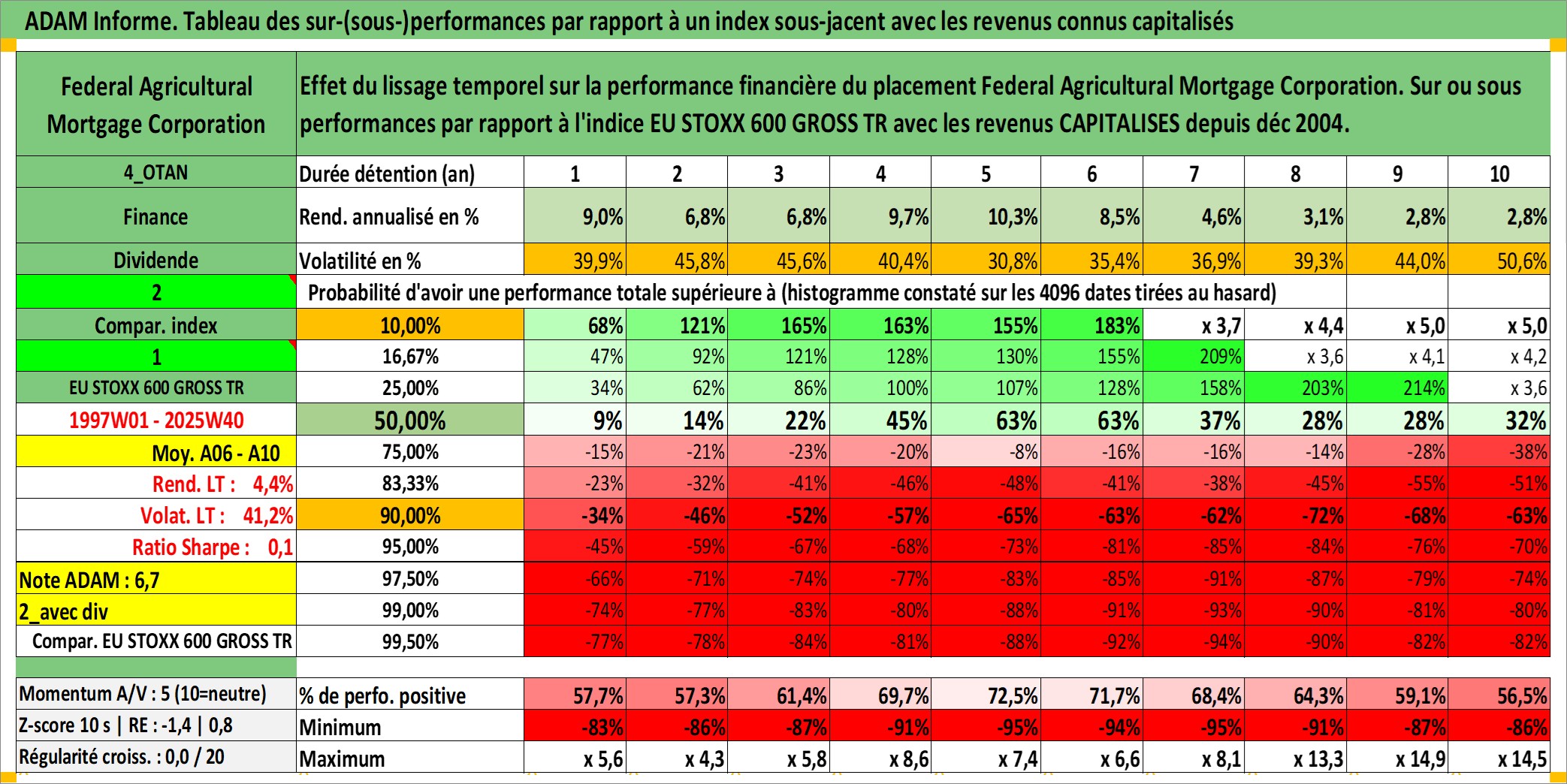 Site dédié aux investisseursPage dédiée sur site financeAnalyse des valorisations hebdomadaires de l'action Federal Agricultural Mortgage Corporation. Cet actif est cote en USD. Les valorisations sont en contrevaleur EURO et couvrent les semaines 1997W01 a 2025W40. Les revenus de cet actif financier sont pris en compte depuis la semaine 2004W51. La note ESG de cet actif n'est pas connue.