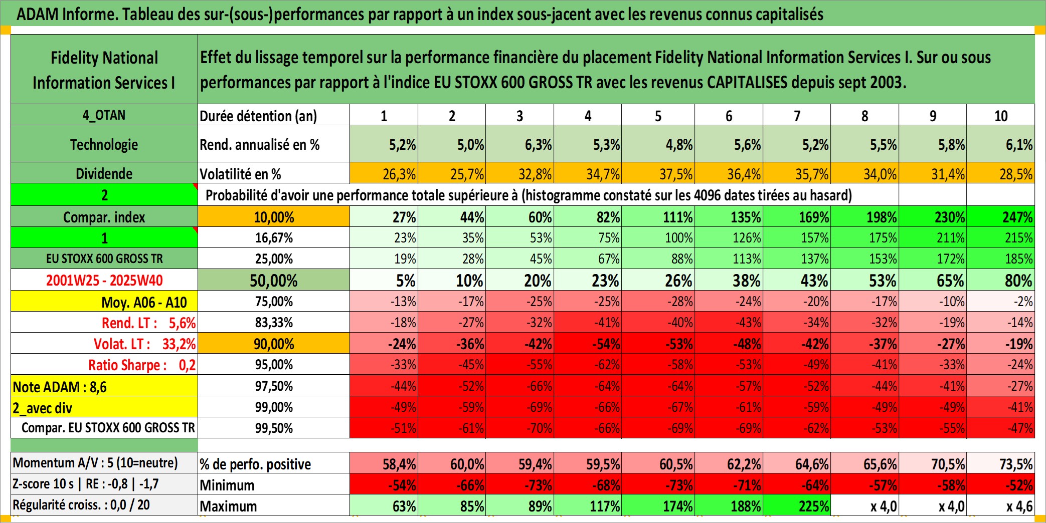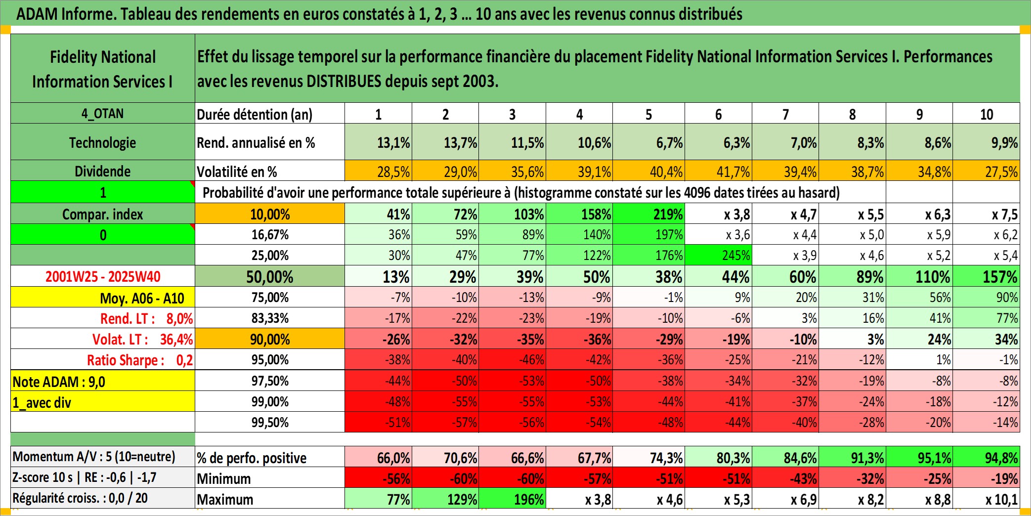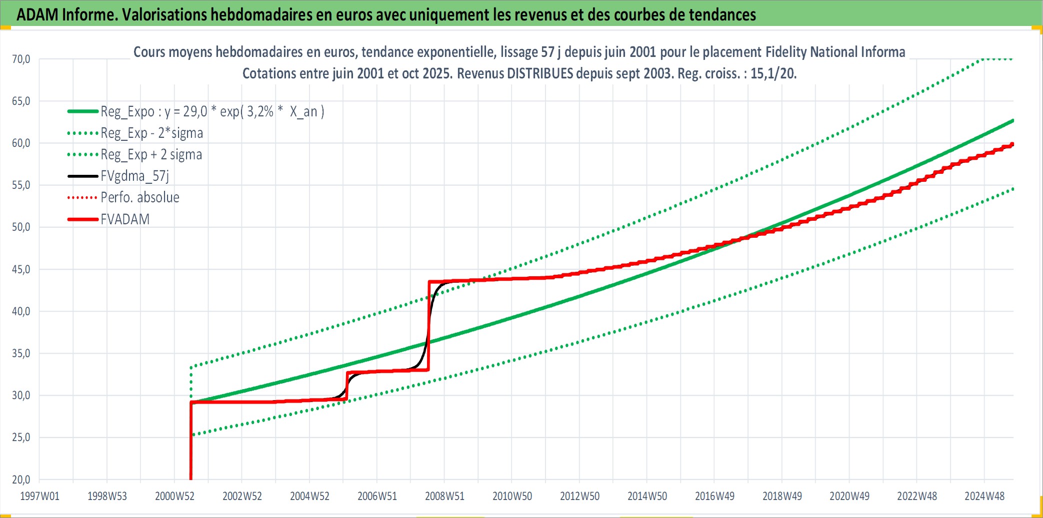 Site dédié aux investisseursPage dédiée sur site financeAnalyse des valorisations hebdomadaires de l'action Fidelity National Information Services I. Cet actif est cote en USD. Les valorisations sont en contrevaleur EURO et couvrent les semaines 2001W25 a 2025W40. Les revenus de cet actif financier sont pris en compte depuis la semaine 2003W40. La note globale ESG de cet actif est estimee a 11.0 (apres rebasage entre 0 et 20).