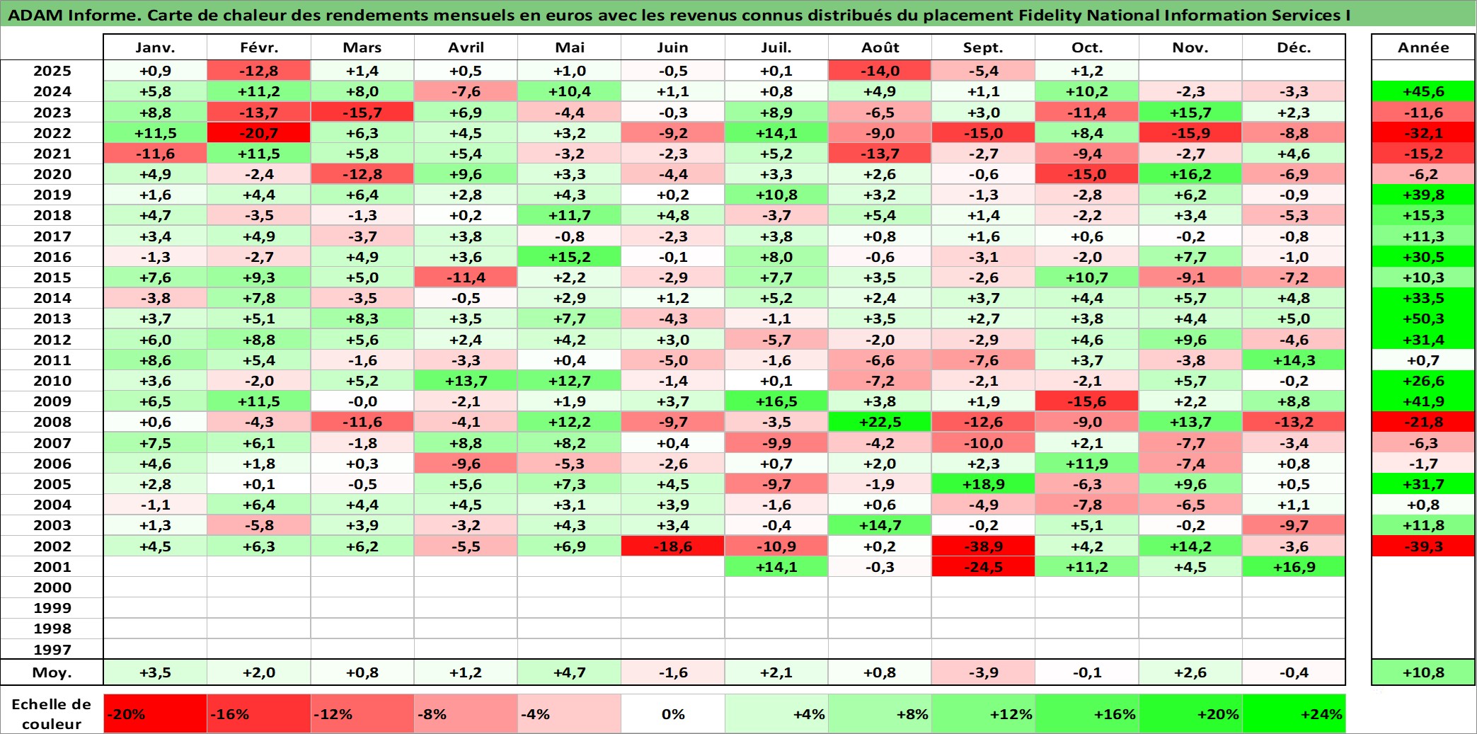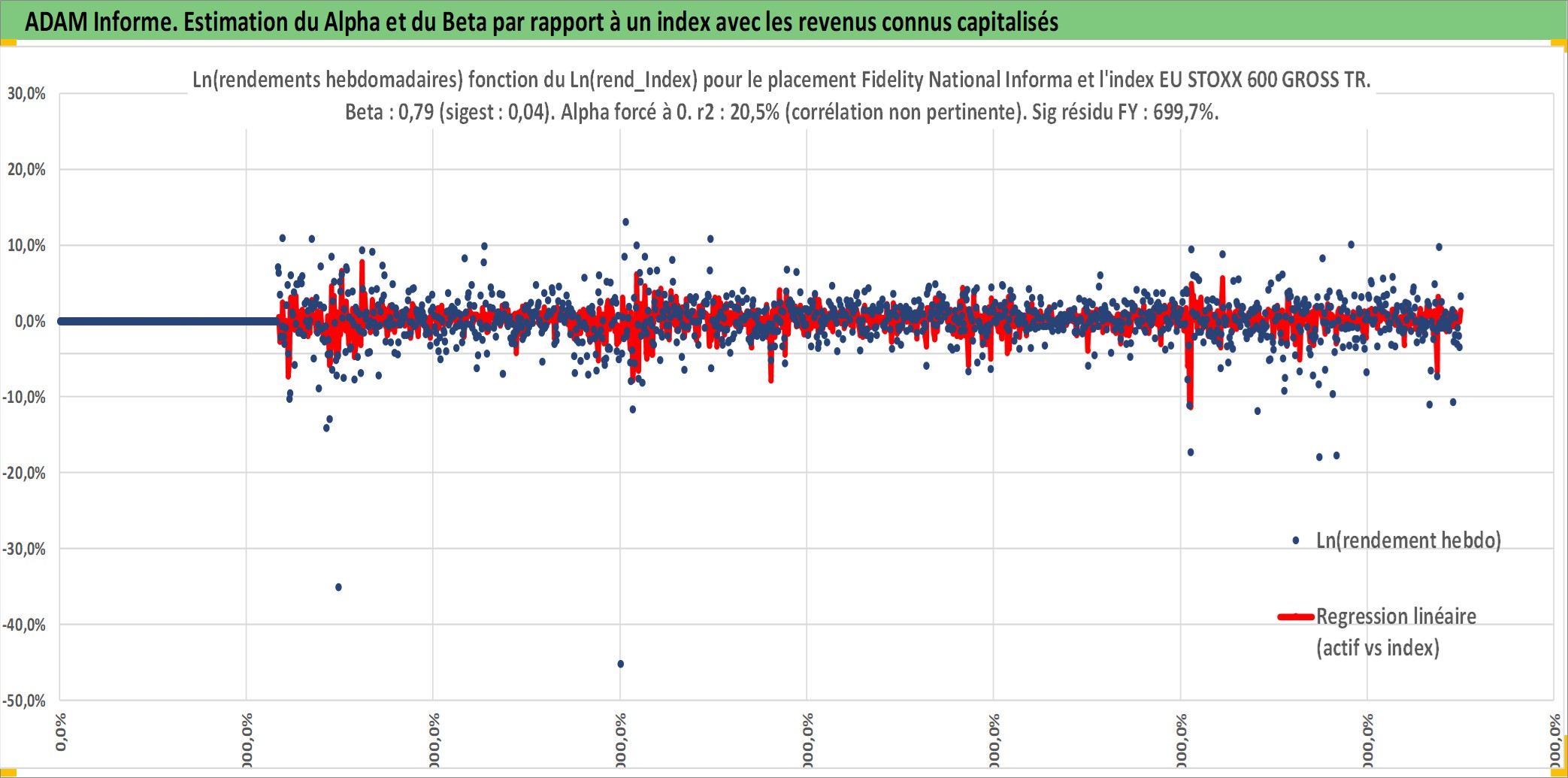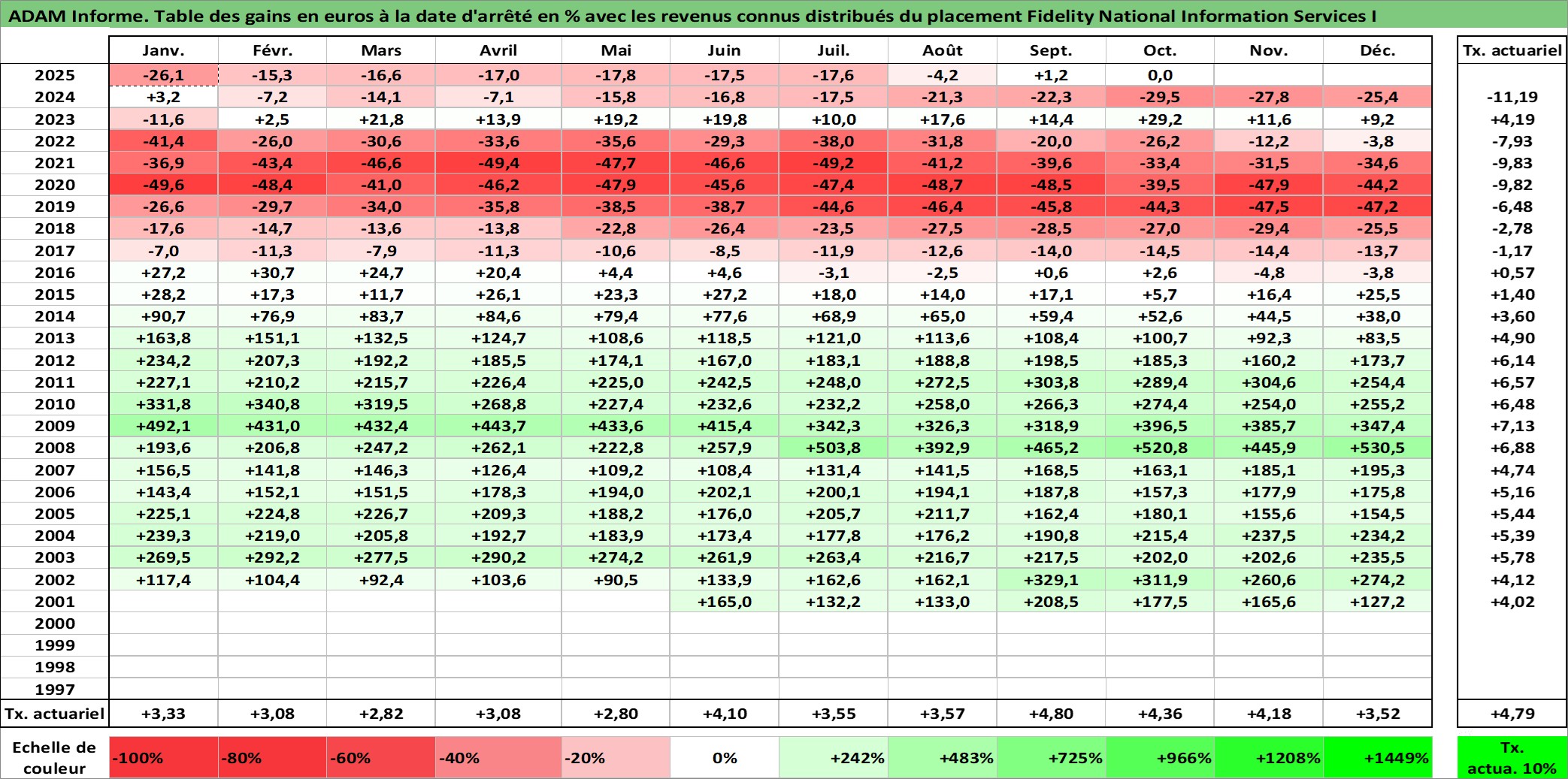 Site dédié aux investisseursPage dédiée sur site financeAnalyse des valorisations hebdomadaires de l'action Fidelity National Information Services I. Cet actif est cote en USD. Les valorisations sont en contrevaleur EURO et couvrent les semaines 2001W25 a 2025W40. Les revenus de cet actif financier sont pris en compte depuis la semaine 2003W40. La note globale ESG de cet actif est estimee a 11.0 (apres rebasage entre 0 et 20).