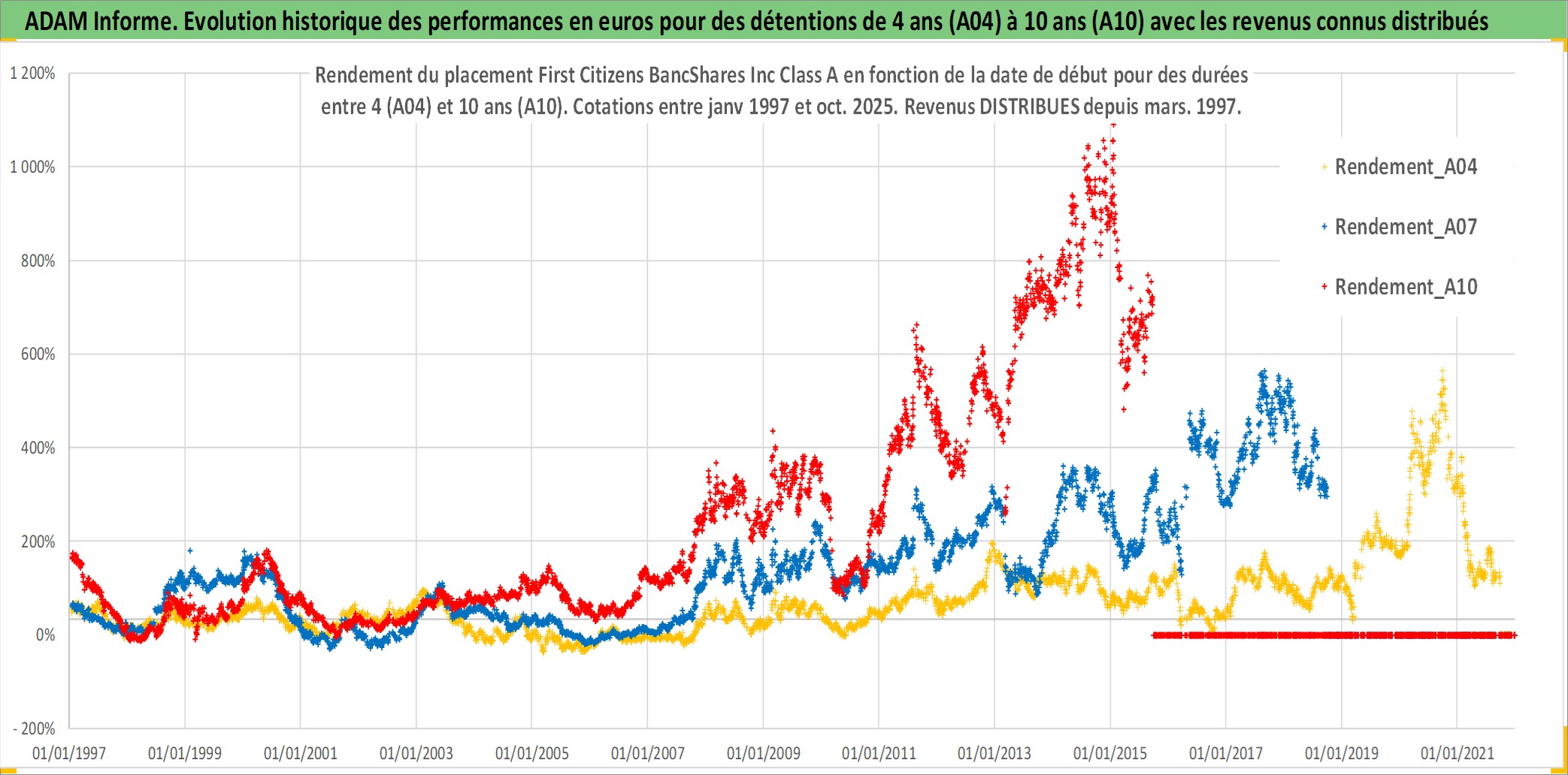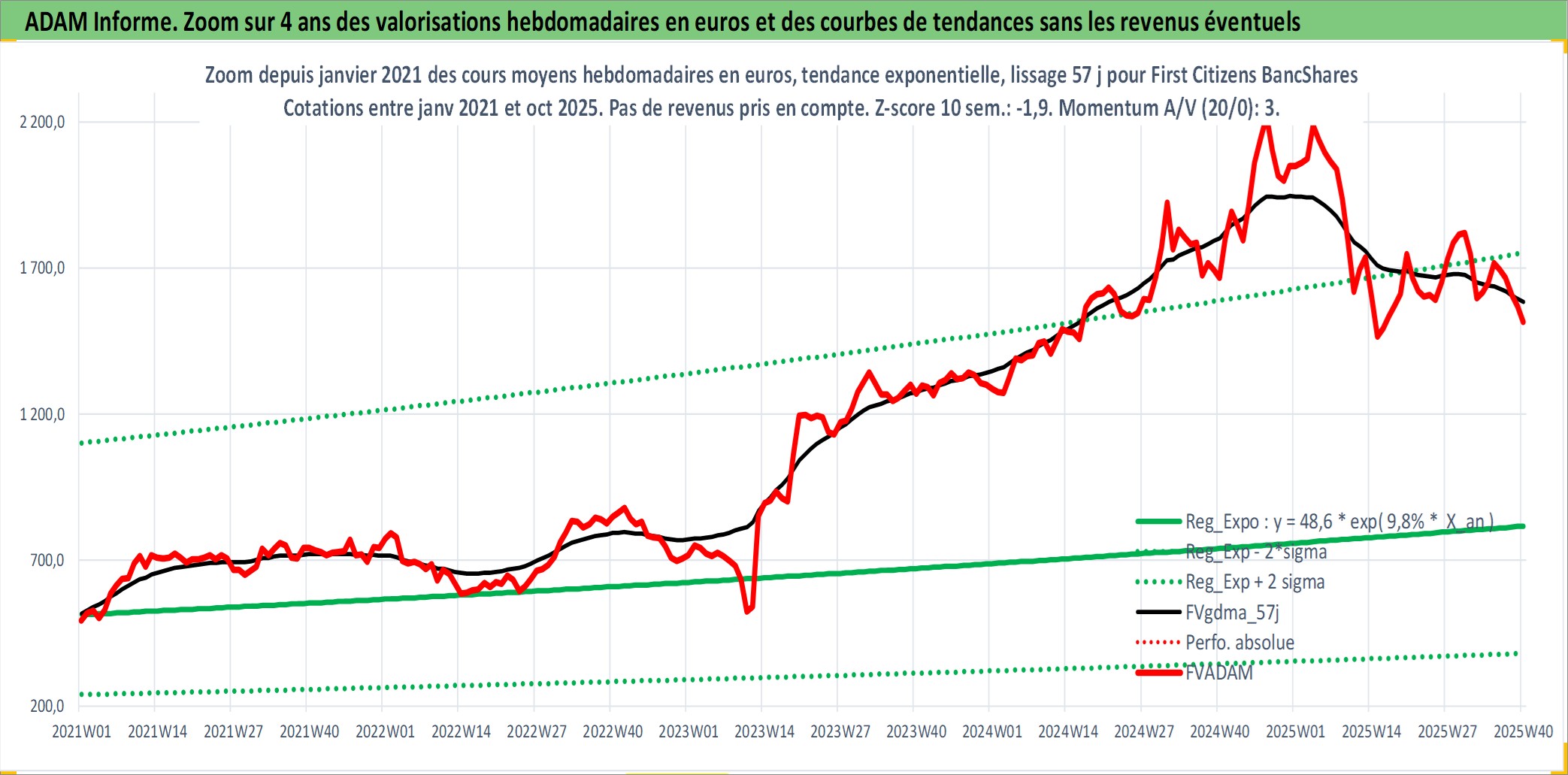 Site dédié aux investisseursPage dédiée sur site financeAnalyse des valorisations hebdomadaires de l'action First Citizens BancShares Inc Class A. Cet actif est cote en USD. Les valorisations sont en contrevaleur EURO et couvrent les semaines 1997W01 a 2025W40. Les revenus de cet actif financier sont pris en compte depuis la semaine 1997W11. La note ESG de cet actif n'est pas connue.