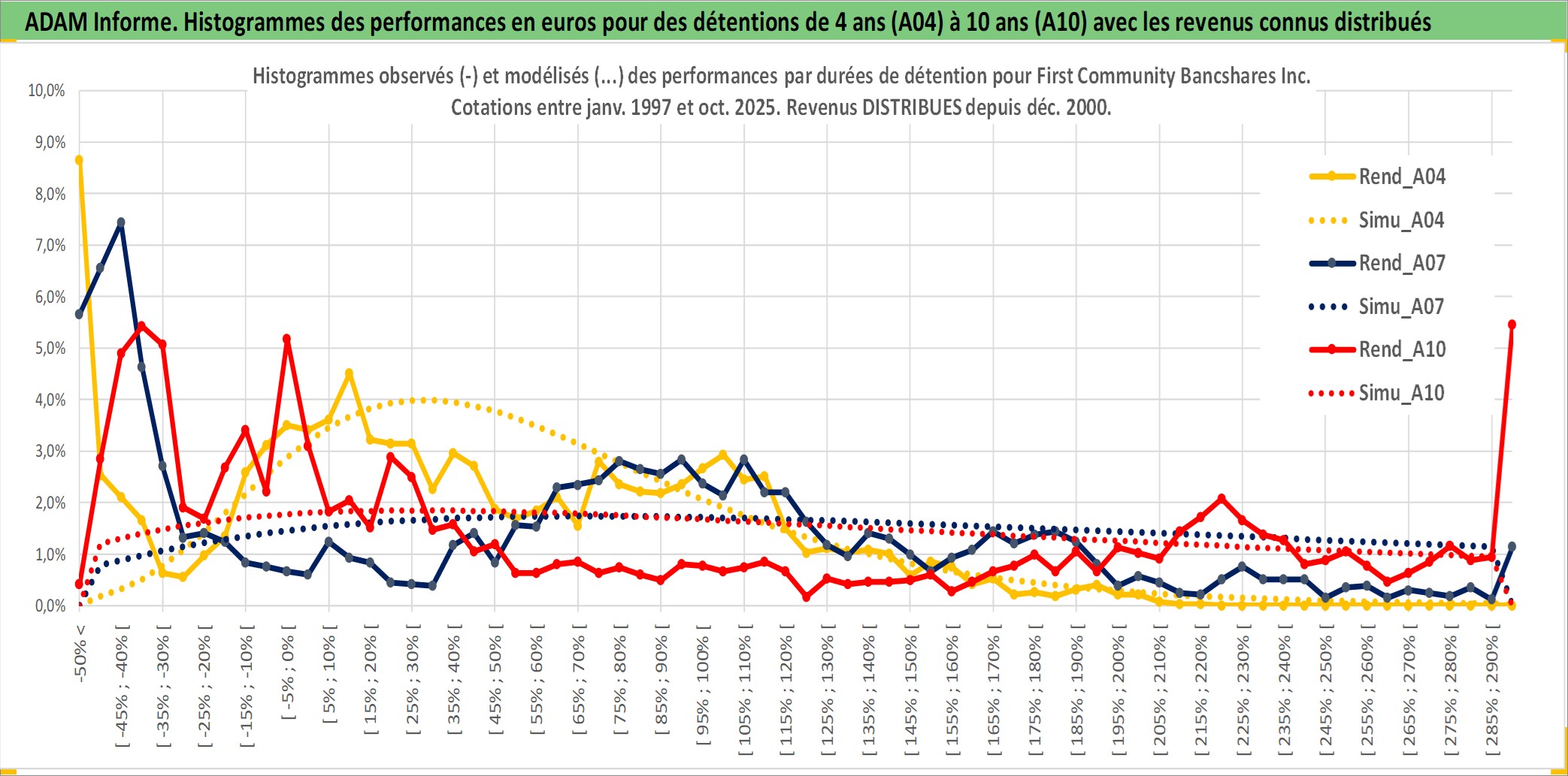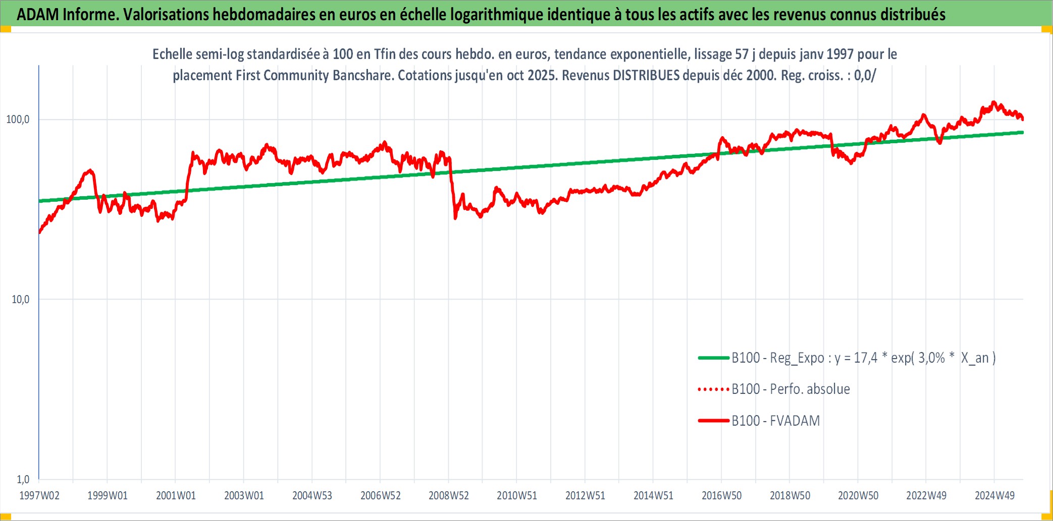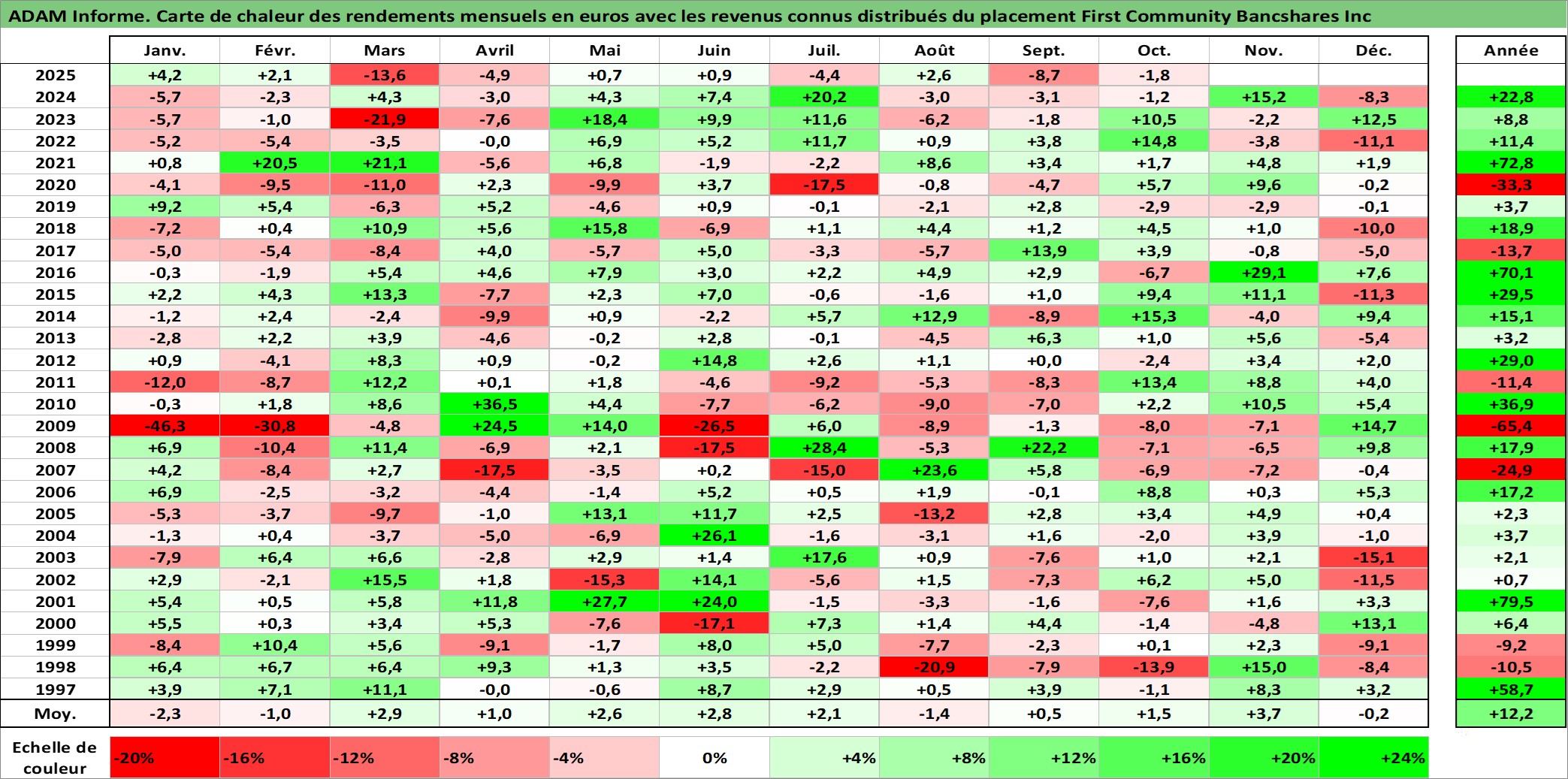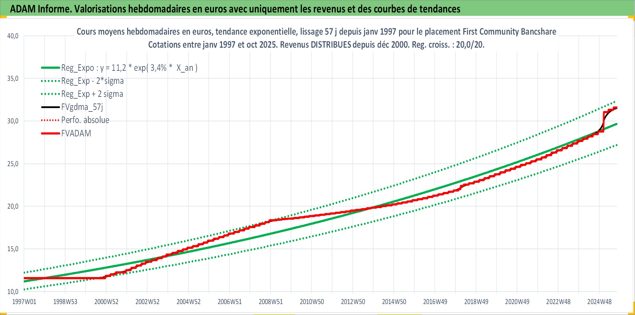 Site dédié aux investisseursPage dédiée sur site financeAnalyse des valorisations hebdomadaires de l'action First Community Bancshares Inc. Cet actif est cote en USD. Les valorisations sont en contrevaleur EURO et couvrent les semaines 1997W01 a 2025W40. Les revenus de cet actif financier sont pris en compte depuis la semaine 2000W50. La note ESG de cet actif n'est pas connue.
