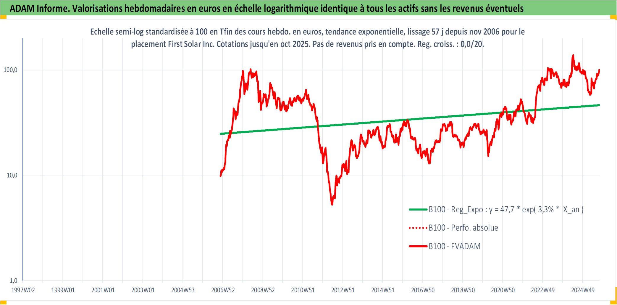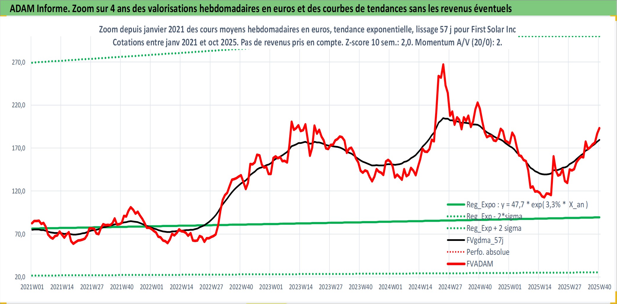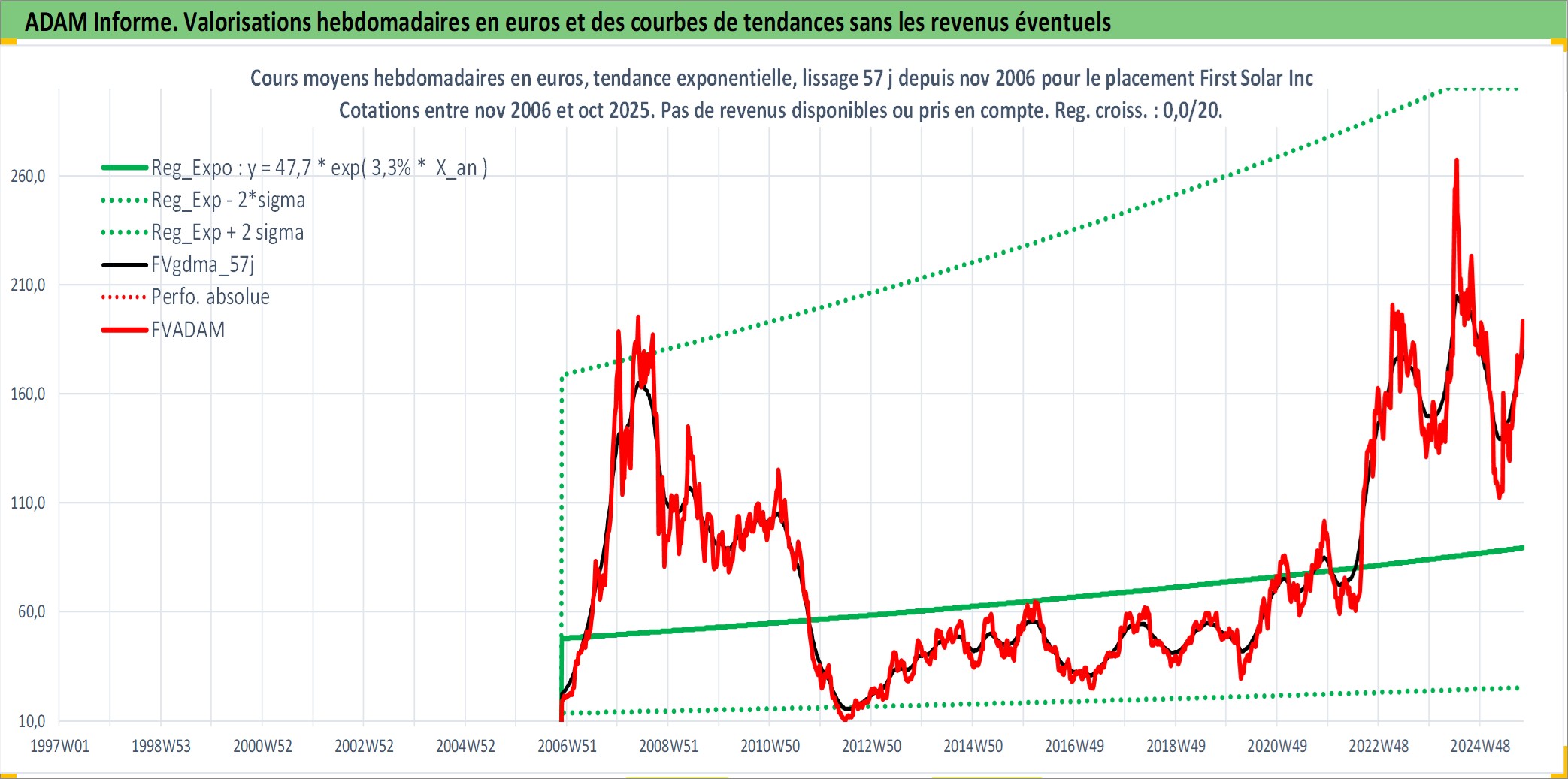 Site dédié aux investisseursPage dédiée sur site financeAnalyse des valorisations hebdomadaires de l'action First Solar Inc. Cet actif est cote en USD. Les valorisations sont en contrevaleur EURO et couvrent les semaines 2006W46 a 2025W40. Les revenus de cet actif financier ne sont pas connus car non existants ou non disponibles sur le site Yahoo Finance. La note ESG de cet actif n'est pas connue.