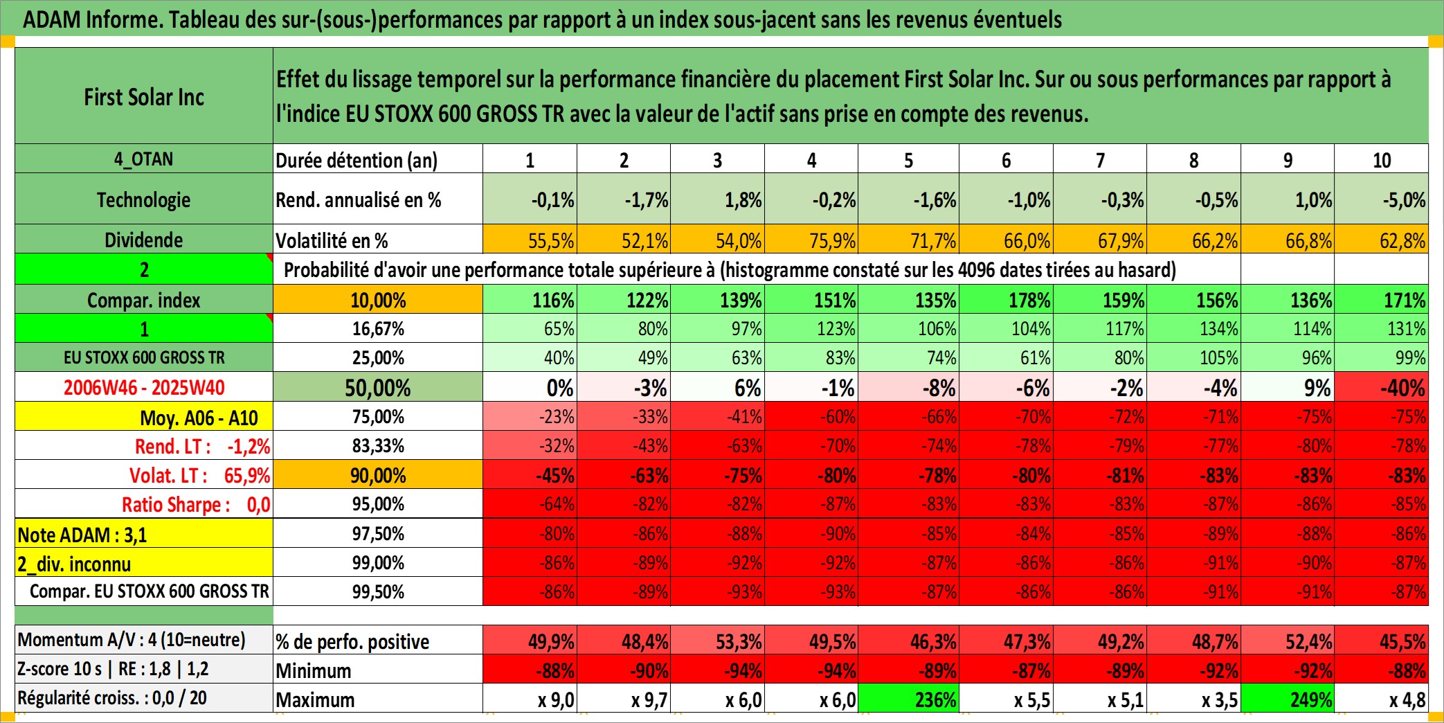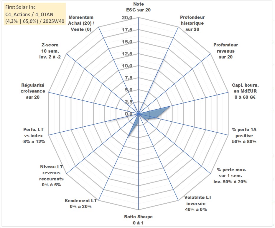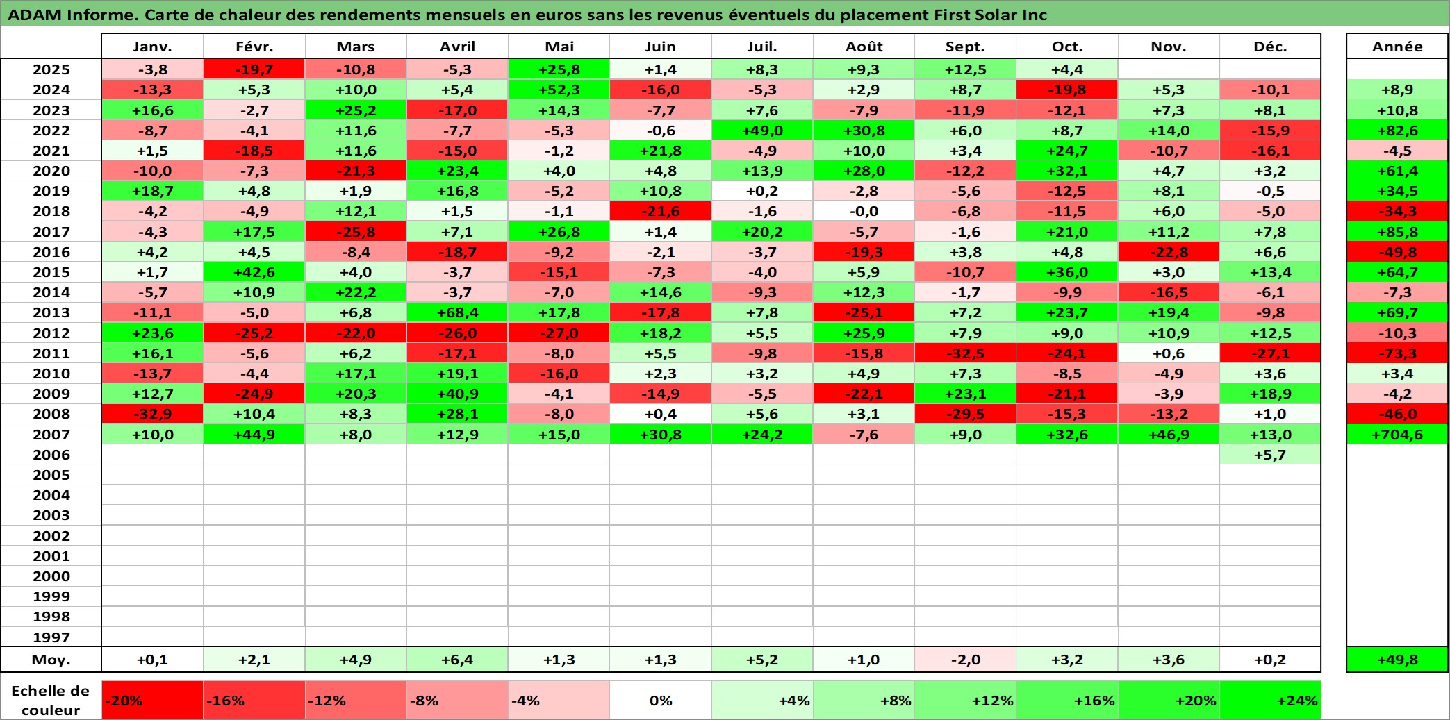 Site dédié aux investisseursPage dédiée sur site financeAnalyse des valorisations hebdomadaires de l'action First Solar Inc. Cet actif est cote en USD. Les valorisations sont en contrevaleur EURO et couvrent les semaines 2006W46 a 2025W40. Les revenus de cet actif financier ne sont pas connus car non existants ou non disponibles sur le site Yahoo Finance. La note ESG de cet actif n'est pas connue.