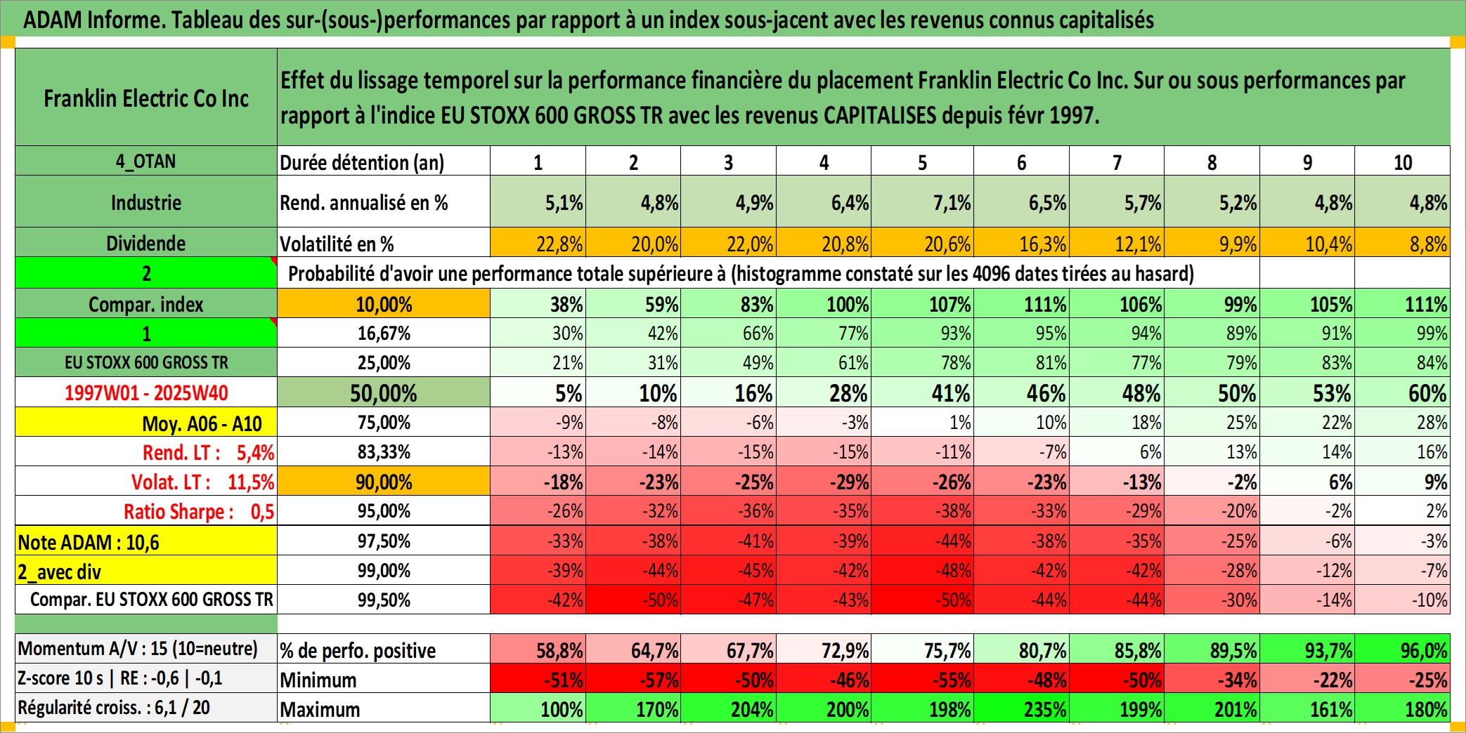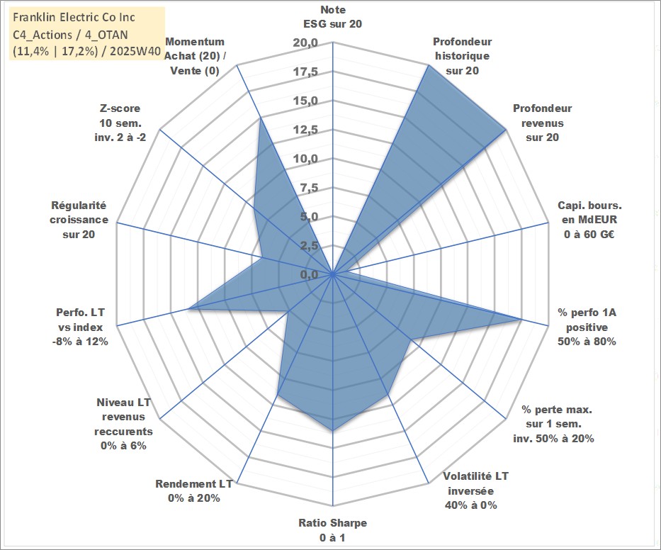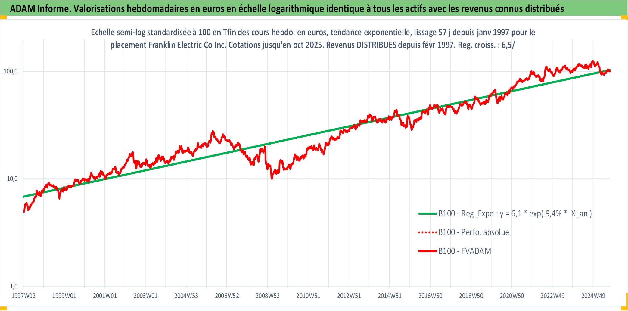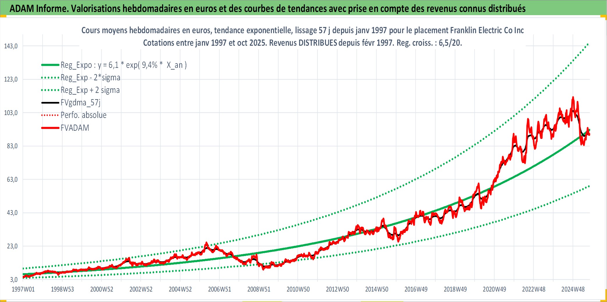 Site dédié aux investisseursPage dédiée sur site financeAnalyse des valorisations hebdomadaires de l'action Franklin Electric Co Inc. Cet actif est cote en USD. Les valorisations sont en contrevaleur EURO et couvrent les semaines 1997W01 a 2025W40. Les revenus de cet actif financier sont pris en compte depuis la semaine 1997W07. La note ESG de cet actif n'est pas connue.
