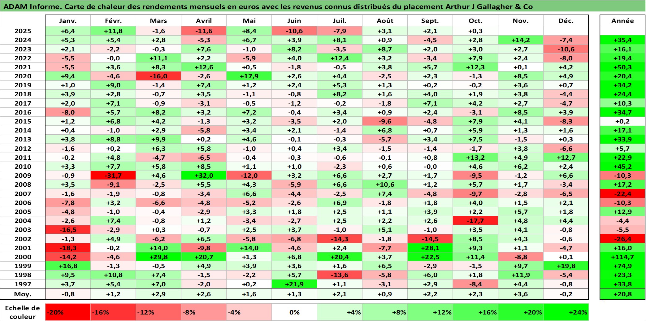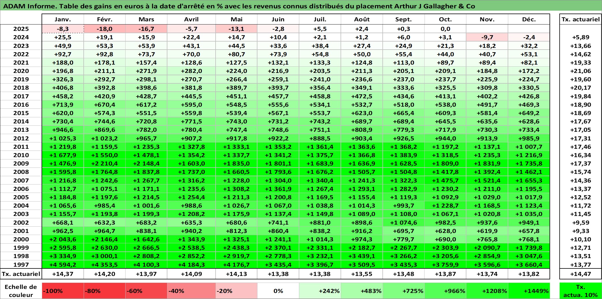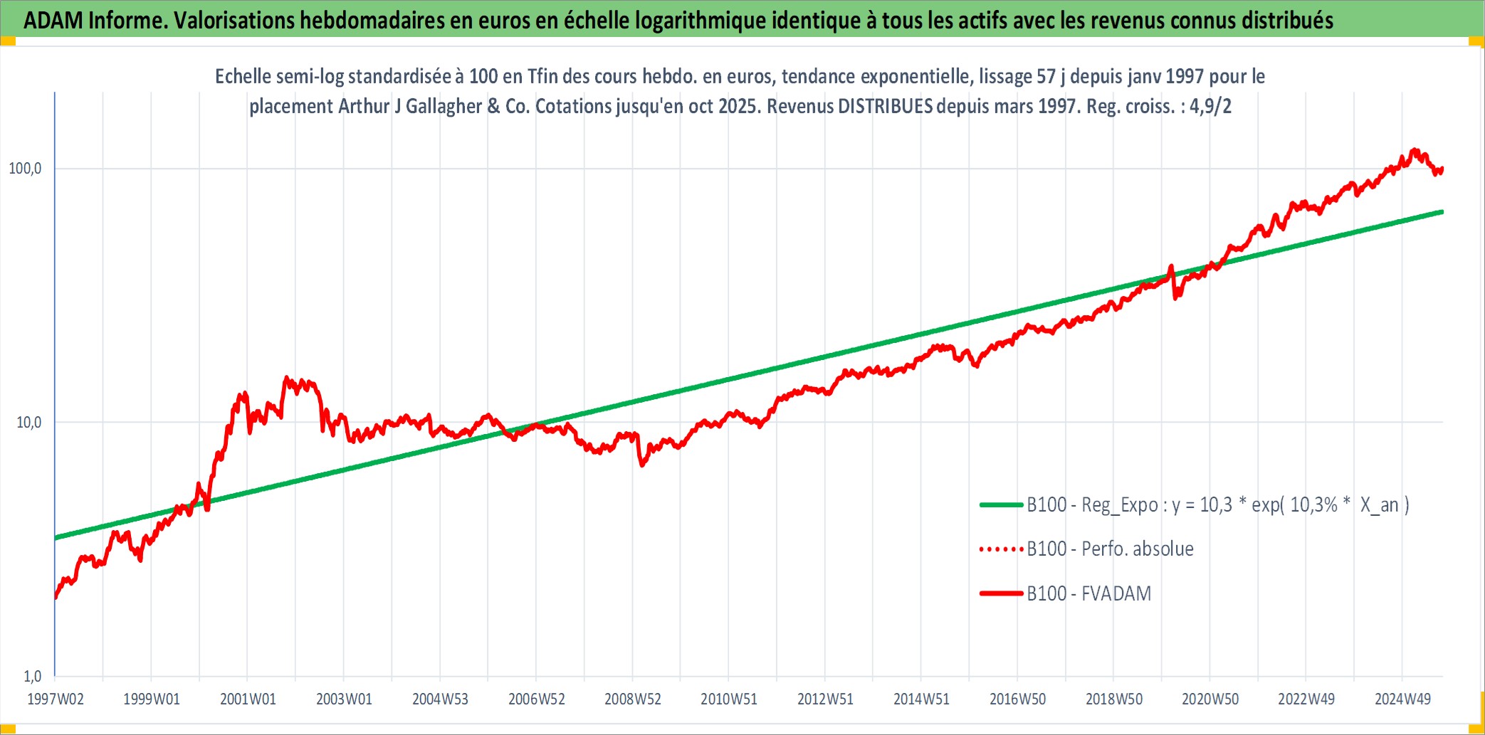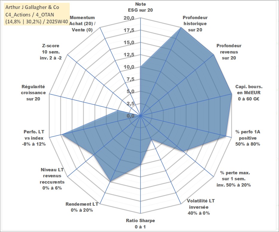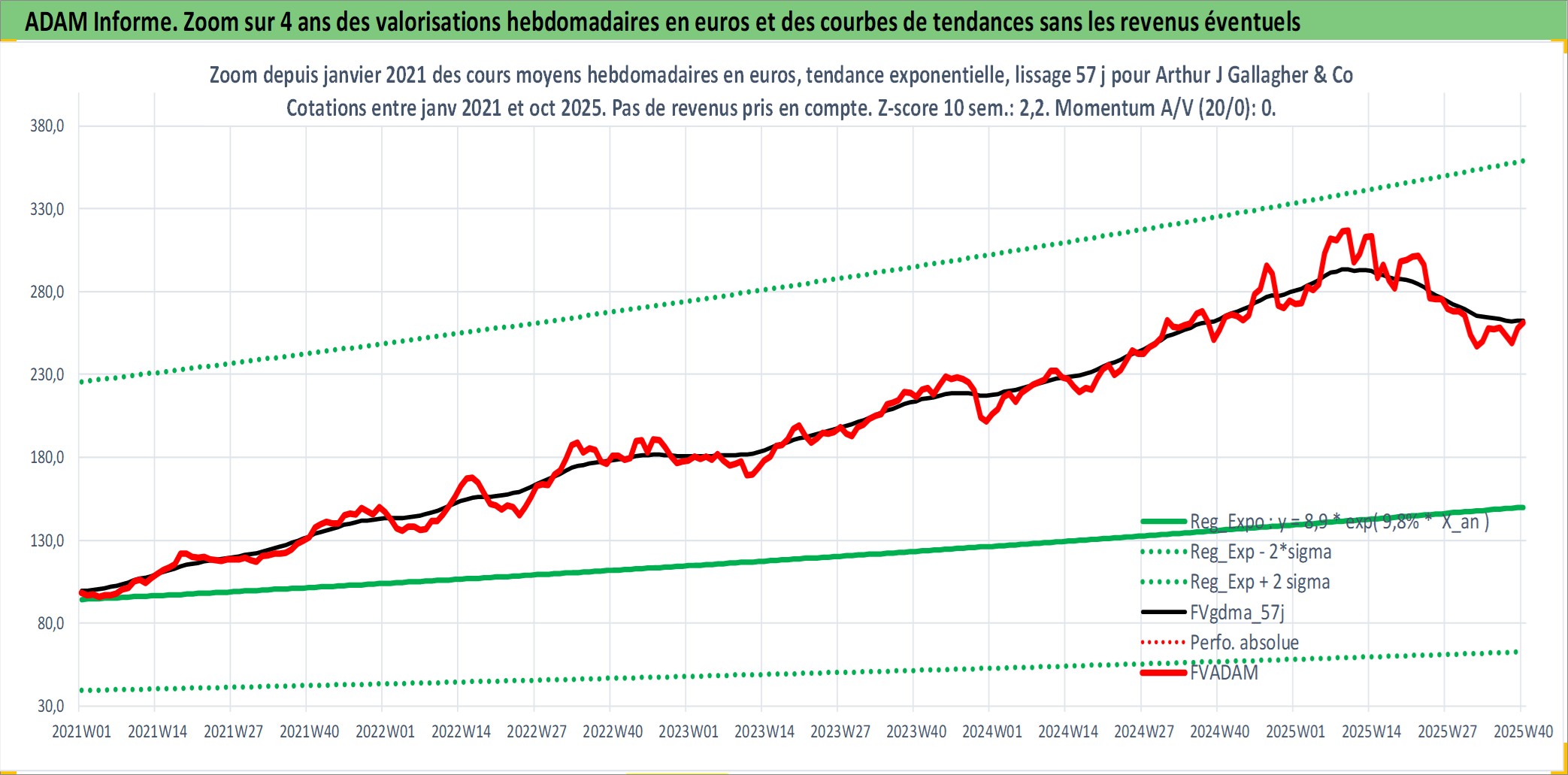 Site dédié aux investisseursPage dédiée sur site financeAnalyse des valorisations hebdomadaires de l'action Arthur J Gallagher & Co. Cet actif est cote en USD. Les valorisations sont en contrevaleur EURO et couvrent les semaines 1997W01 a 2025W40. Les revenus de cet actif financier sont pris en compte depuis la semaine 1997W13. La note globale ESG de cet actif est estimee a 10.0 (apres rebasage entre 0 et 20).