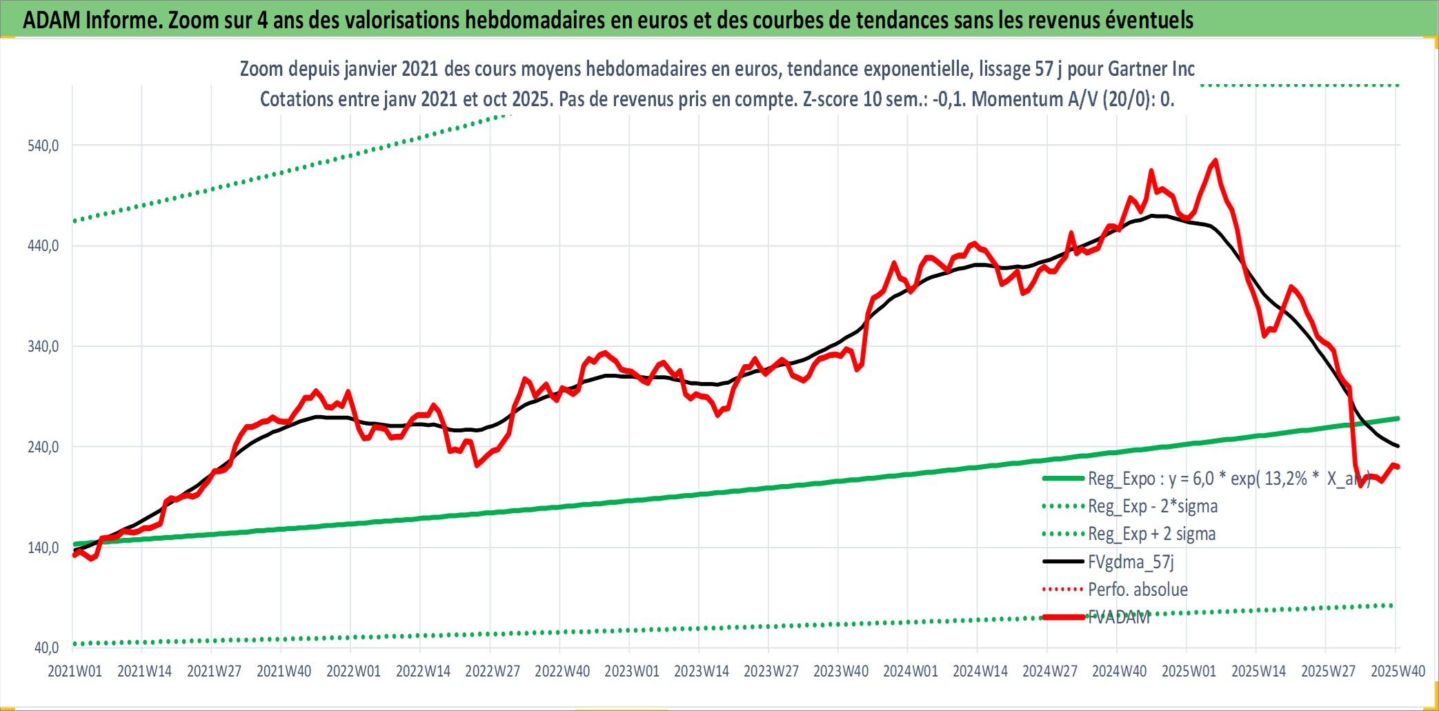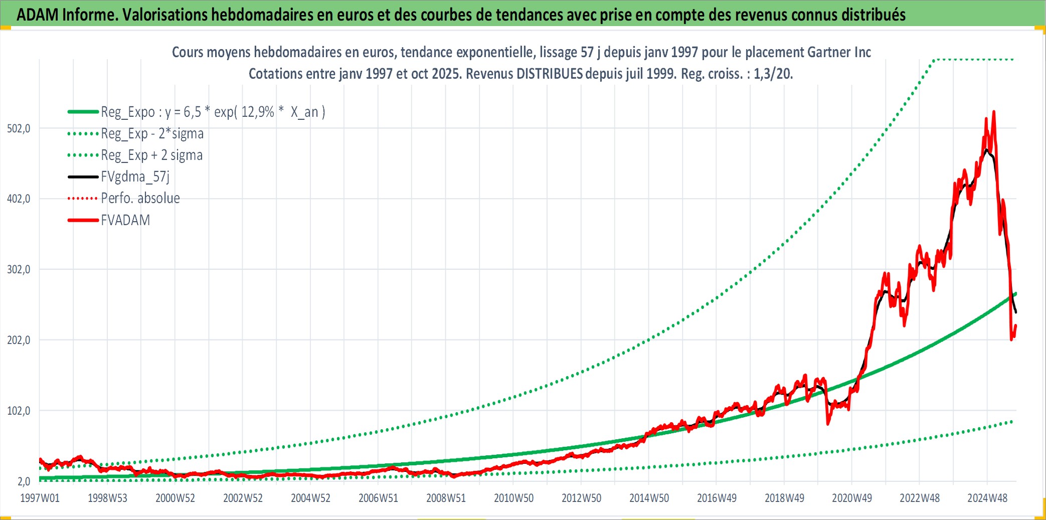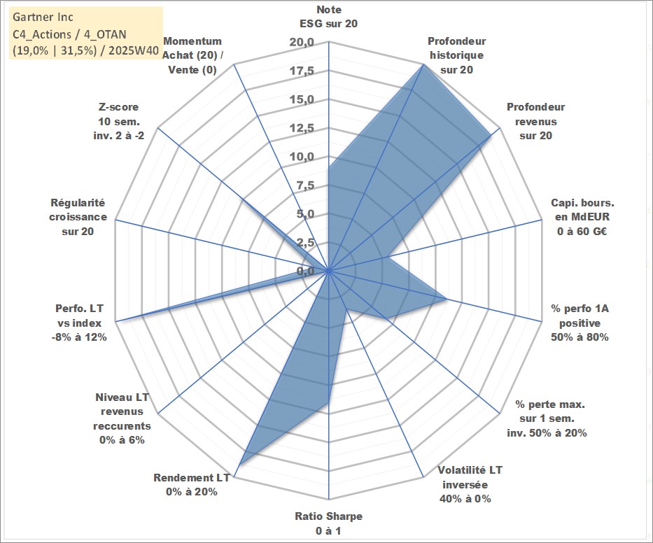 Site dédié aux investisseursPage dédiée sur site financeAnalyse des valorisations hebdomadaires de l'action Gartner Inc. Cet actif est cote en USD. Les valorisations sont en contrevaleur EURO et couvrent les semaines 1997W01 a 2025W40. Les revenus de cet actif financier sont pris en compte depuis la semaine 1999W29. La note globale ESG de cet actif est estimee a 9.0 (apres rebasage entre 0 et 20).