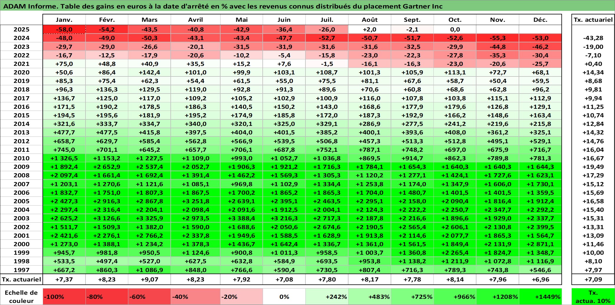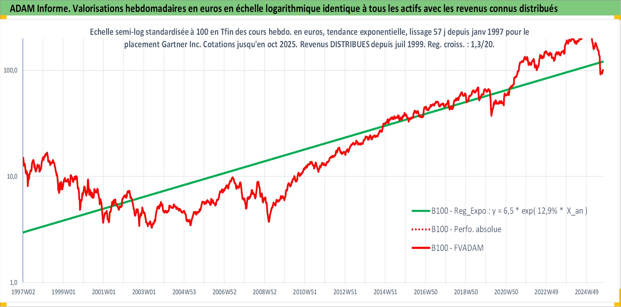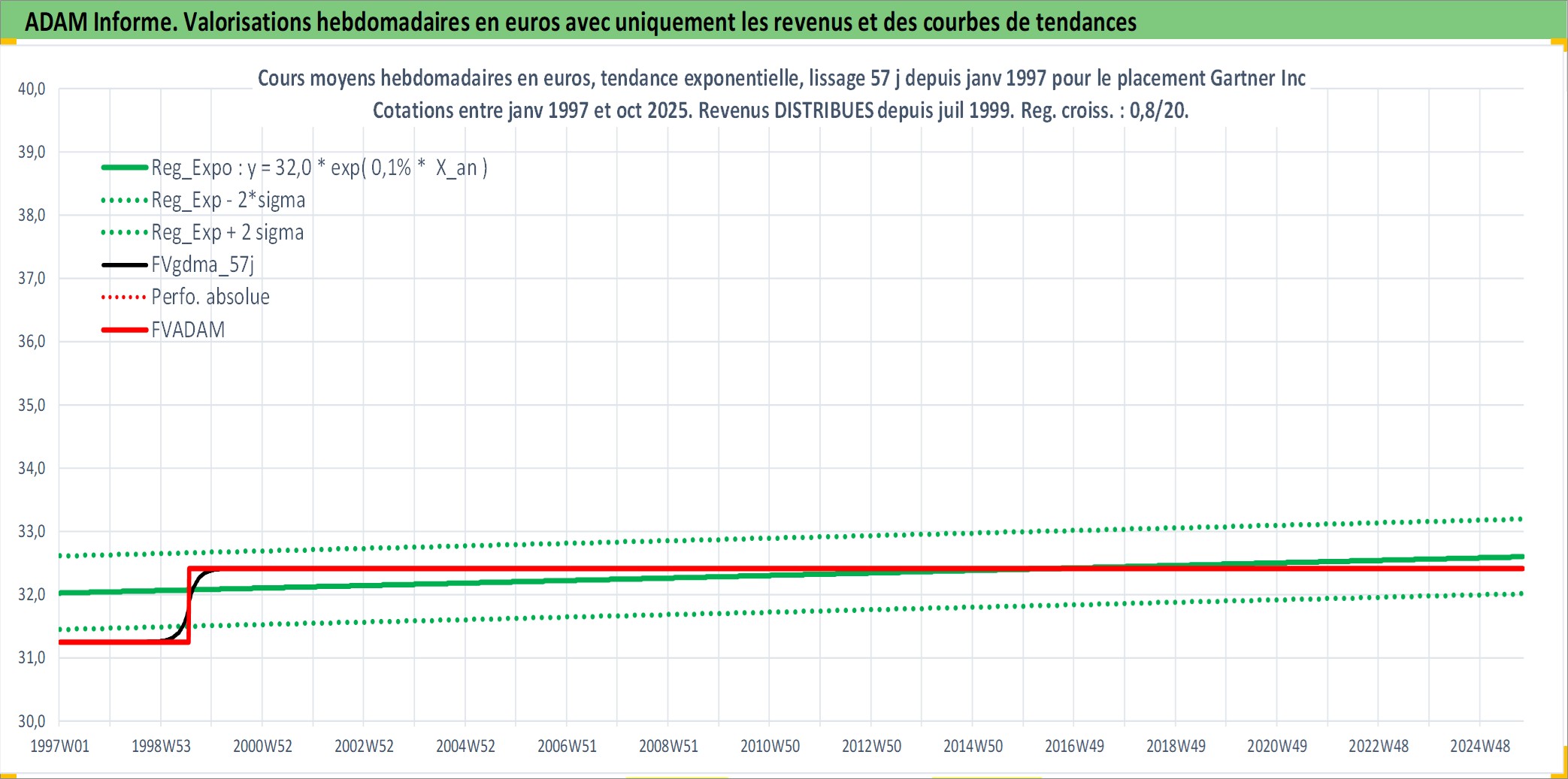 Site dédié aux investisseursPage dédiée sur site financeAnalyse des valorisations hebdomadaires de l'action Gartner Inc. Cet actif est cote en USD. Les valorisations sont en contrevaleur EURO et couvrent les semaines 1997W01 a 2025W40. Les revenus de cet actif financier sont pris en compte depuis la semaine 1999W29. La note globale ESG de cet actif est estimee a 9.0 (apres rebasage entre 0 et 20).