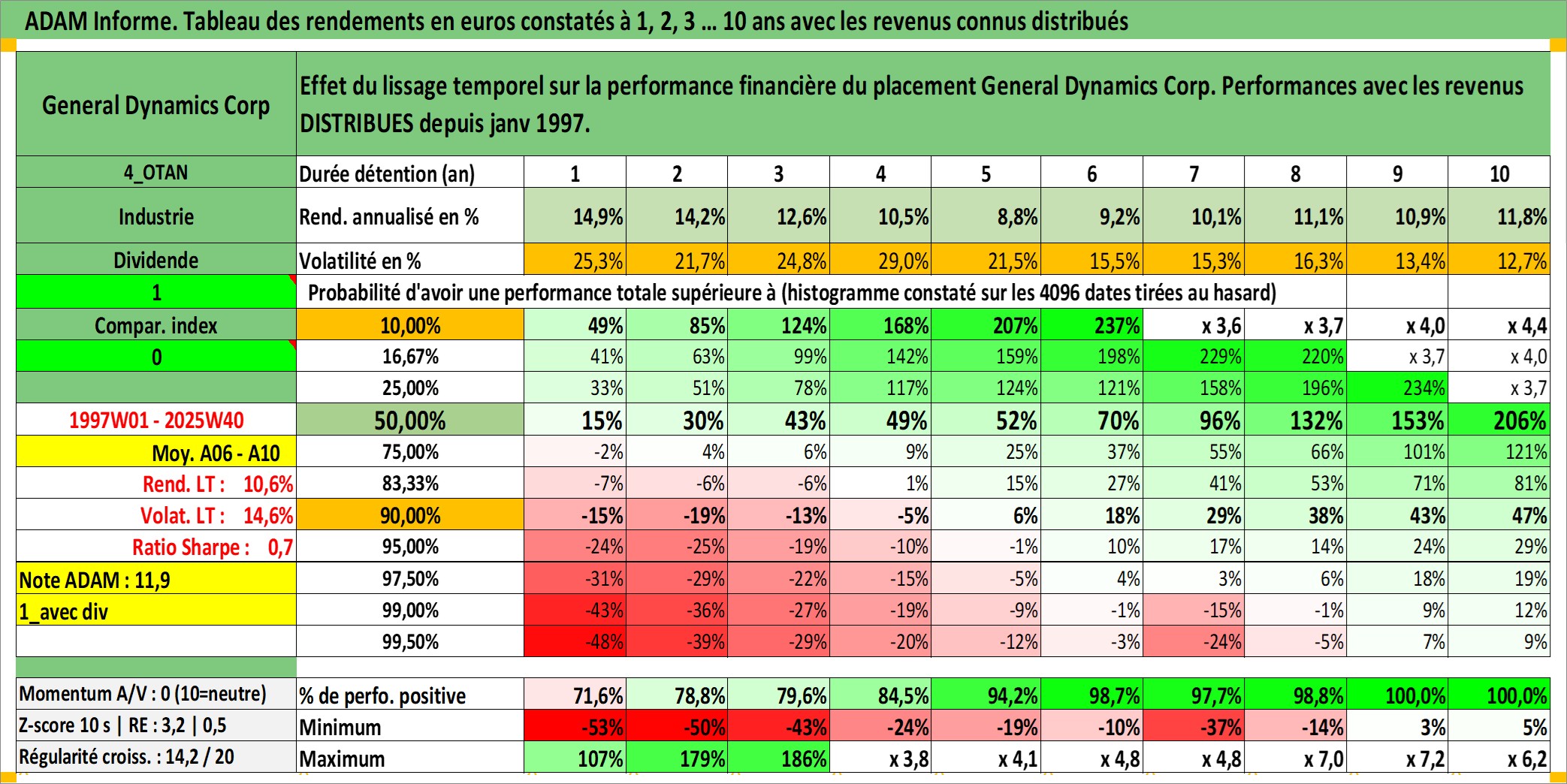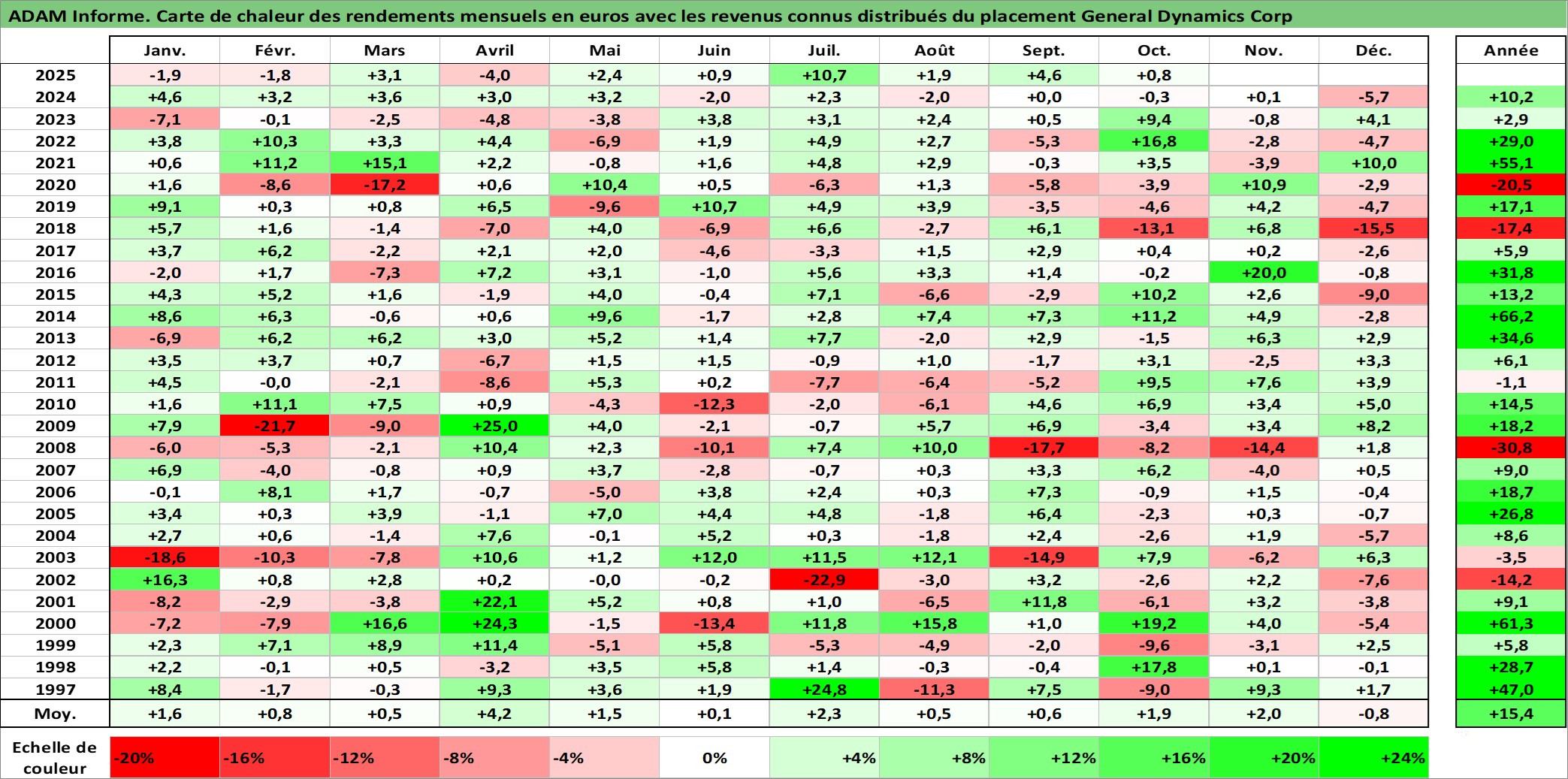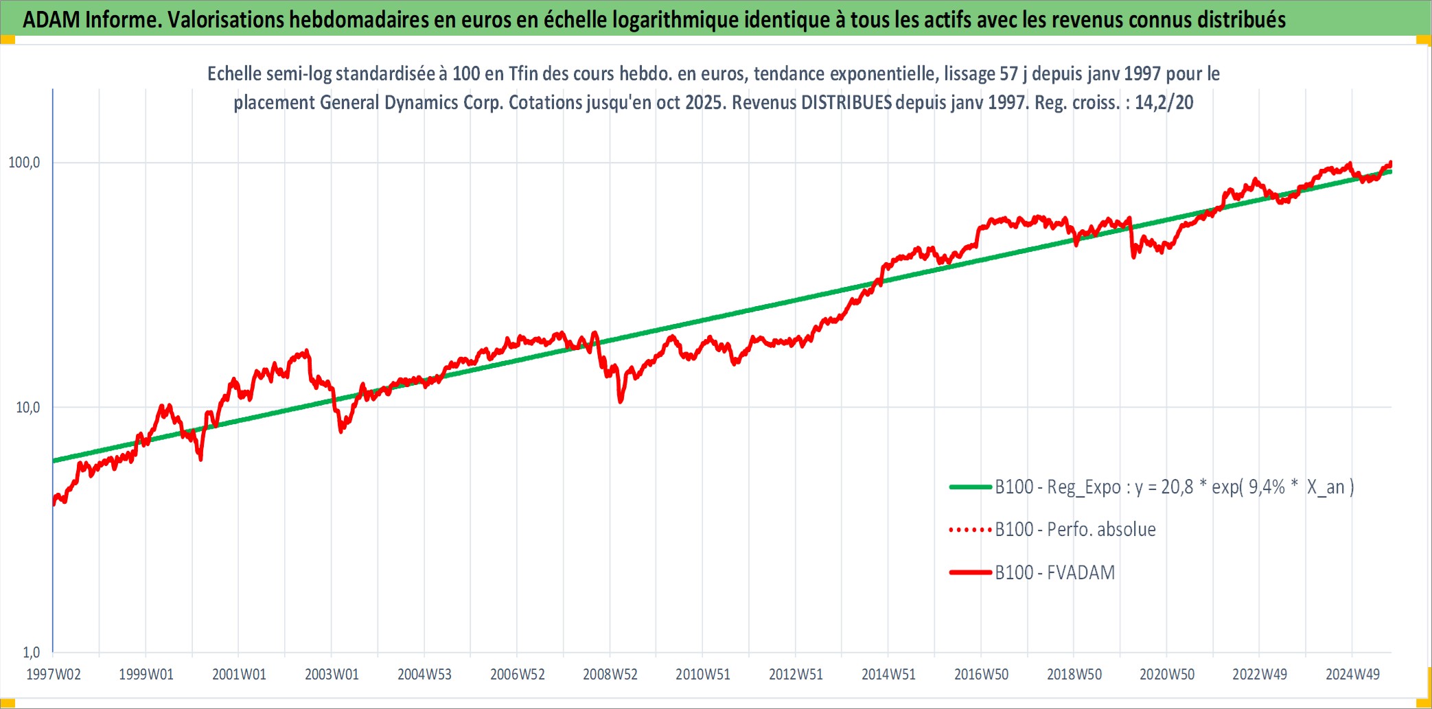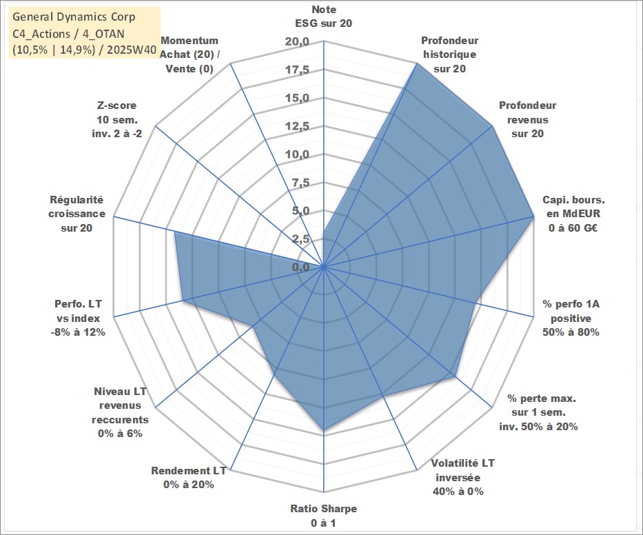 Site dédié aux investisseursPage dédiée sur site financeAnalyse des valorisations hebdomadaires de l'action General Dynamics Corp. Cet actif est cote en USD. Les valorisations sont en contrevaleur EURO et couvrent les semaines 1997W01 a 2025W40. Les revenus de cet actif financier sont pris en compte depuis la semaine 1997W04. La note globale ESG de cet actif est estimee a 3.0 (apres rebasage entre 0 et 20).