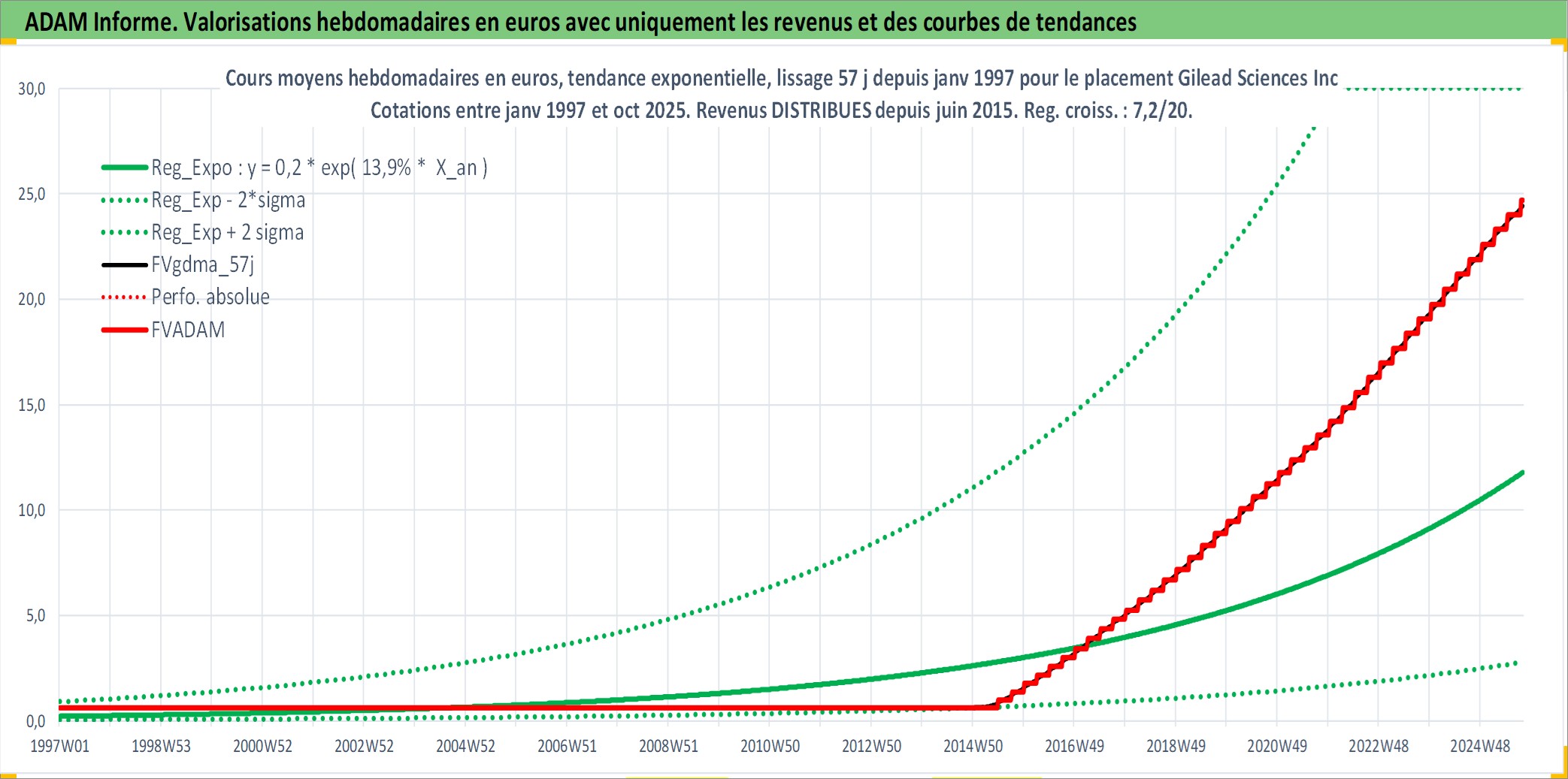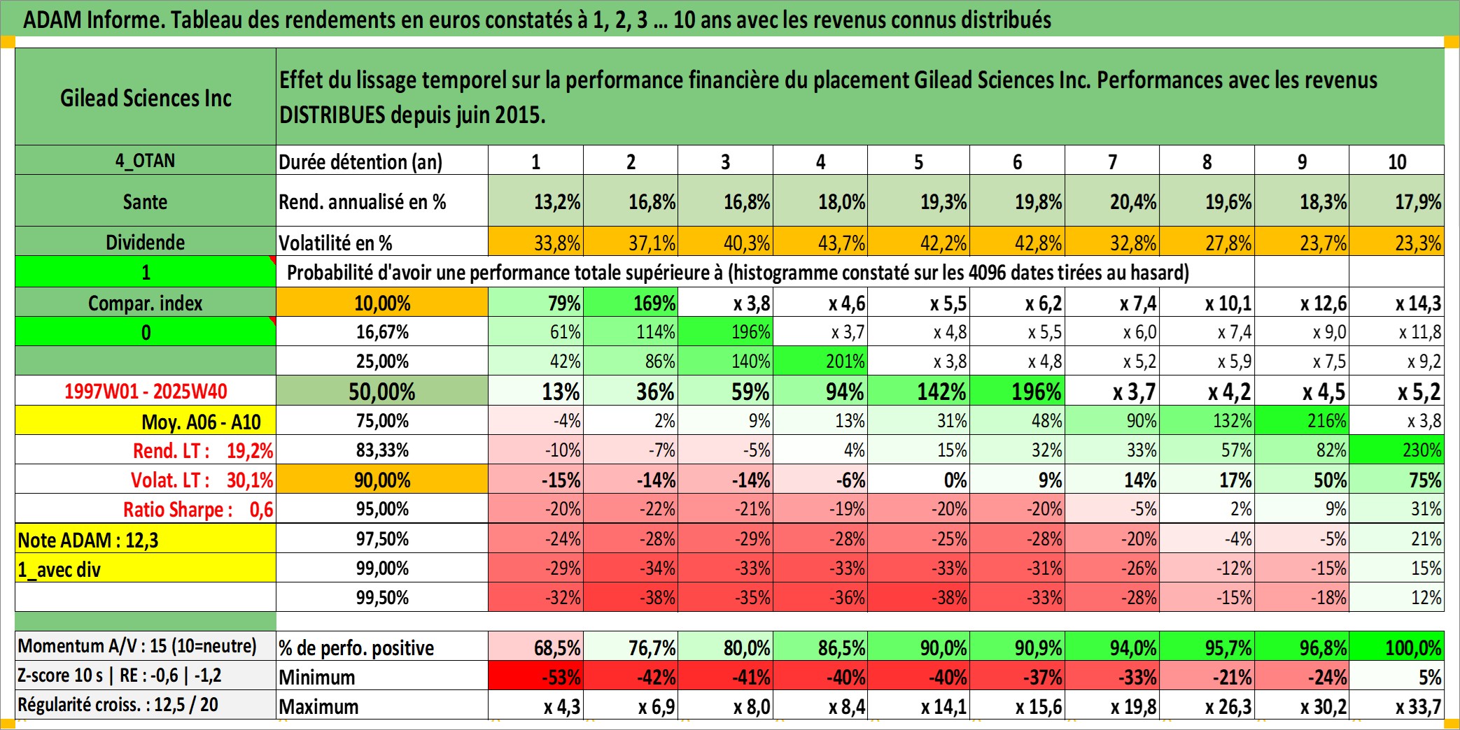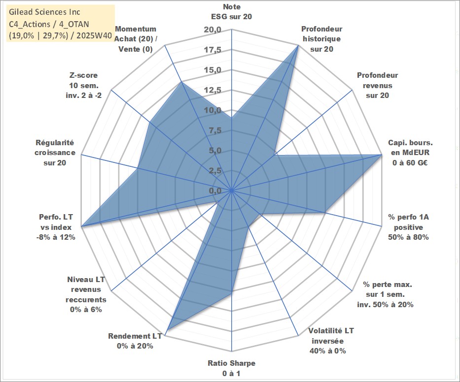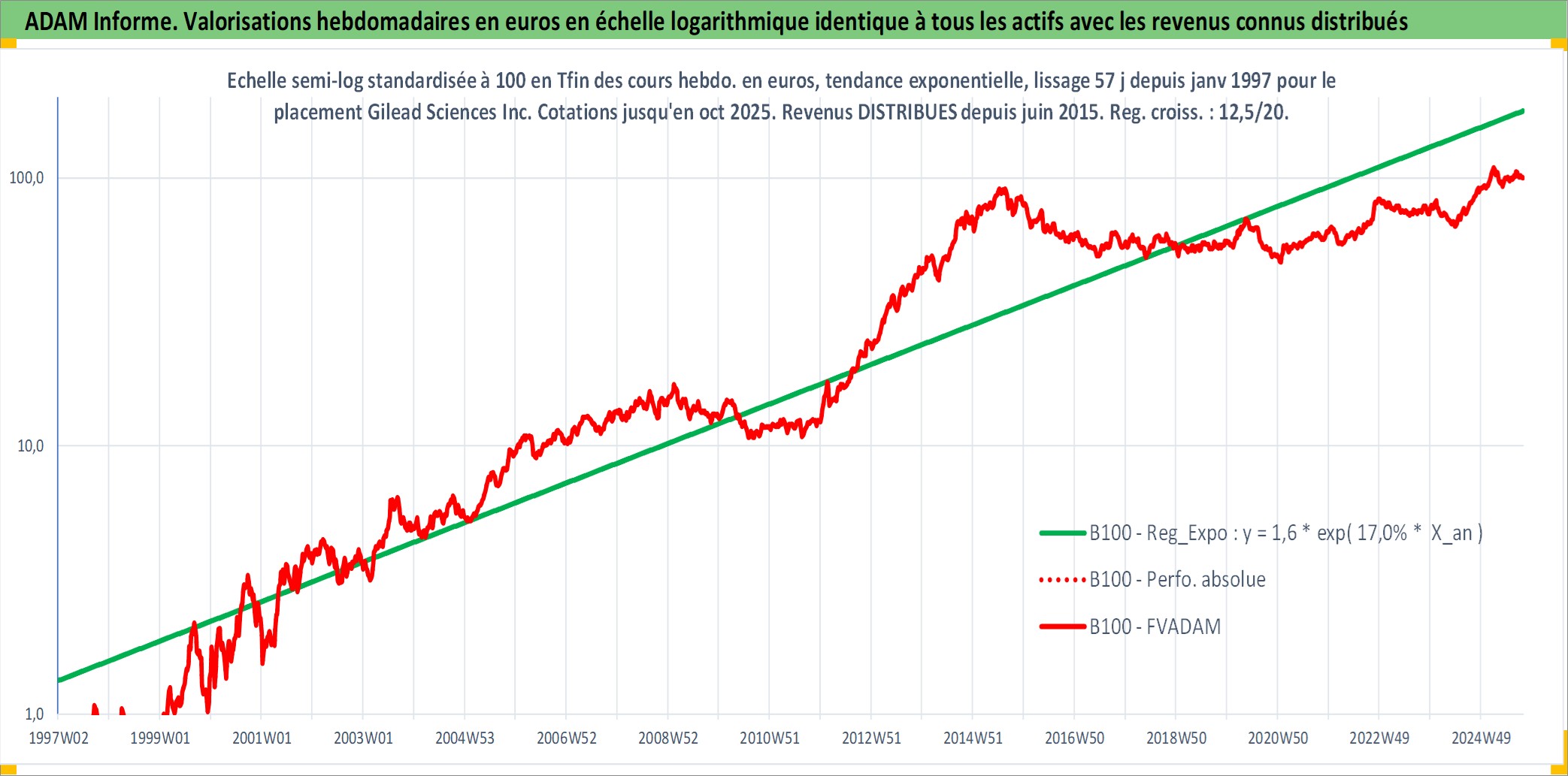 Site dédié aux investisseursPage dédiée sur site financeAnalyse des valorisations hebdomadaires de l'action Gilead Sciences Inc. Cet actif est cote en USD. Les valorisations sont en contrevaleur EURO et couvrent les semaines 1997W01 a 2025W40. Les revenus de cet actif financier sont pris en compte depuis la semaine 2015W24. La note globale ESG de cet actif est estimee a 9.0 (apres rebasage entre 0 et 20).
