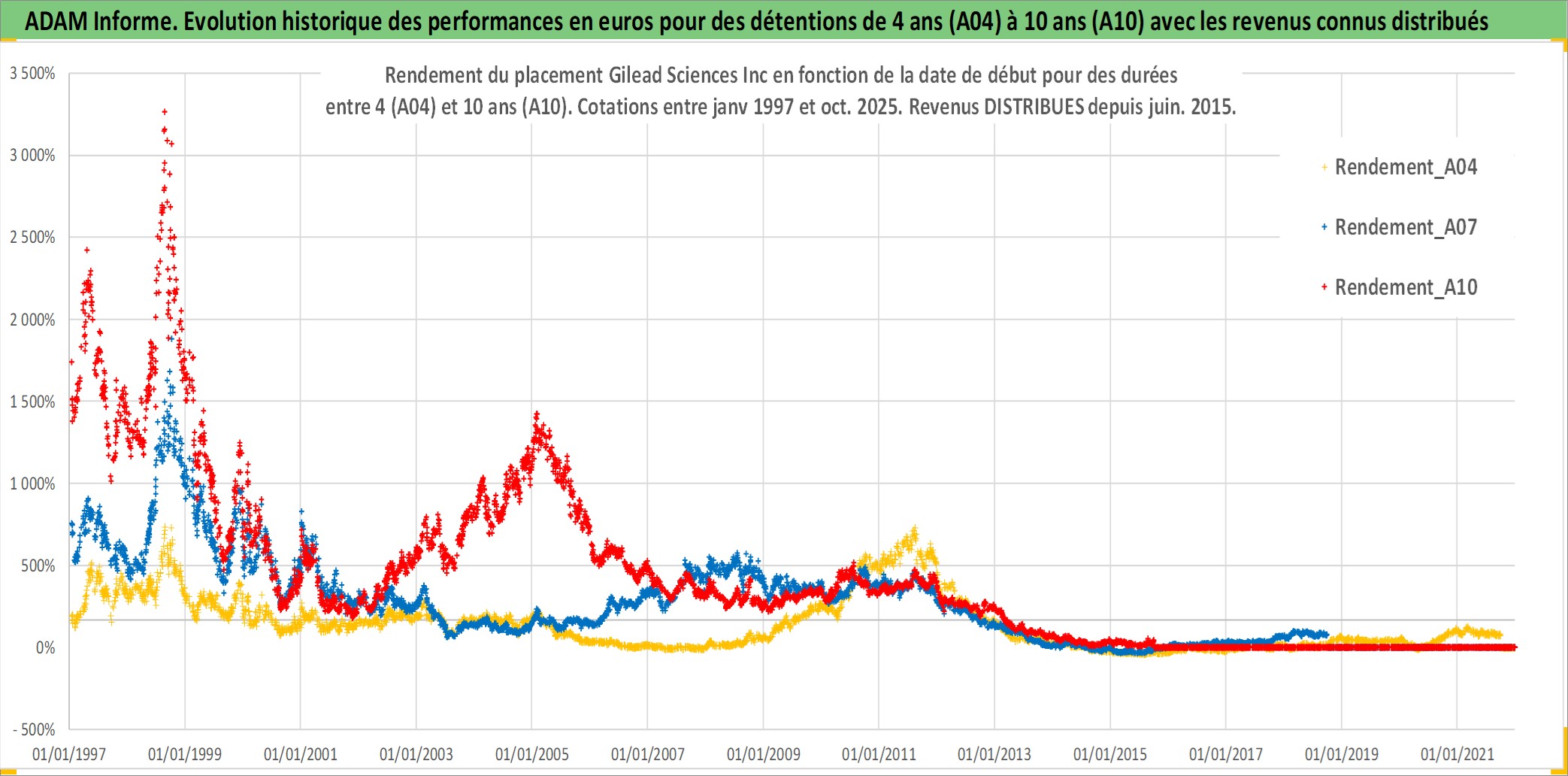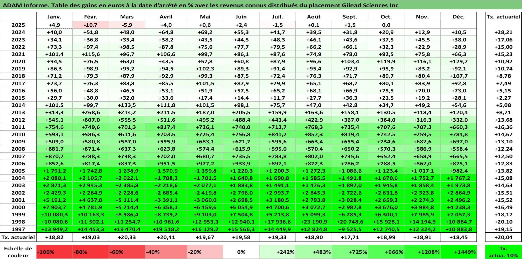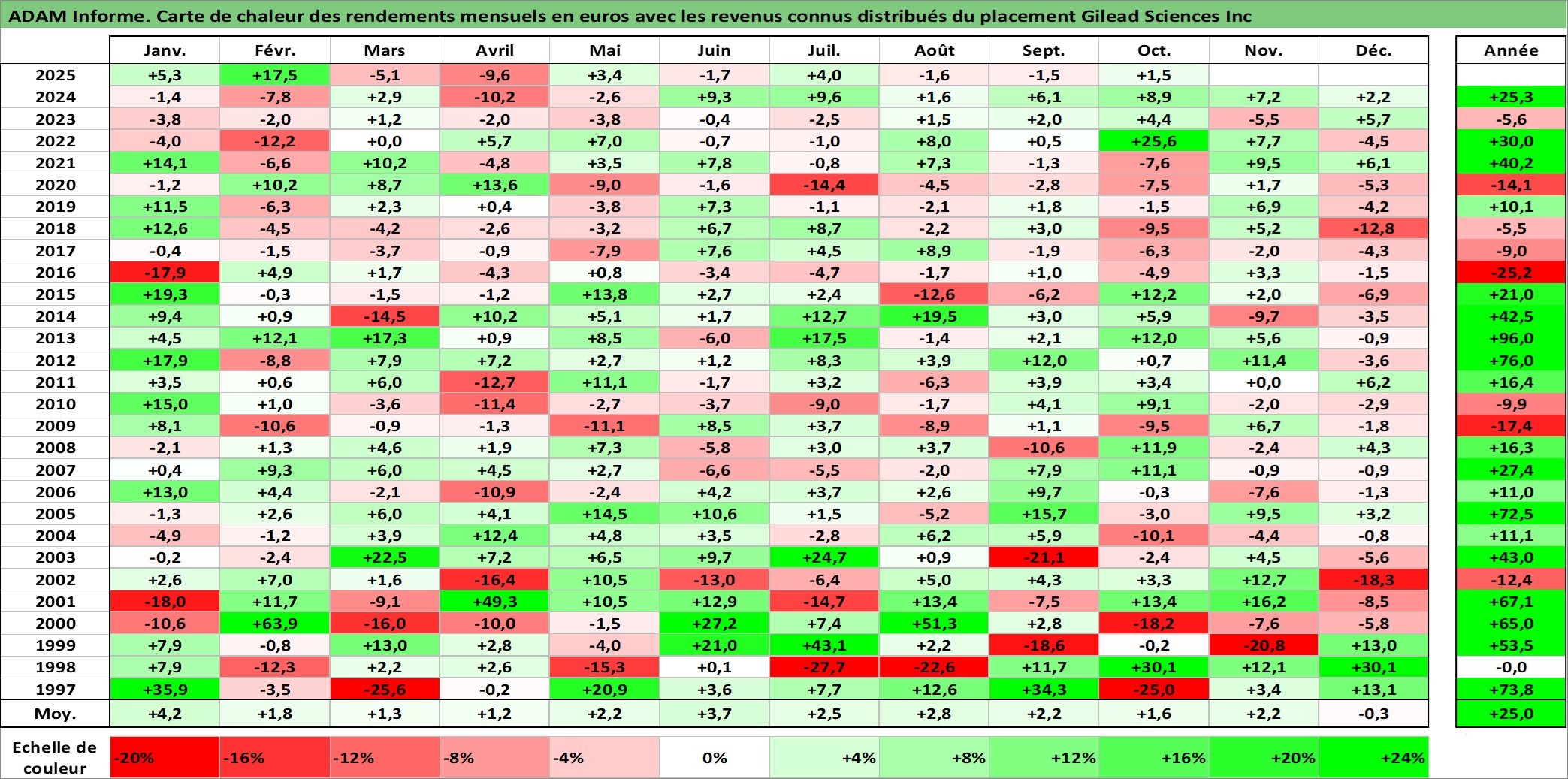 Site dédié aux investisseursPage dédiée sur site financeAnalyse des valorisations hebdomadaires de l'action Gilead Sciences Inc. Cet actif est cote en USD. Les valorisations sont en contrevaleur EURO et couvrent les semaines 1997W01 a 2025W40. Les revenus de cet actif financier sont pris en compte depuis la semaine 2015W24. La note globale ESG de cet actif est estimee a 9.0 (apres rebasage entre 0 et 20).