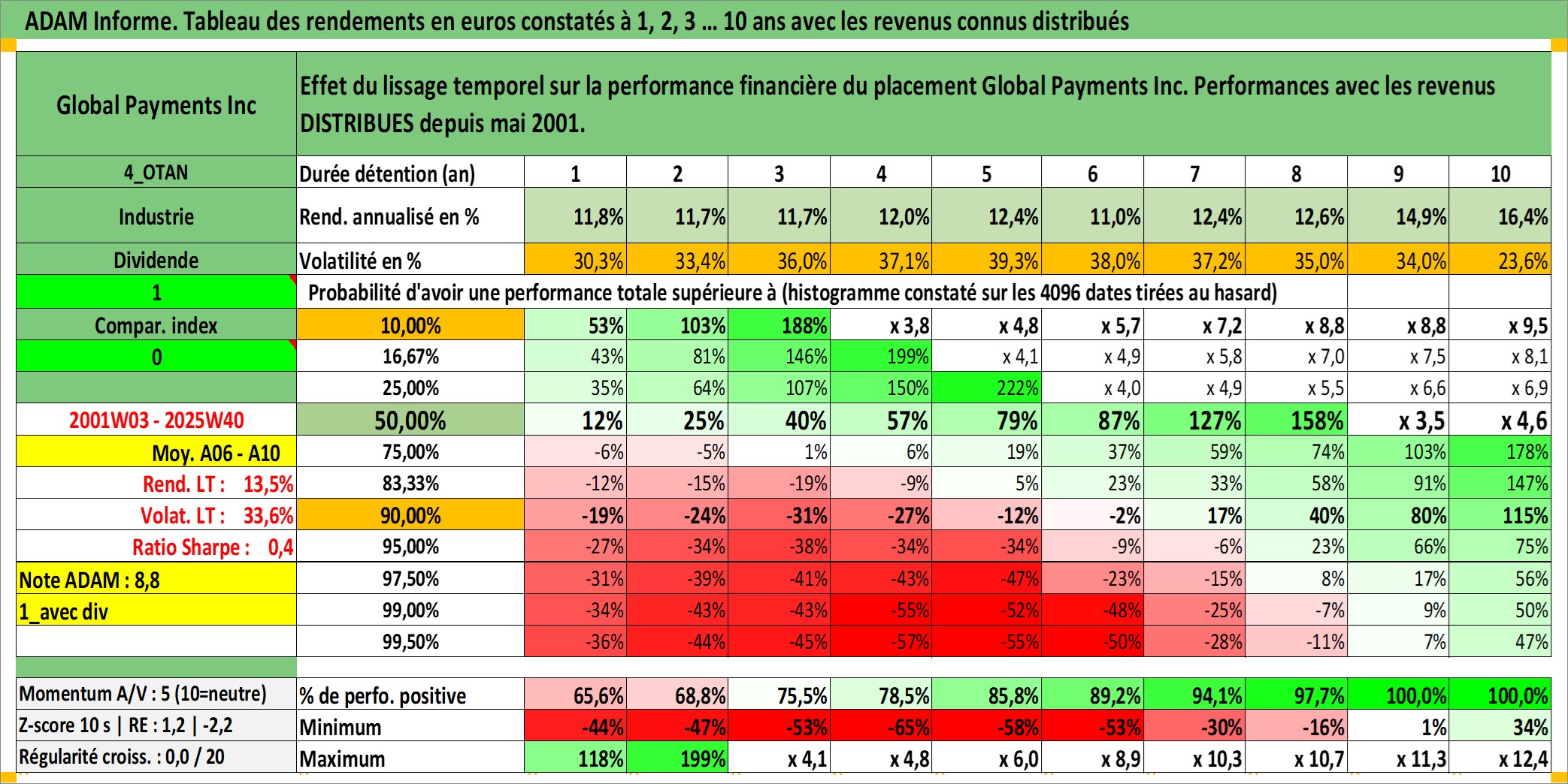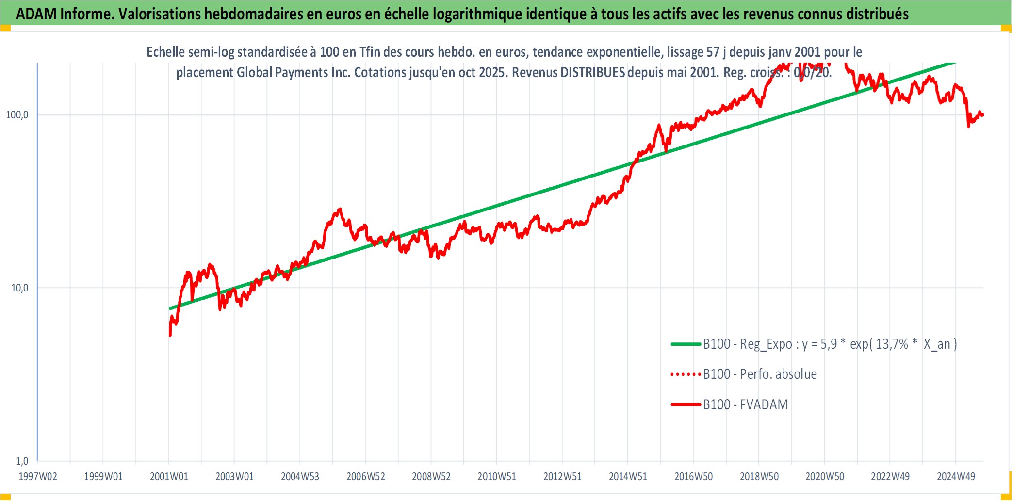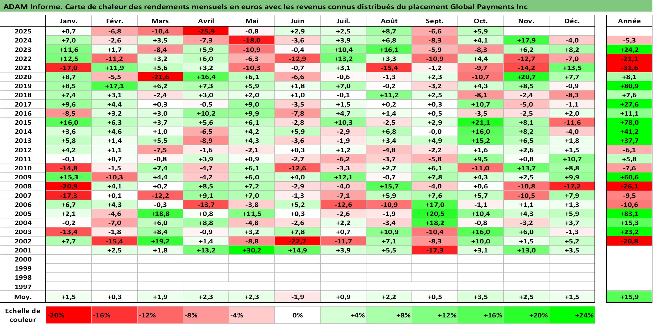 Site dédié aux investisseursPage dédiée sur site financeAnalyse des valorisations hebdomadaires de l'action Global Payments Inc. Cet actif est cote en USD. Les valorisations sont en contrevaleur EURO et couvrent les semaines 2001W03 a 2025W40. Les revenus de cet actif financier sont pris en compte depuis la semaine 2001W20. La note globale ESG de cet actif est estimee a 11.0 (apres rebasage entre 0 et 20).