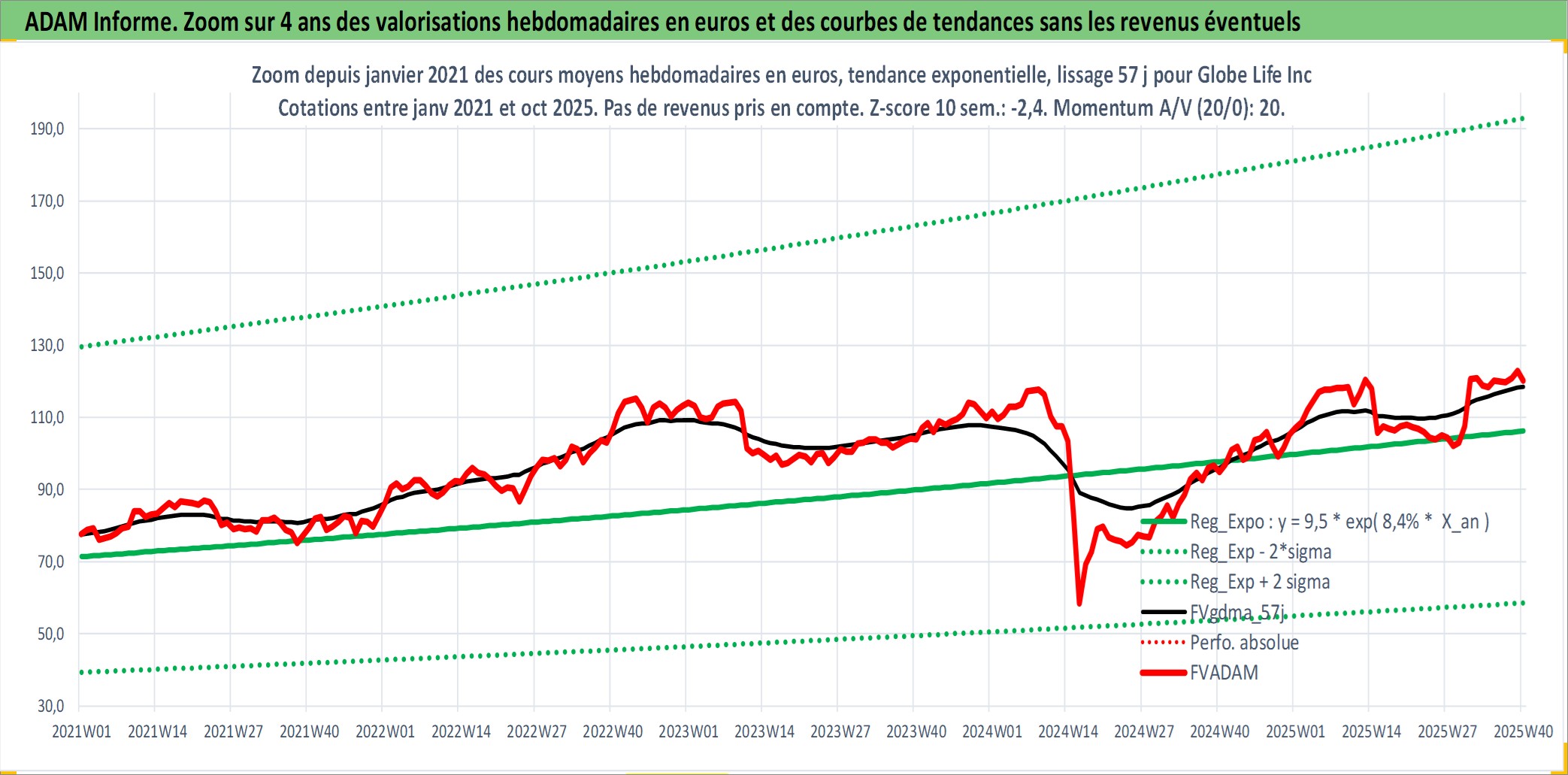 Site dédié aux investisseursPage dédiée sur site financeAnalyse des valorisations hebdomadaires de l'action Globe Life Inc. Cet actif est cote en USD. Les valorisations sont en contrevaleur EURO et couvrent les semaines 1997W01 a 2025W40. Les revenus de cet actif financier sont pris en compte depuis la semaine 1997W14. La note globale ESG de cet actif est estimee a 10.0 (apres rebasage entre 0 et 20).