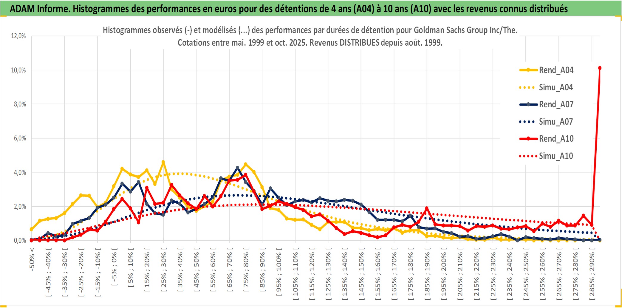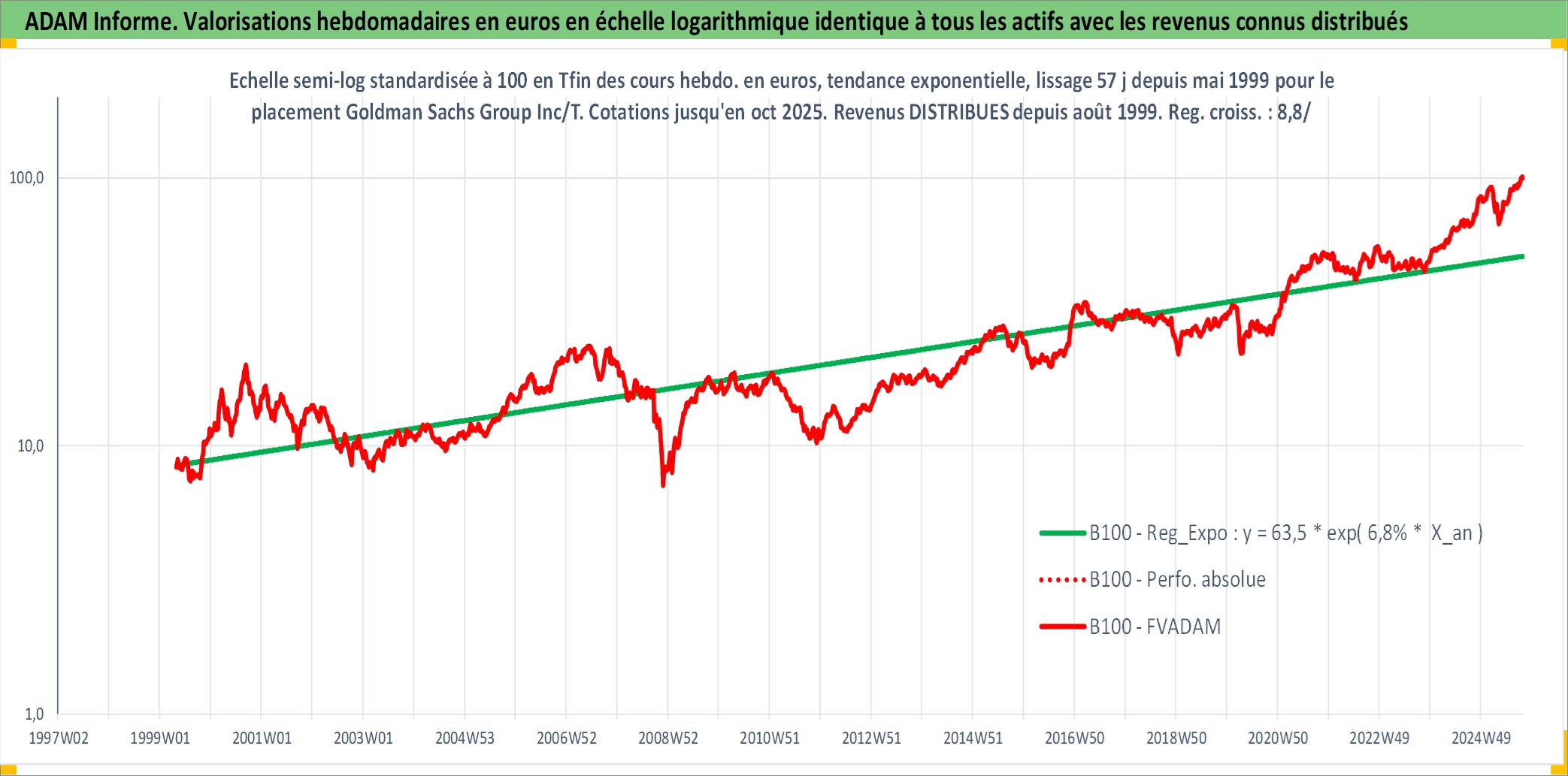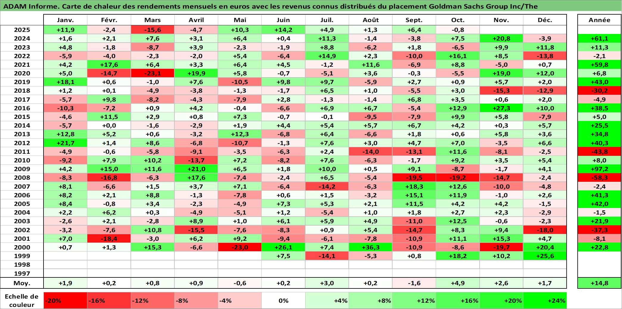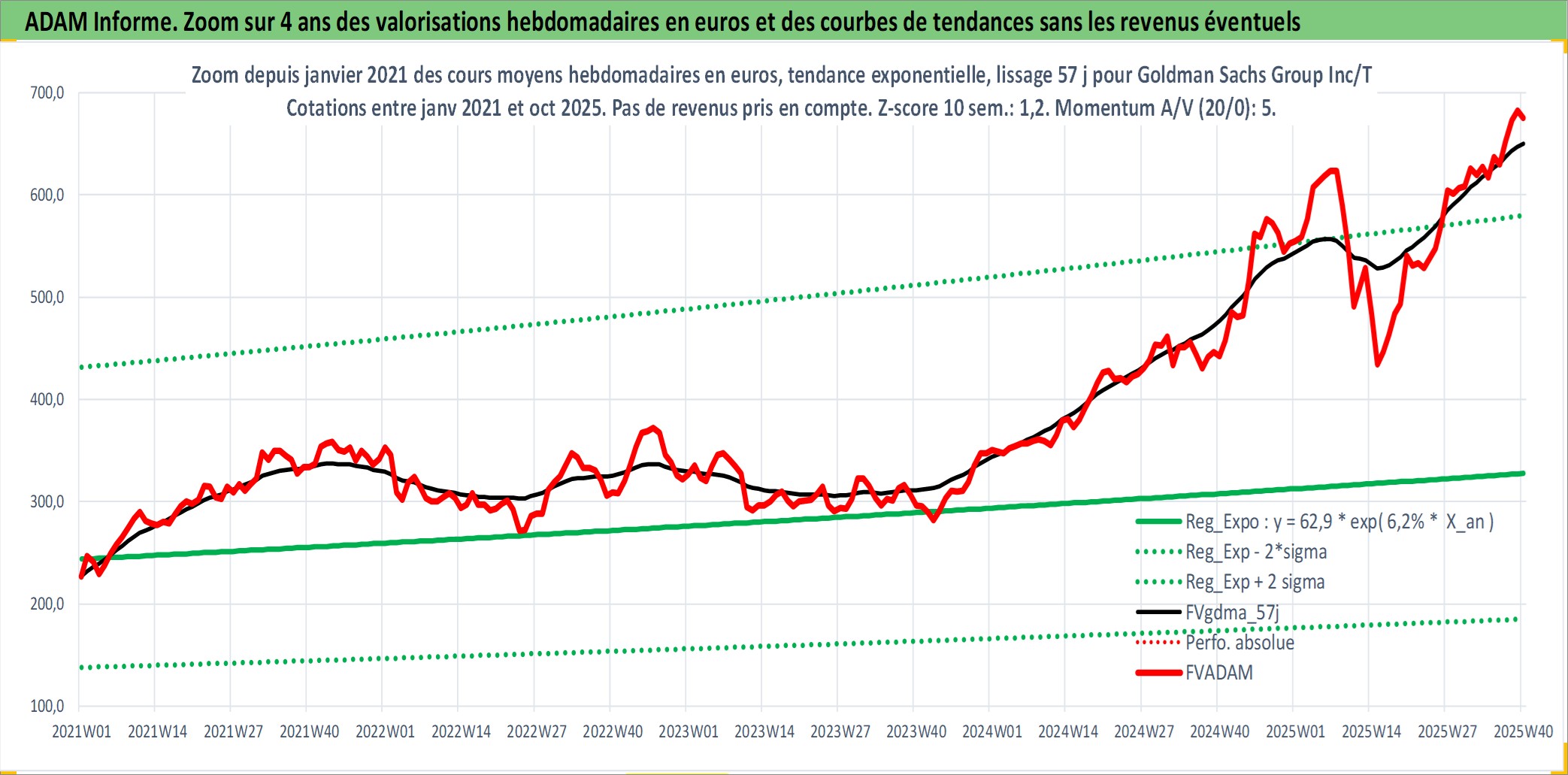 Site dédié aux investisseursPage dédiée sur site financeAnalyse des valorisations hebdomadaires de l'action Goldman Sachs Group Inc/The. Cet actif est cote en USD. Les valorisations sont en contrevaleur EURO et couvrent les semaines 1999W18 a 2025W40. Les revenus de cet actif financier sont pris en compte depuis la semaine 1999W32. La note globale ESG de cet actif est estimee a 7.0 (apres rebasage entre 0 et 20).