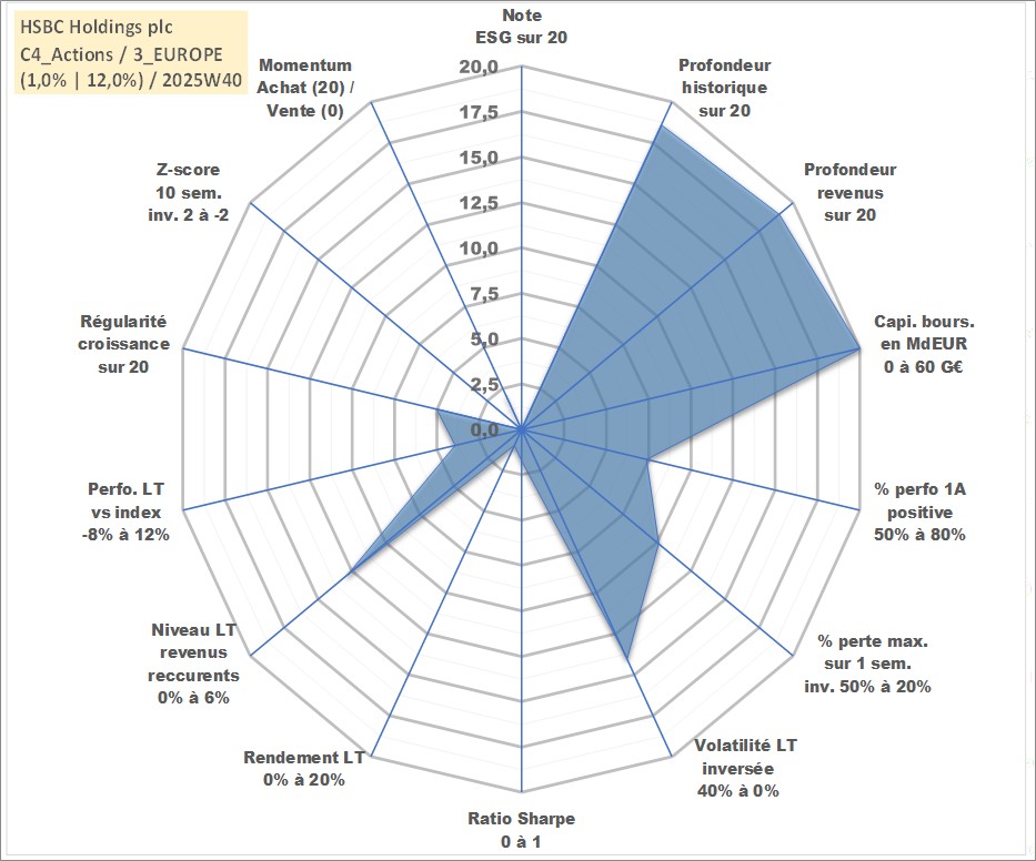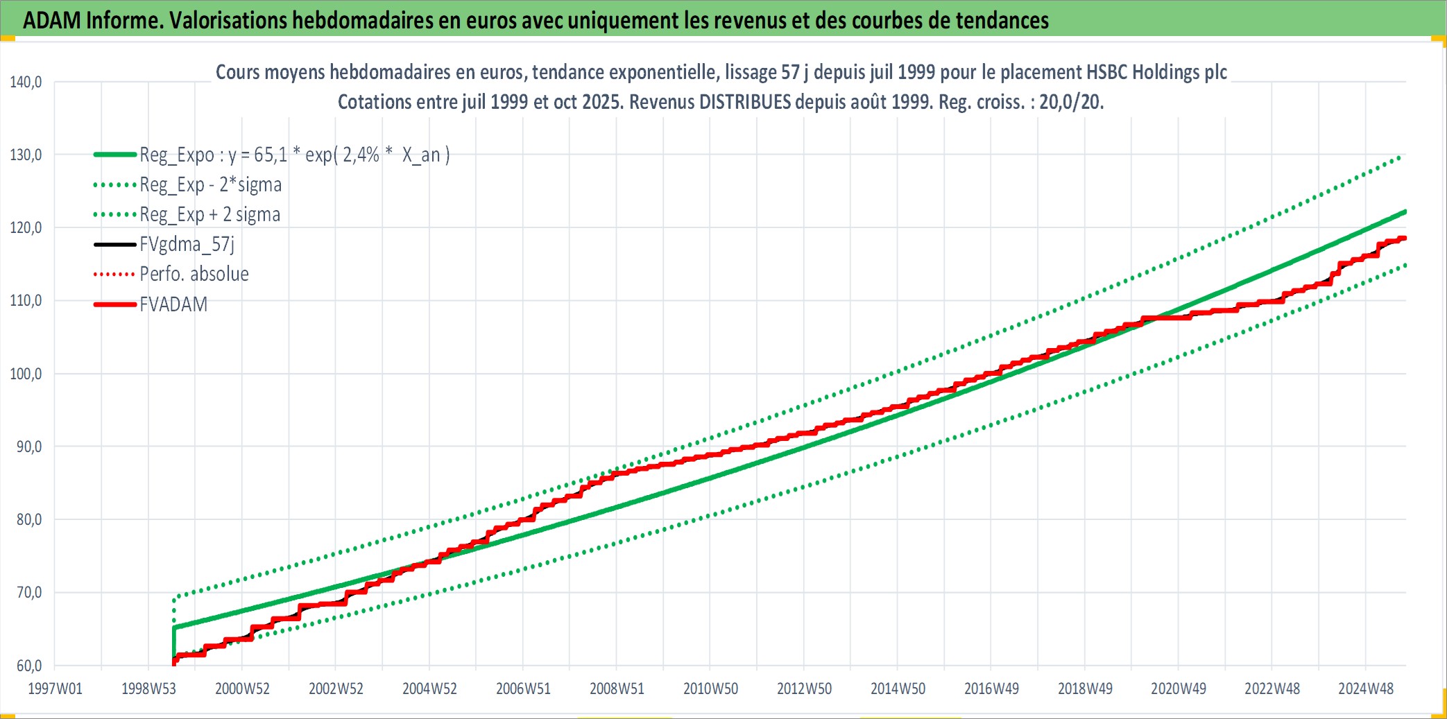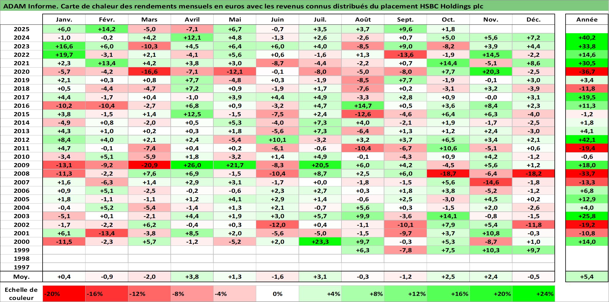 Site dédié aux investisseursPage dédiée sur site financeAnalyse des valorisations hebdomadaires de l'action HSBC Holdings plc. Cet actif est cote en USD. Les valorisations sont en contrevaleur EURO et couvrent les semaines 1999W28 a 2025W40. Les revenus de cet actif financier sont pris en compte depuis la semaine 1999W33. La note ESG de cet actif n'est pas connue.