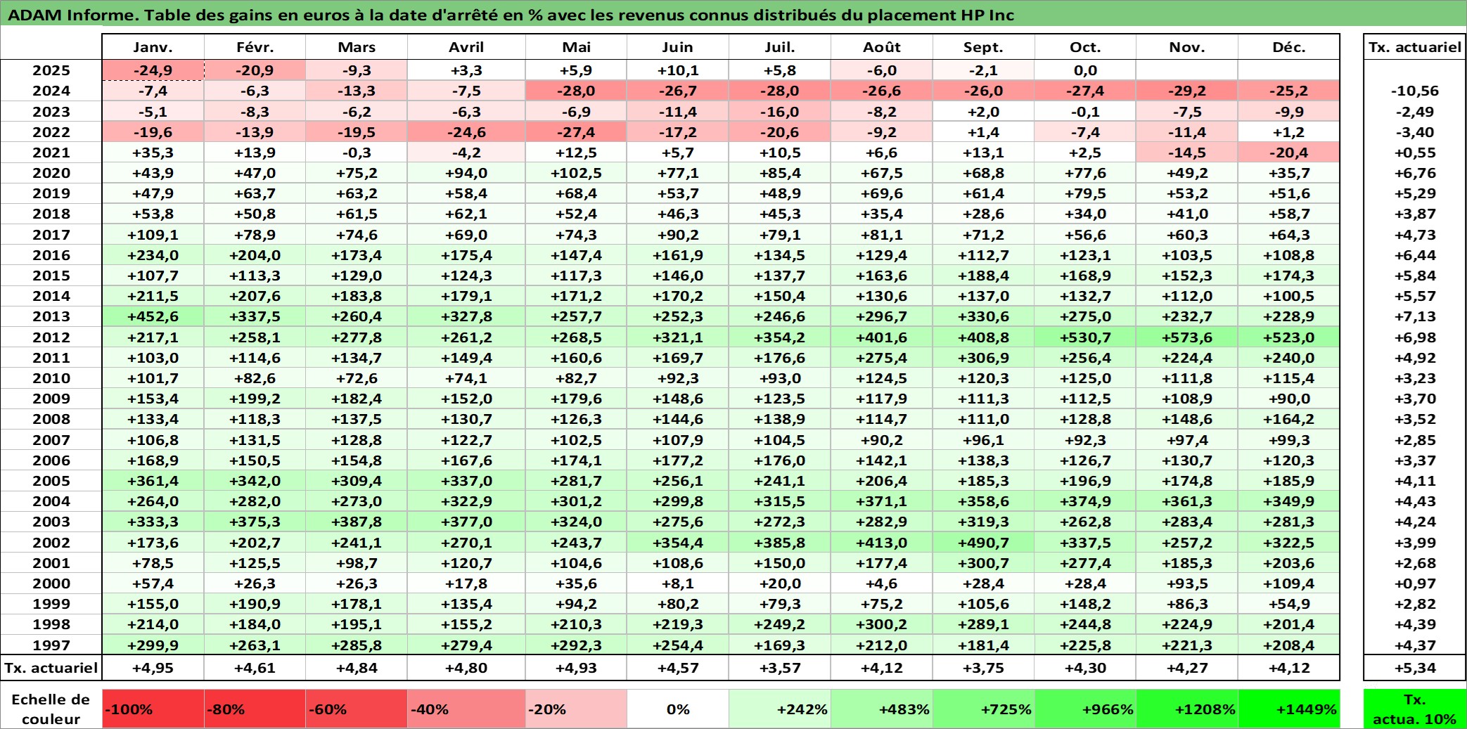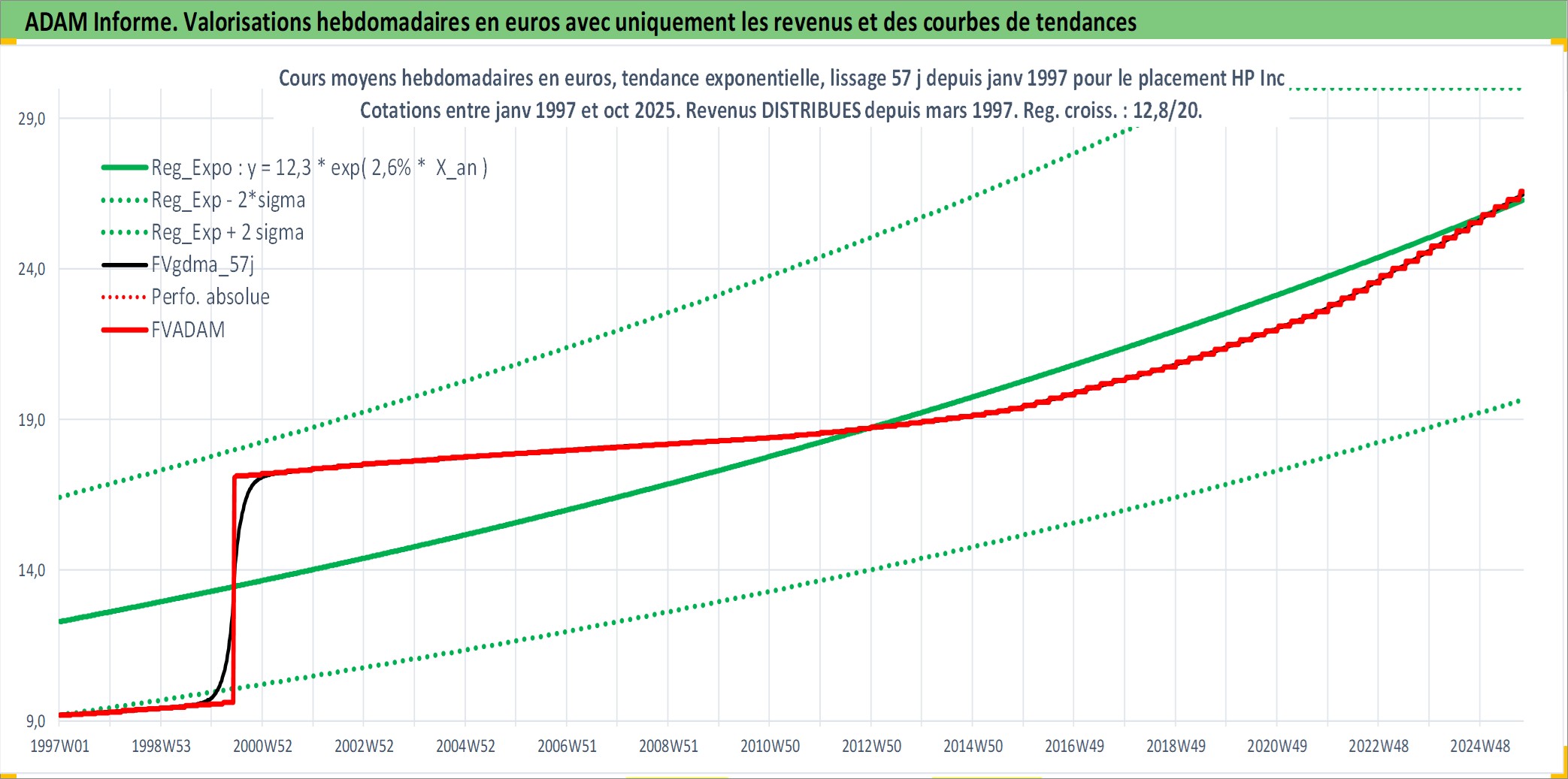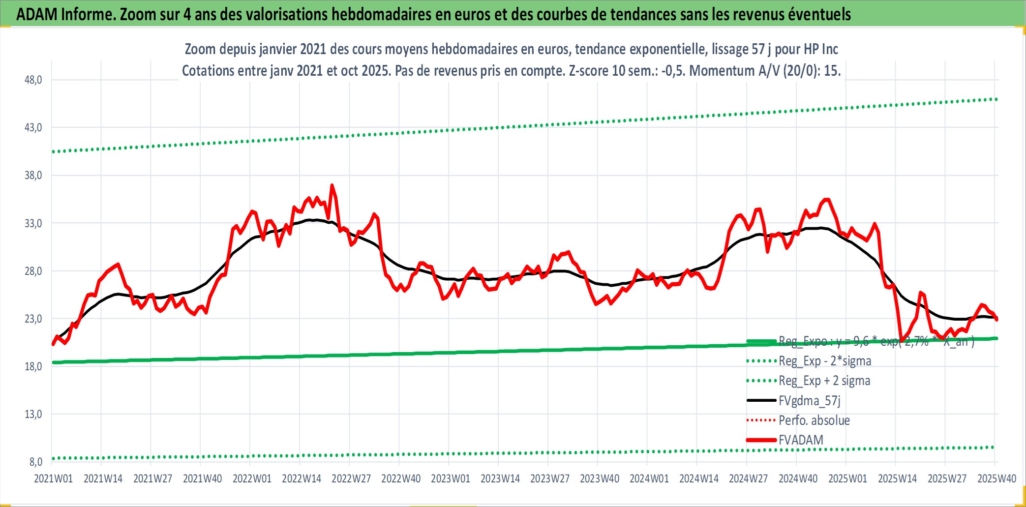 Site dédié aux investisseursPage dédiée sur site financeAnalyse des valorisations hebdomadaires de l'action HP Inc. Cet actif est cote en USD. Les valorisations sont en contrevaleur EURO et couvrent les semaines 1997W01 a 2025W40. Les revenus de cet actif financier sont pris en compte depuis la semaine 1997W13. La note globale ESG de cet actif est estimee a 16.0 (apres rebasage entre 0 et 20).