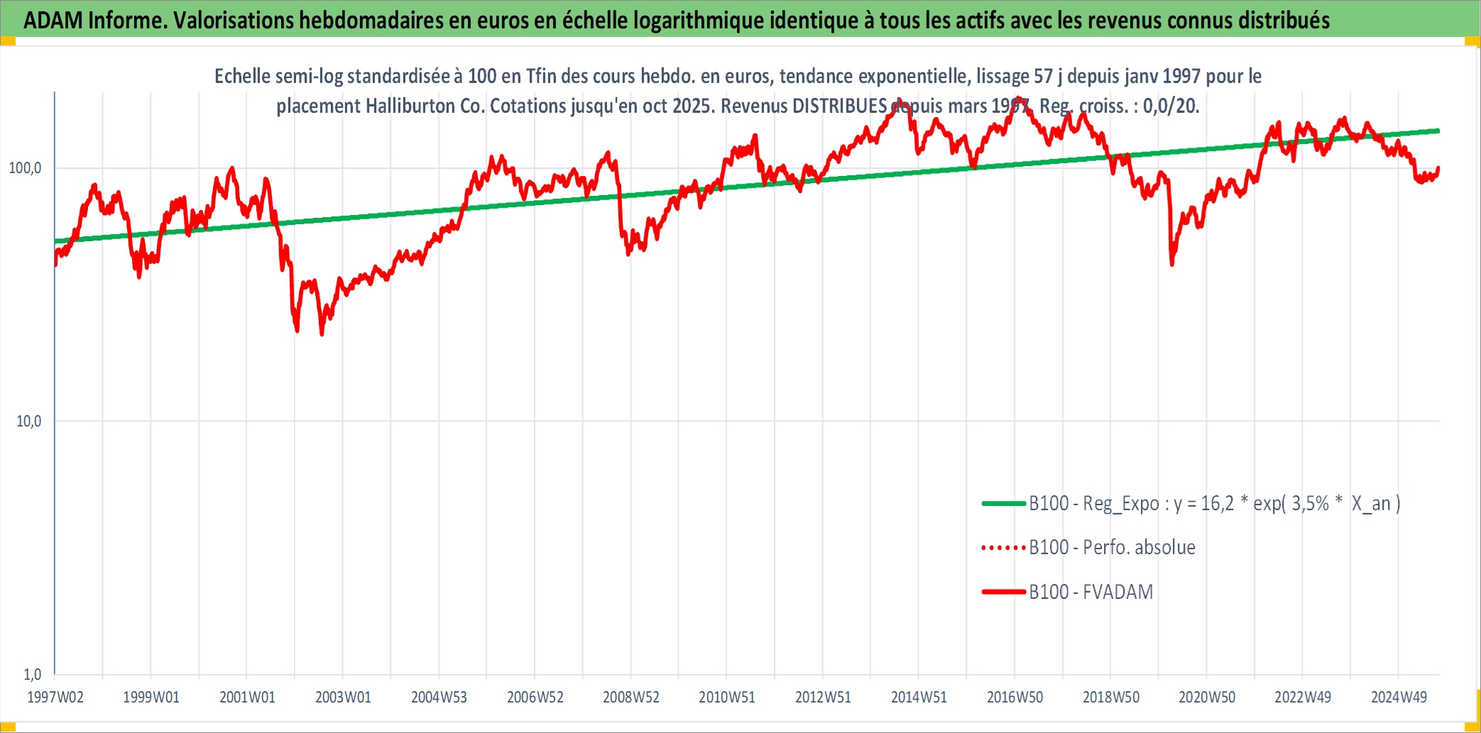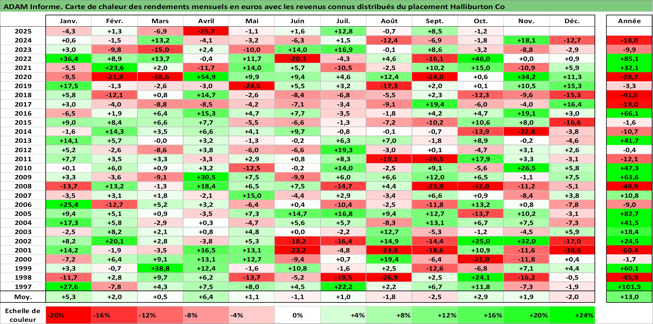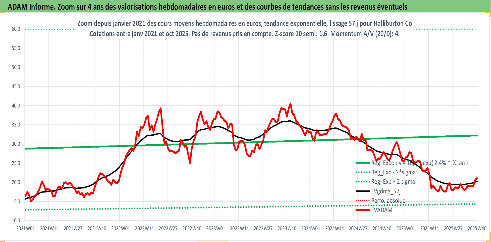 Site dédié aux investisseursPage dédiée sur site financeAnalyse des valorisations hebdomadaires de l'action Halliburton Co. Cet actif est cote en USD. Les valorisations sont en contrevaleur EURO et couvrent les semaines 1997W01 a 2025W40. Les revenus de cet actif financier sont pris en compte depuis la semaine 1997W10. La note globale ESG de cet actif est estimee a 8.0 (apres rebasage entre 0 et 20).