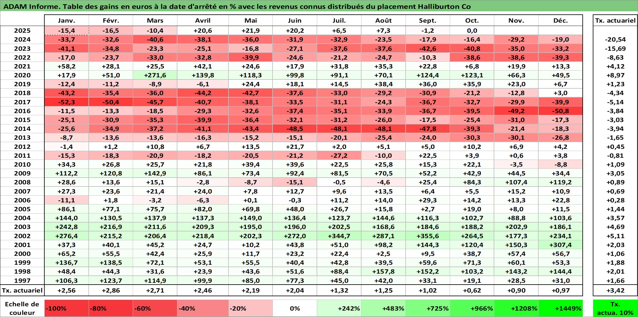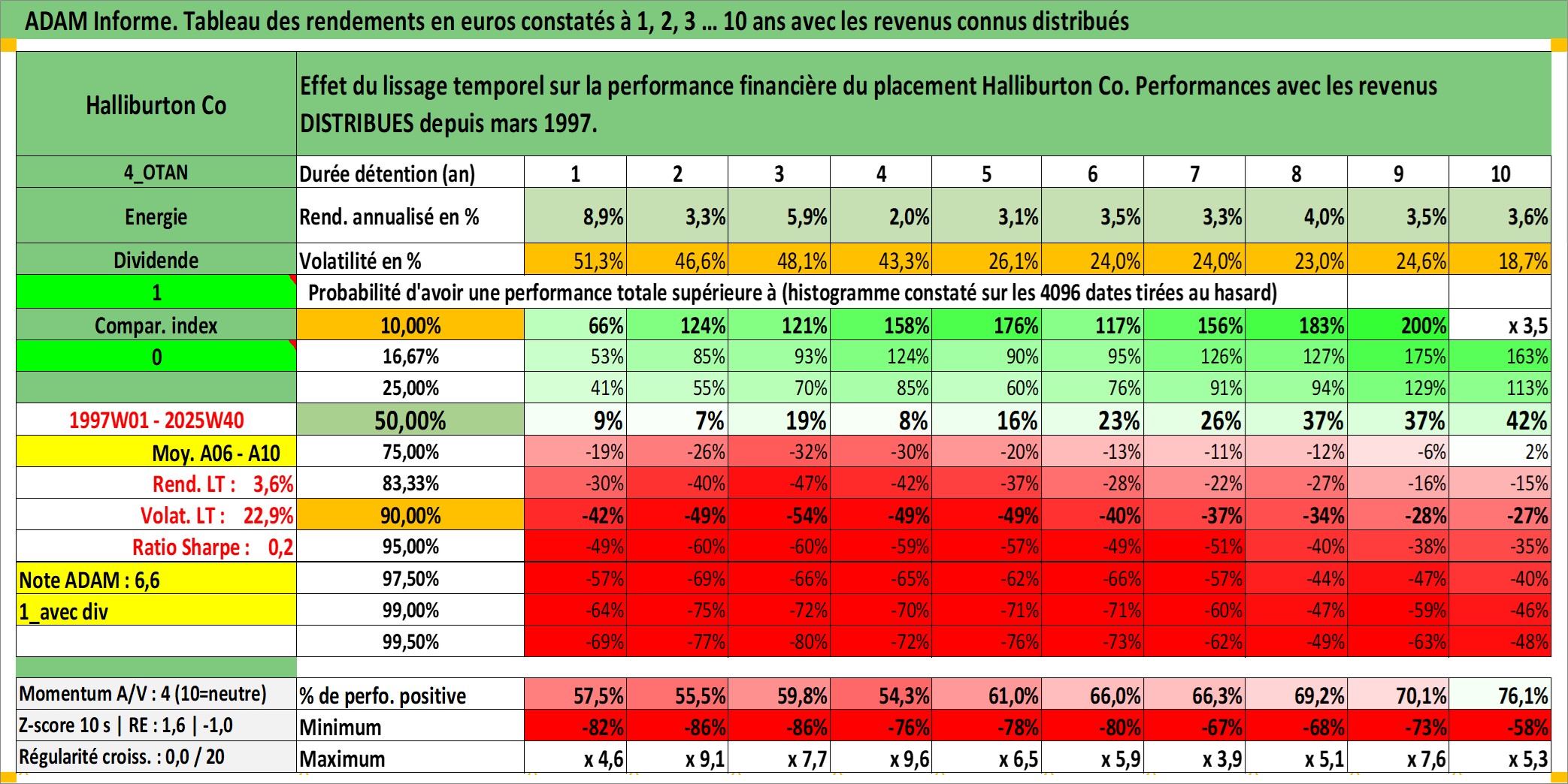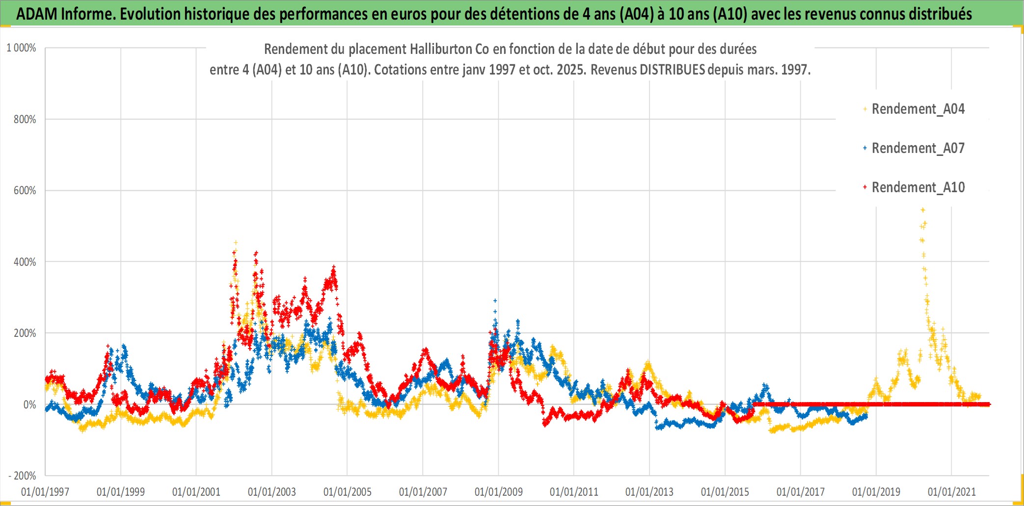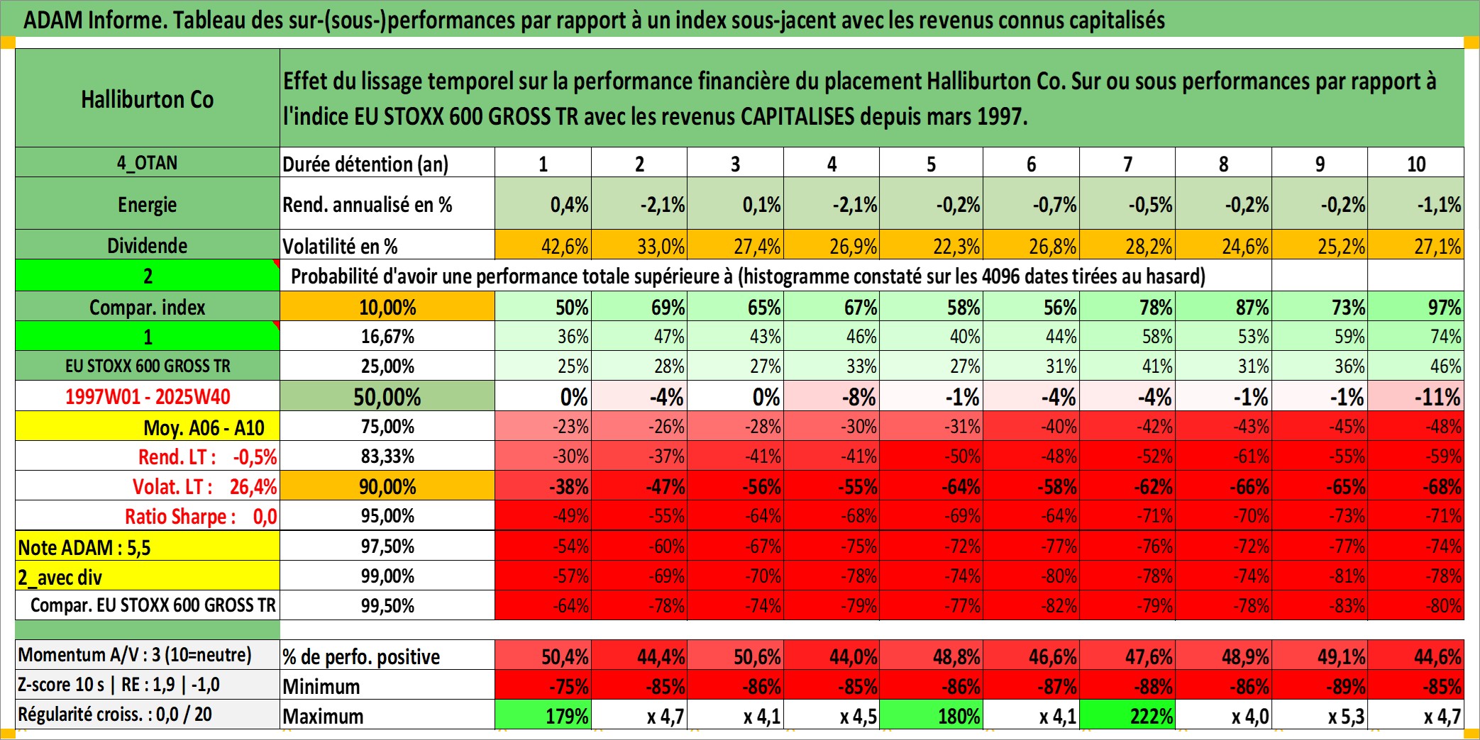 Site dédié aux investisseursPage dédiée sur site financeAnalyse des valorisations hebdomadaires de l'action Halliburton Co. Cet actif est cote en USD. Les valorisations sont en contrevaleur EURO et couvrent les semaines 1997W01 a 2025W40. Les revenus de cet actif financier sont pris en compte depuis la semaine 1997W10. La note globale ESG de cet actif est estimee a 8.0 (apres rebasage entre 0 et 20).
