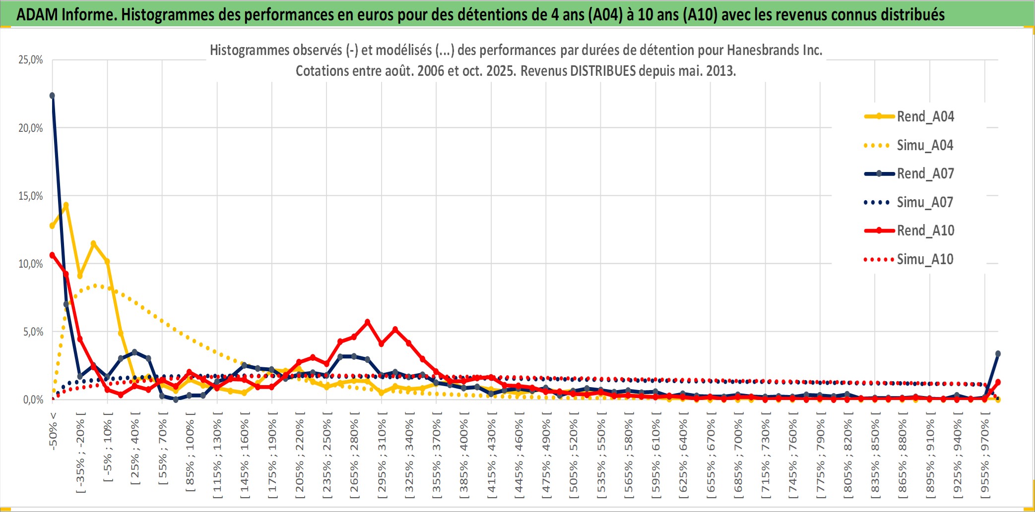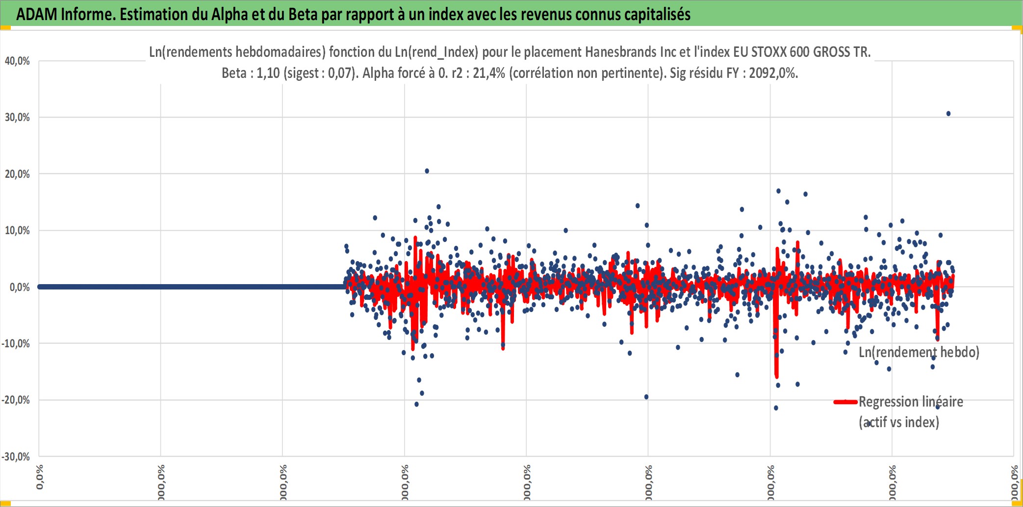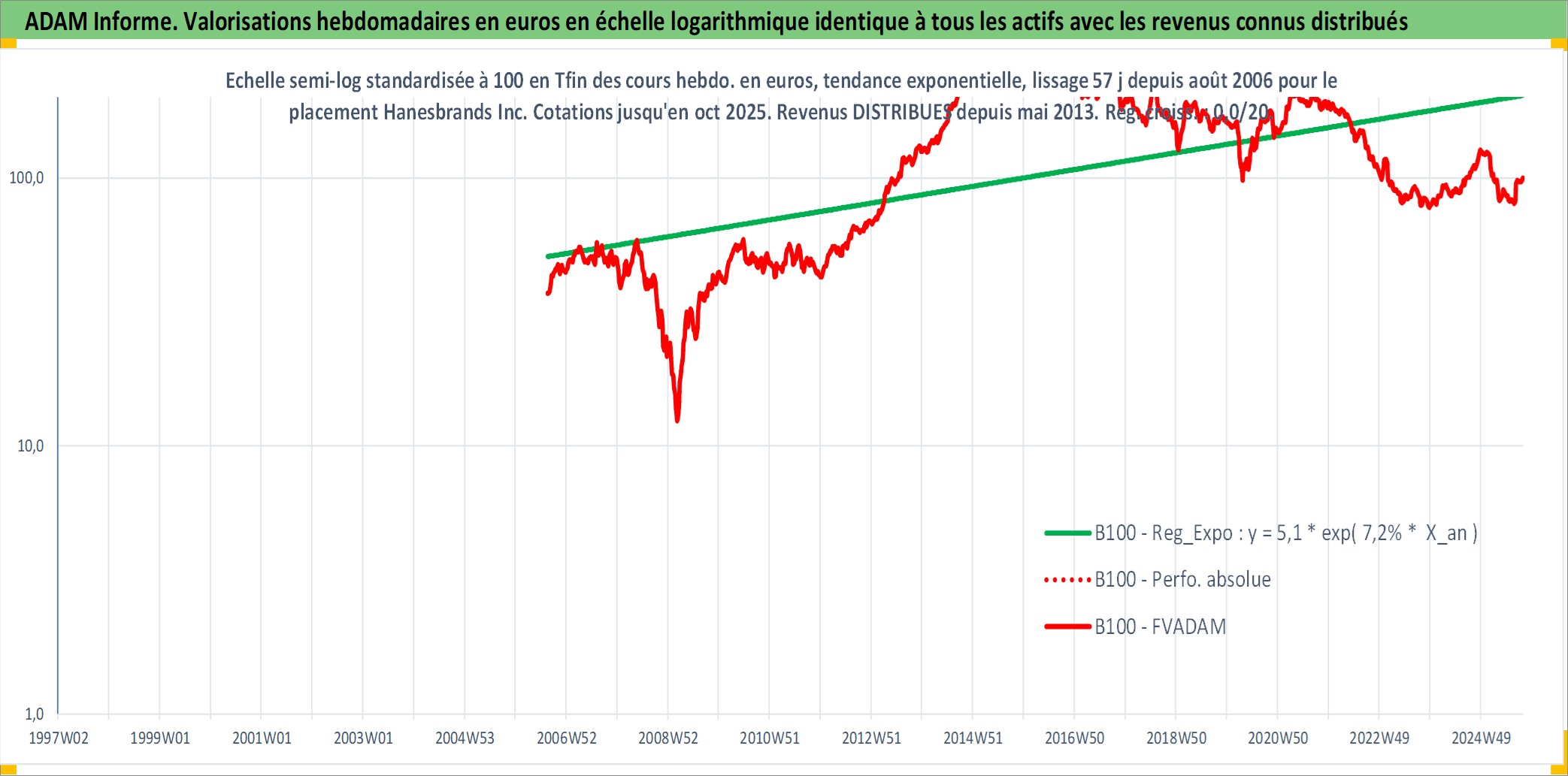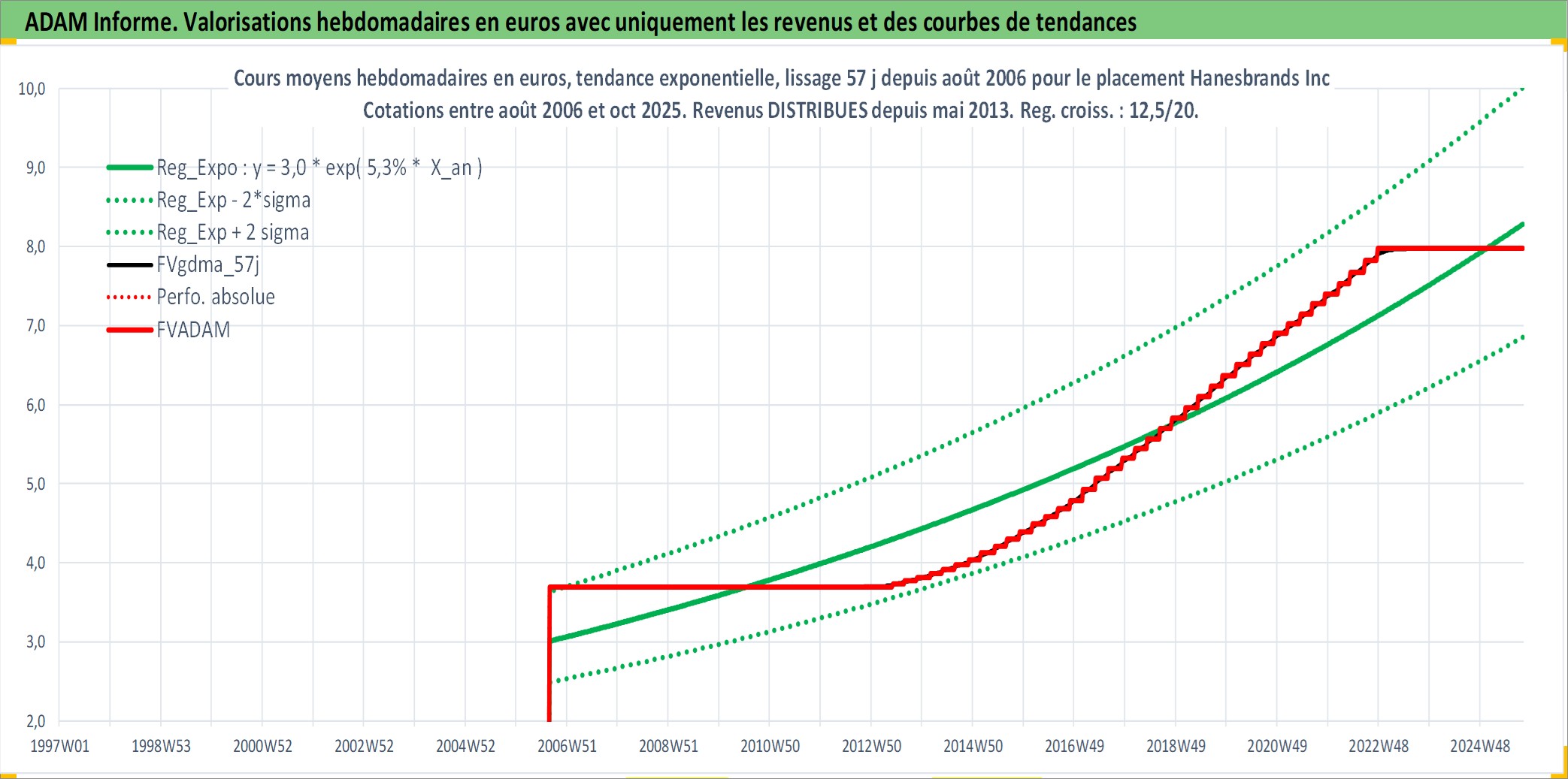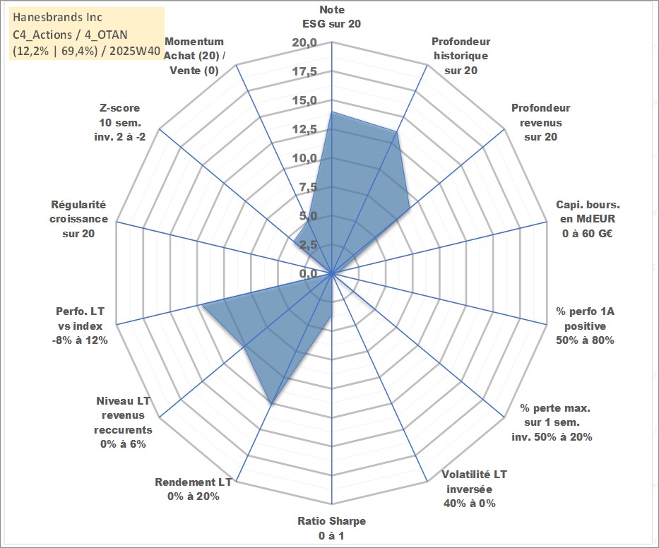 Site dédié aux investisseursPage dédiée sur site financeAnalyse des valorisations hebdomadaires de l'action Hanesbrands Inc. Cet actif est cote en USD. Les valorisations sont en contrevaleur EURO et couvrent les semaines 2006W33 a 2025W40. Les revenus de cet actif financier sont pris en compte depuis la semaine 2013W20. La note globale ESG de cet actif est estimee a 14.0 (apres rebasage entre 0 et 20).