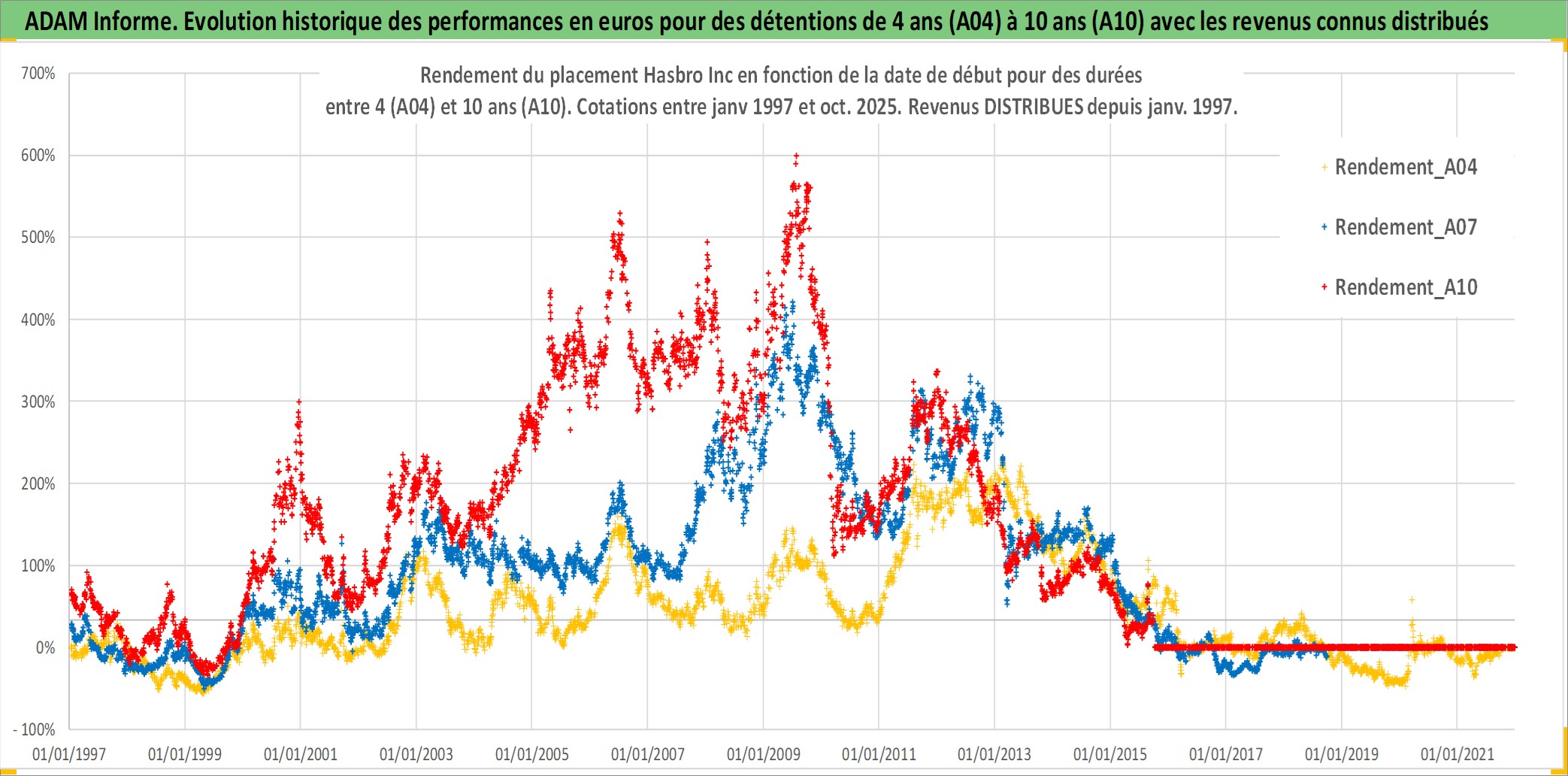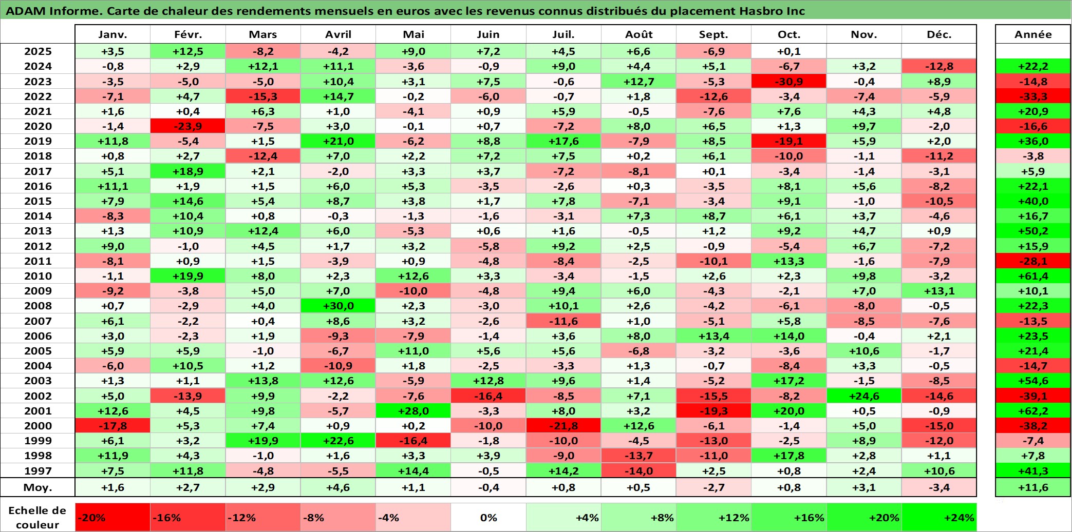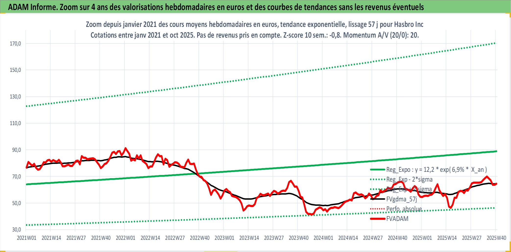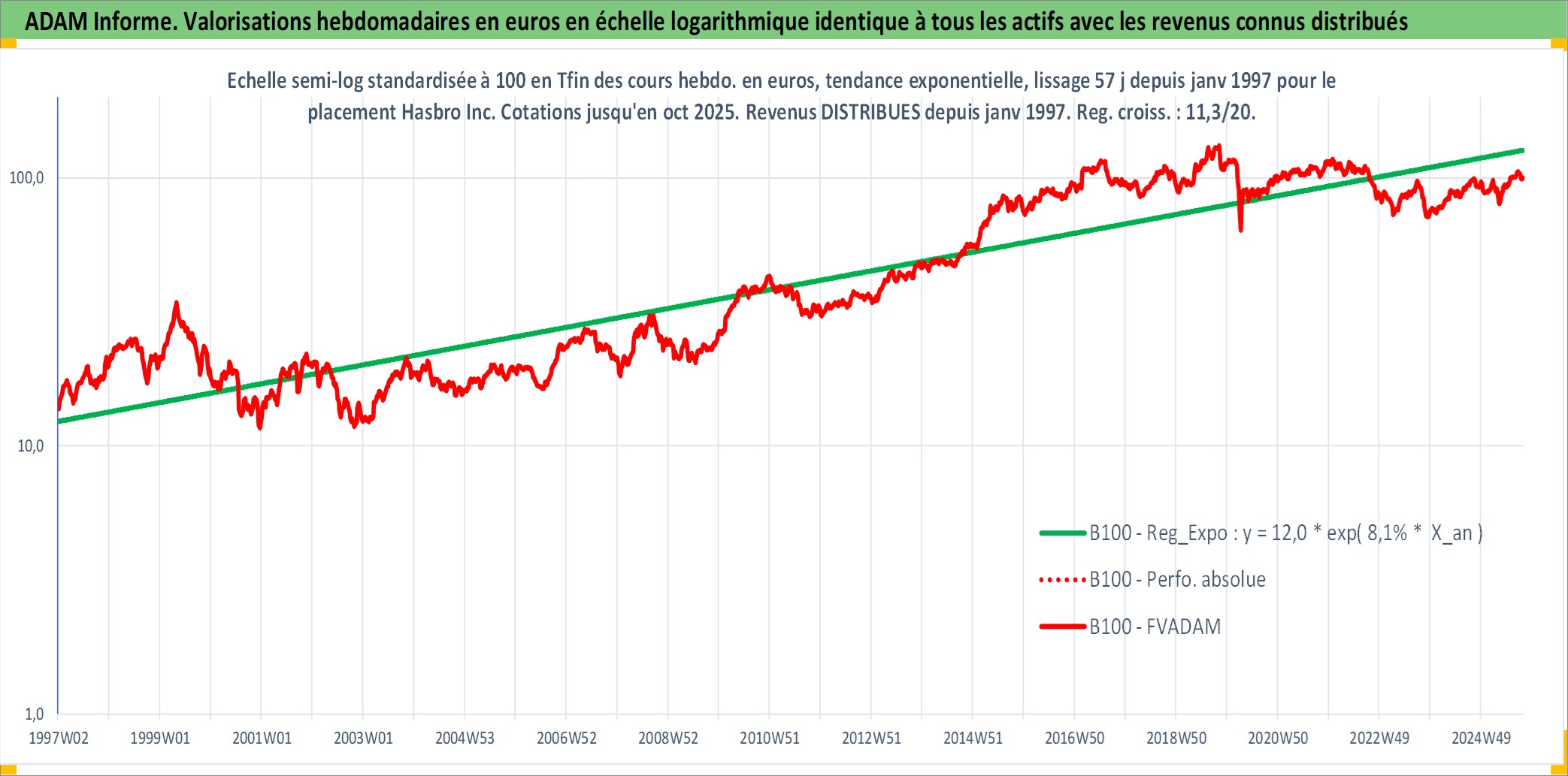 Site dédié aux investisseursPage dédiée sur site financeAnalyse des valorisations hebdomadaires de l'action Hasbro Inc. Cet actif est cote en USD. Les valorisations sont en contrevaleur EURO et couvrent les semaines 1997W01 a 2025W40. Les revenus de cet actif financier sont pris en compte depuis la semaine 1997W05. La note globale ESG de cet actif est estimee a 19.0 (apres rebasage entre 0 et 20).