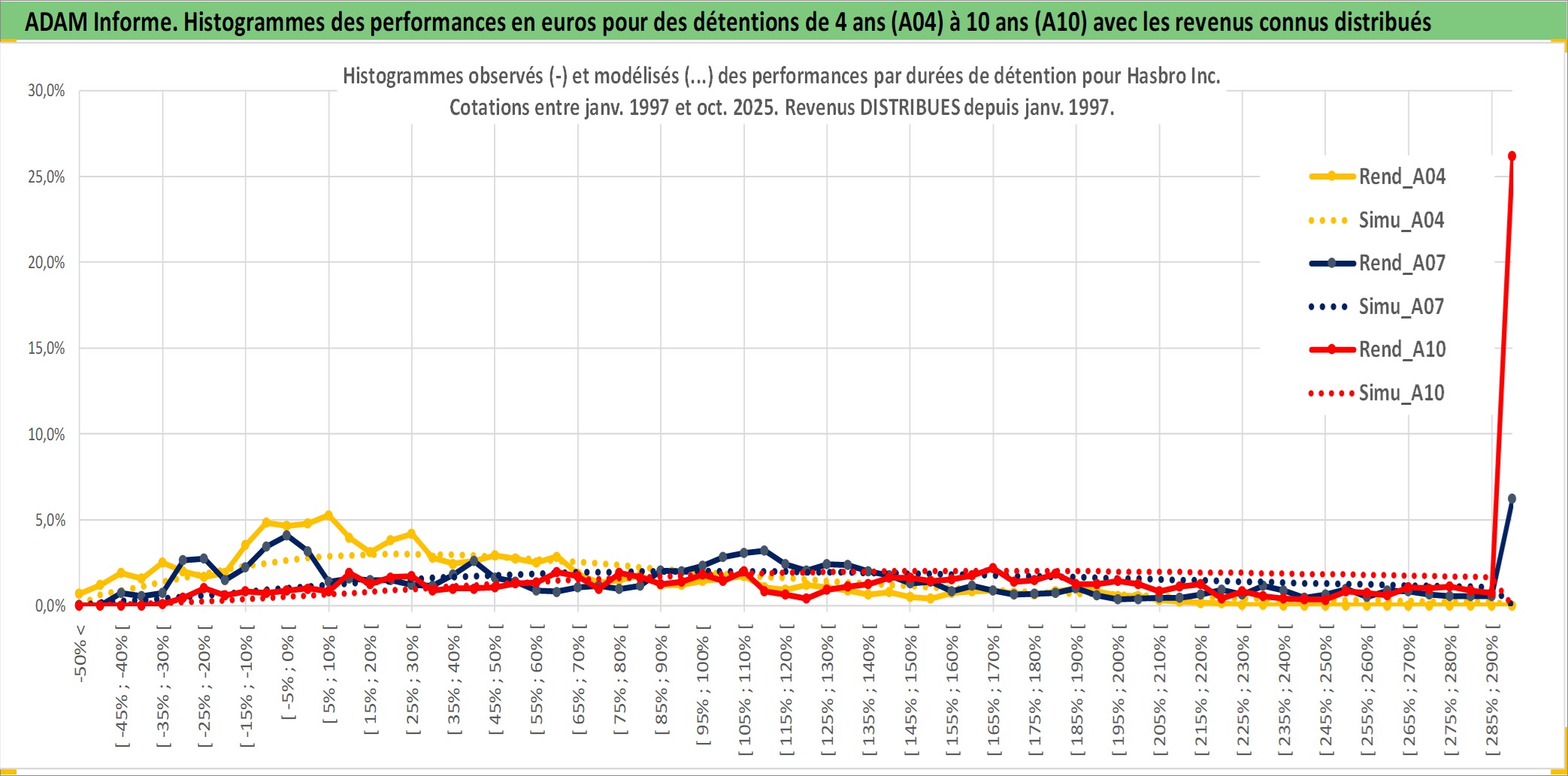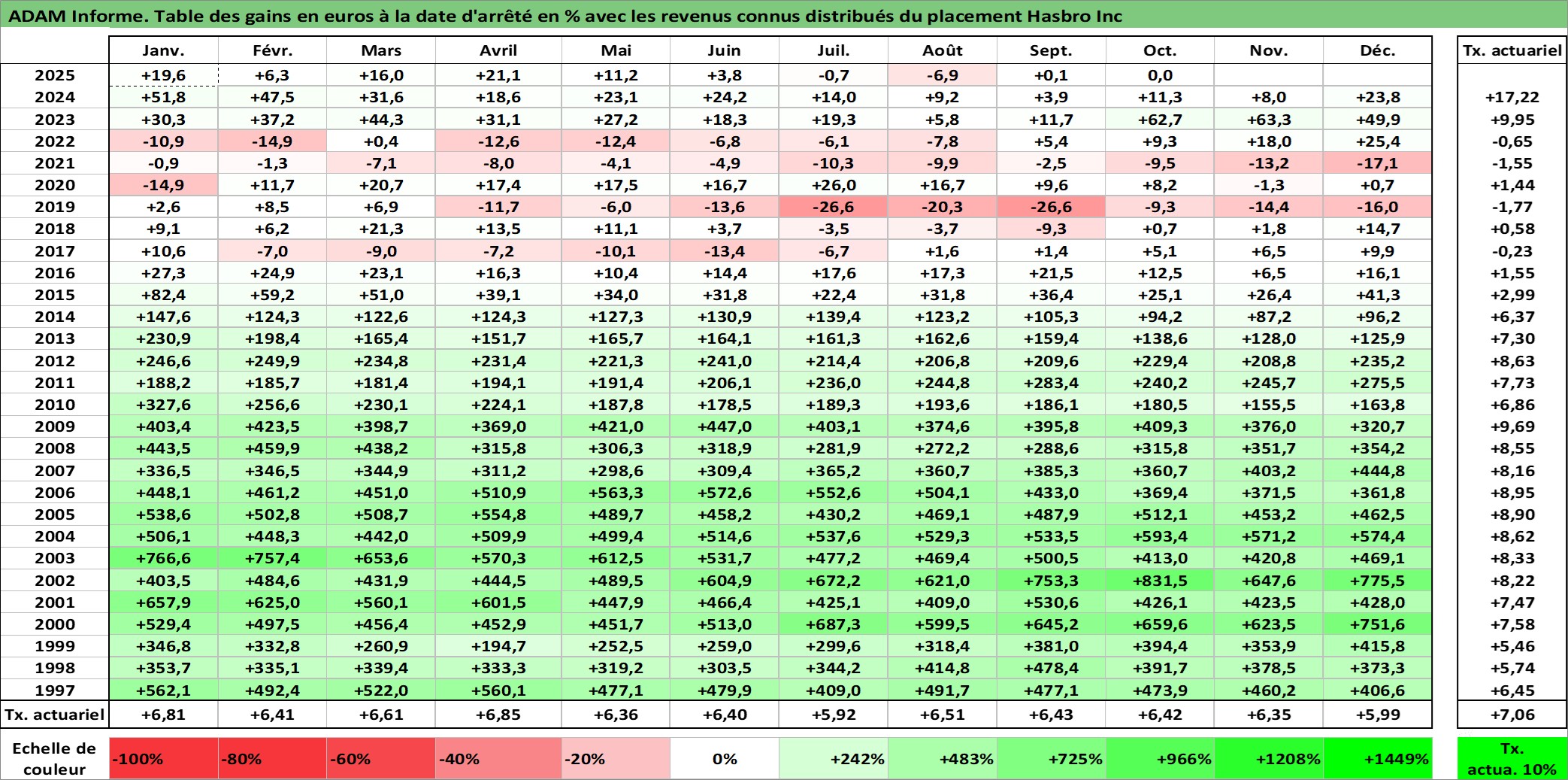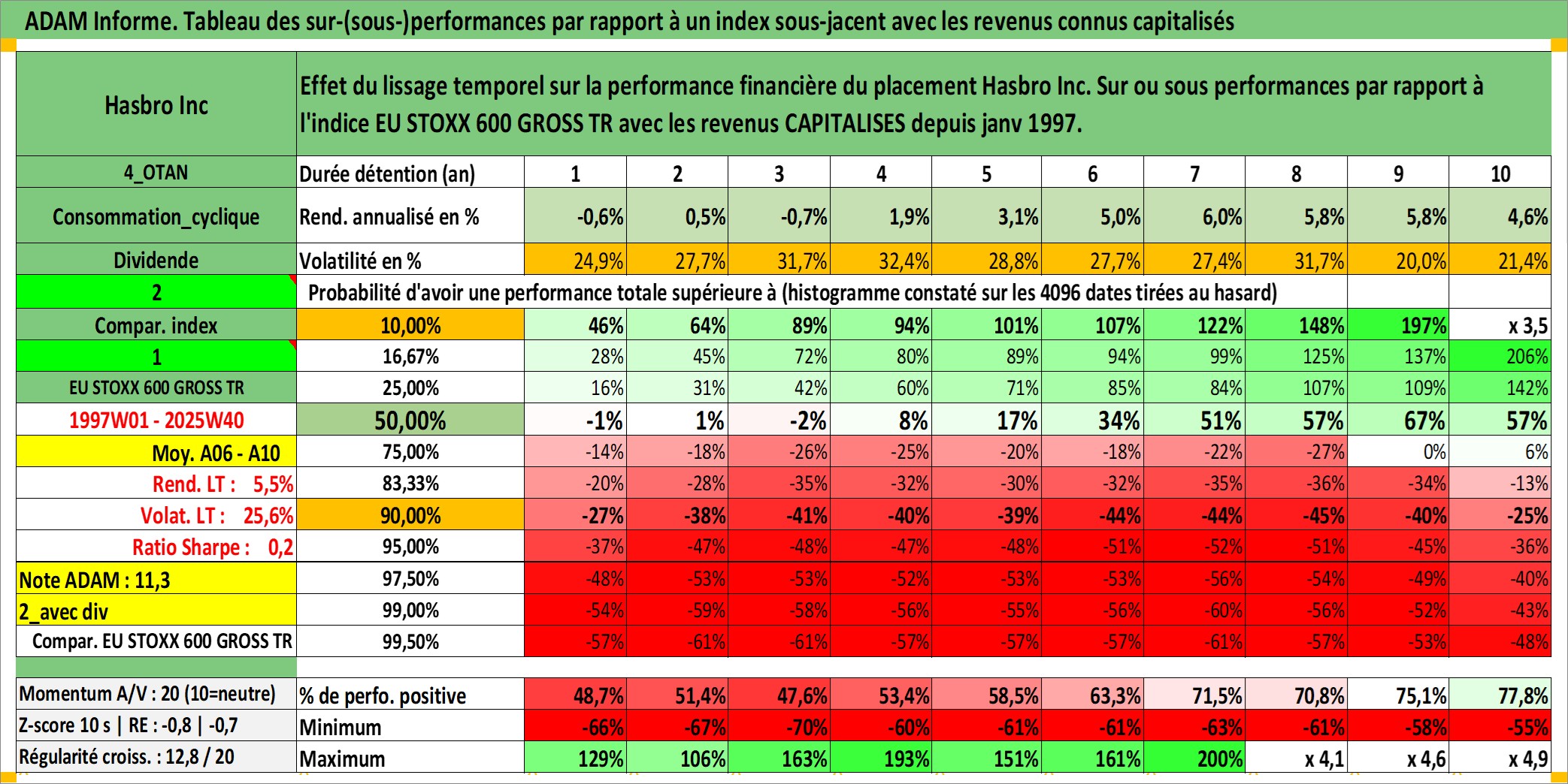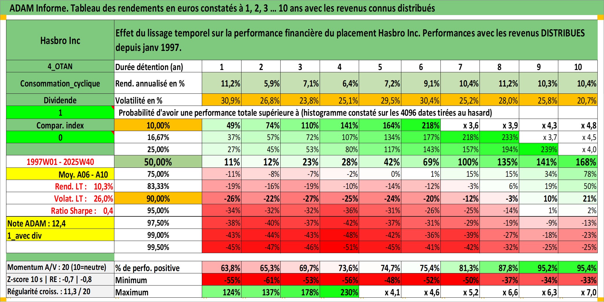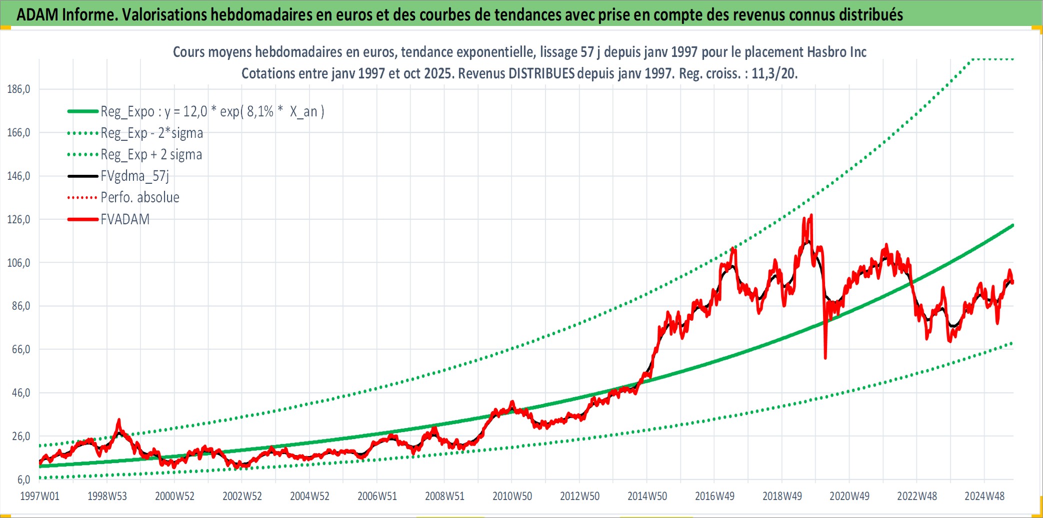 Site dédié aux investisseursPage dédiée sur site financeAnalyse des valorisations hebdomadaires de l'action Hasbro Inc. Cet actif est cote en USD. Les valorisations sont en contrevaleur EURO et couvrent les semaines 1997W01 a 2025W40. Les revenus de cet actif financier sont pris en compte depuis la semaine 1997W05. La note globale ESG de cet actif est estimee a 19.0 (apres rebasage entre 0 et 20).