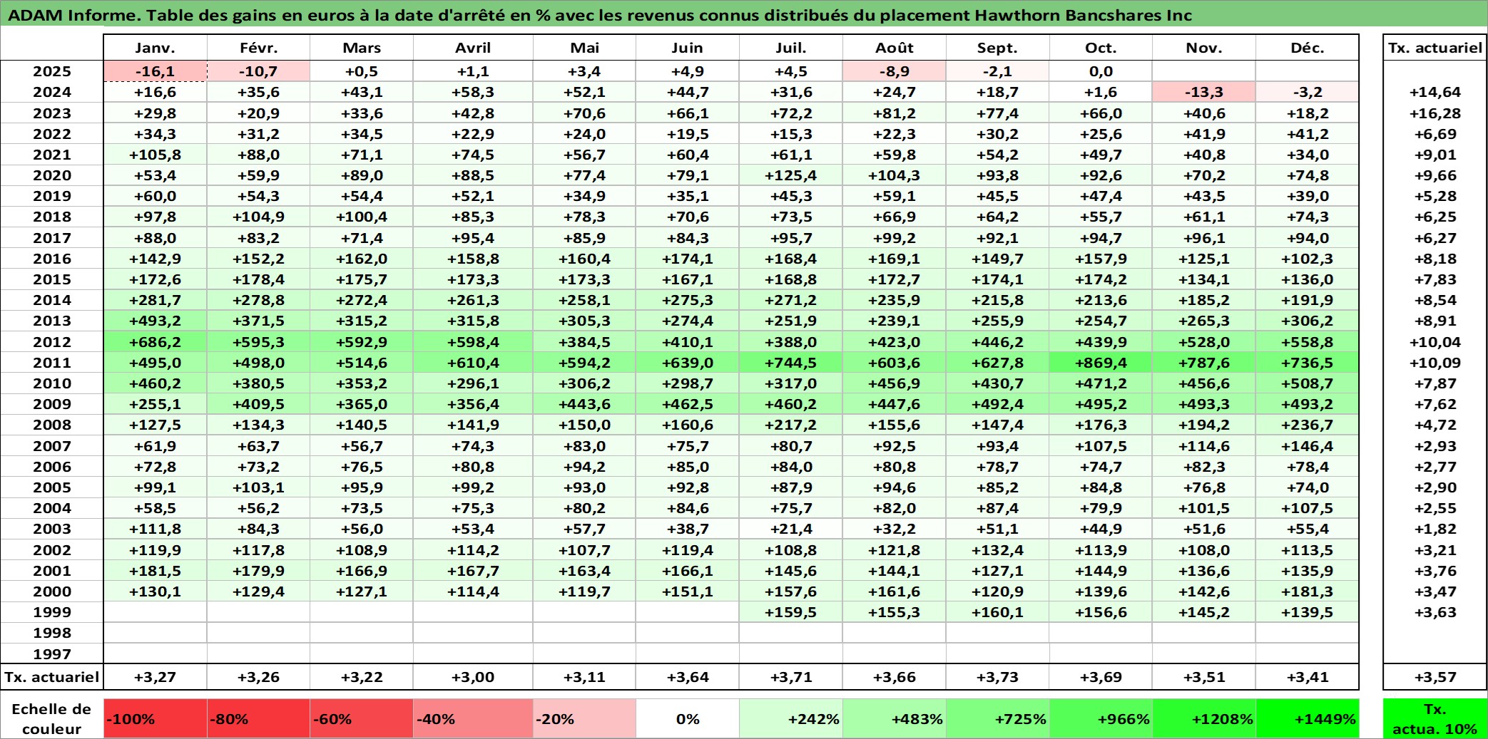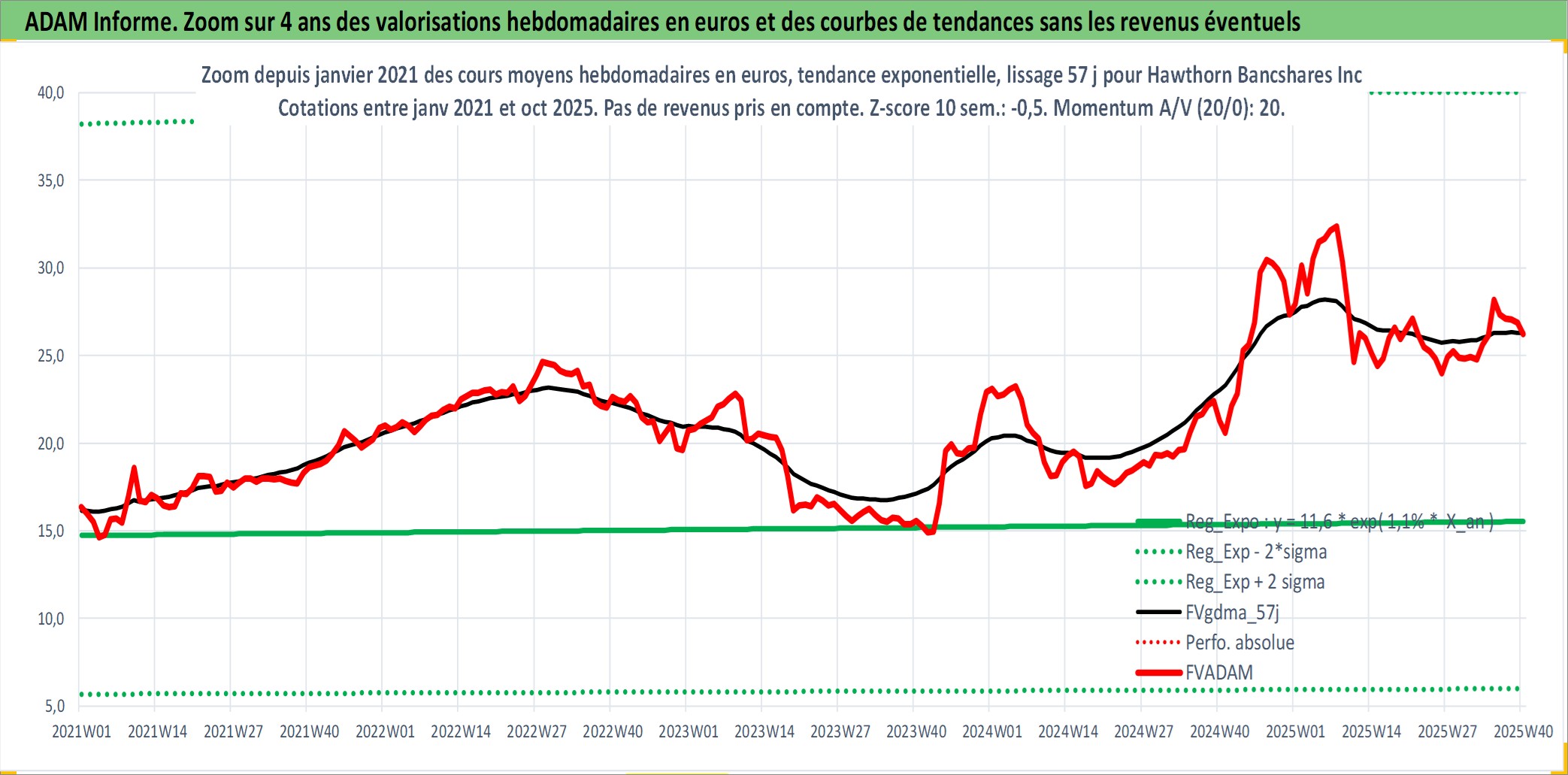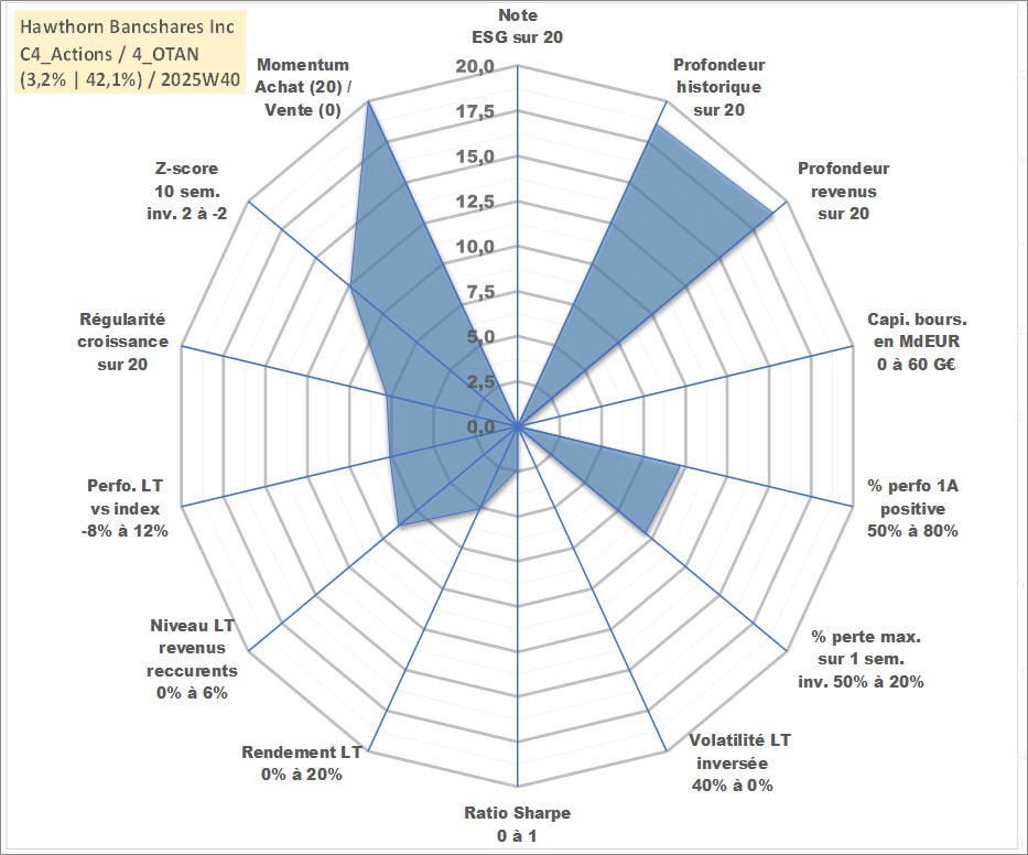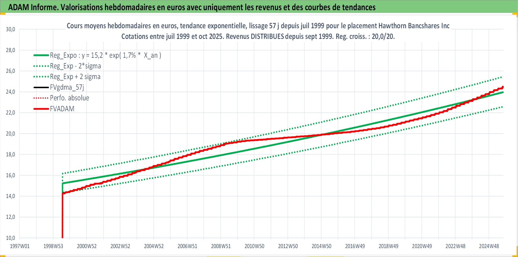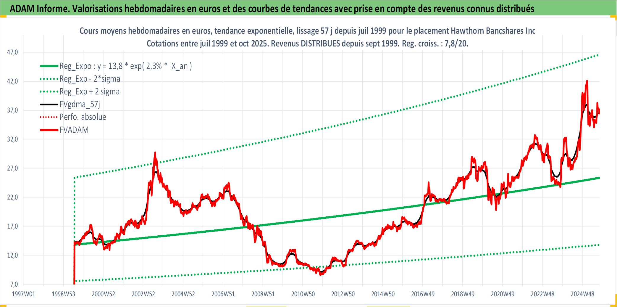 Site dédié aux investisseursPage dédiée sur site financeAnalyse des valorisations hebdomadaires de l'action Hawthorn Bancshares Inc. Cet actif est cote en USD. Les valorisations sont en contrevaleur EURO et couvrent les semaines 1999W29 a 2025W40. Les revenus de cet actif financier sont pris en compte depuis la semaine 1999W37. La note ESG de cet actif n'est pas connue.