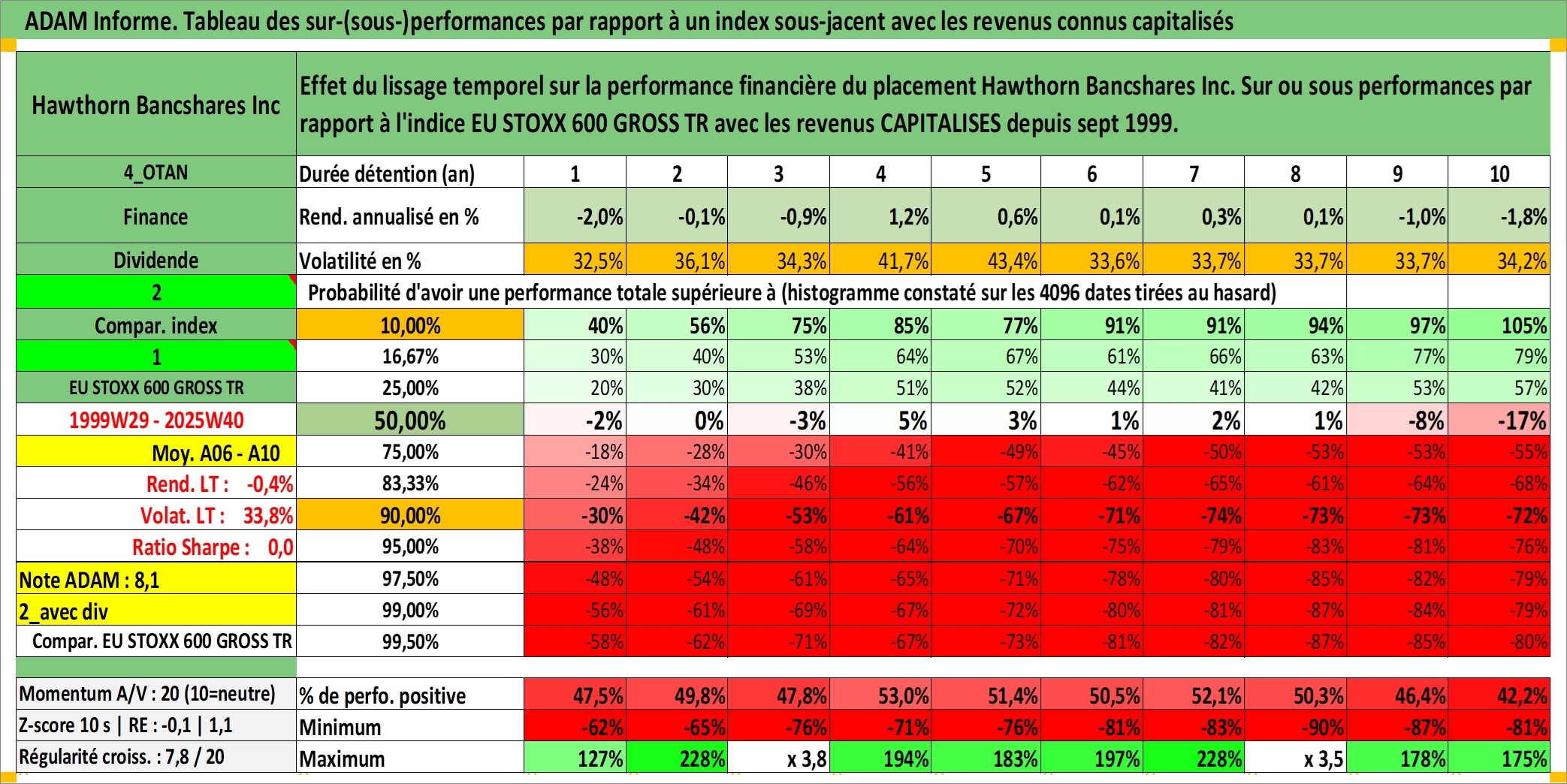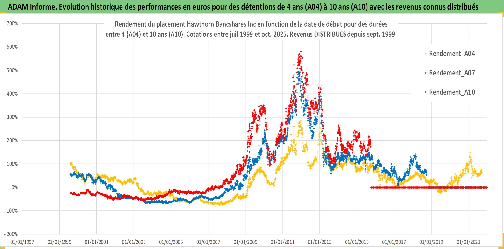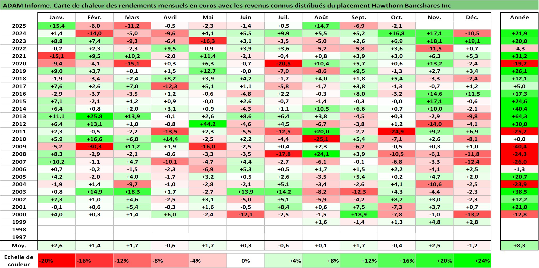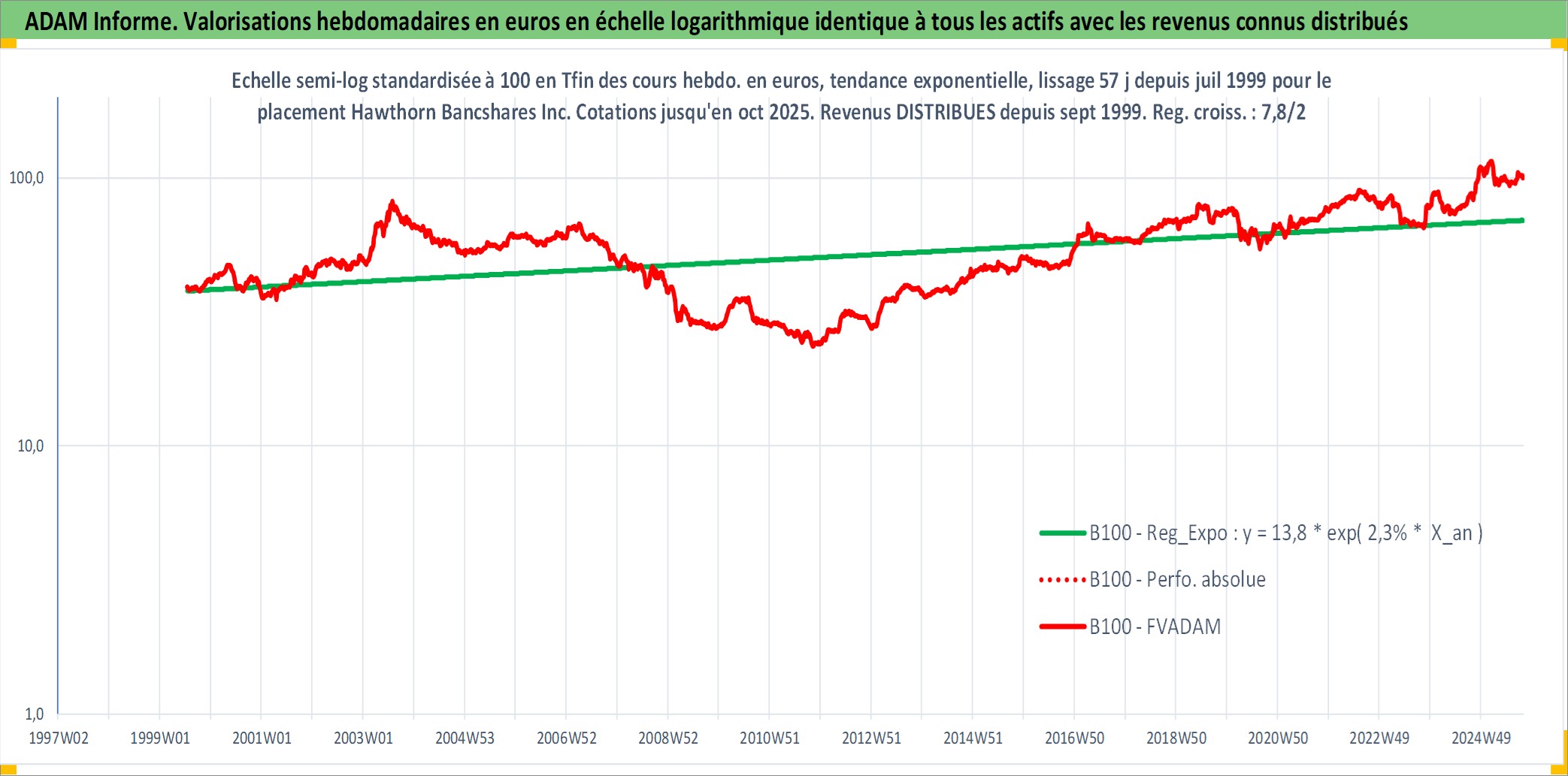 Site dédié aux investisseursPage dédiée sur site financeAnalyse des valorisations hebdomadaires de l'action Hawthorn Bancshares Inc. Cet actif est cote en USD. Les valorisations sont en contrevaleur EURO et couvrent les semaines 1999W29 a 2025W40. Les revenus de cet actif financier sont pris en compte depuis la semaine 1999W37. La note ESG de cet actif n'est pas connue.