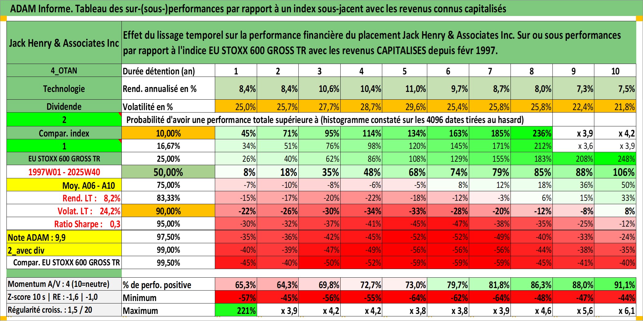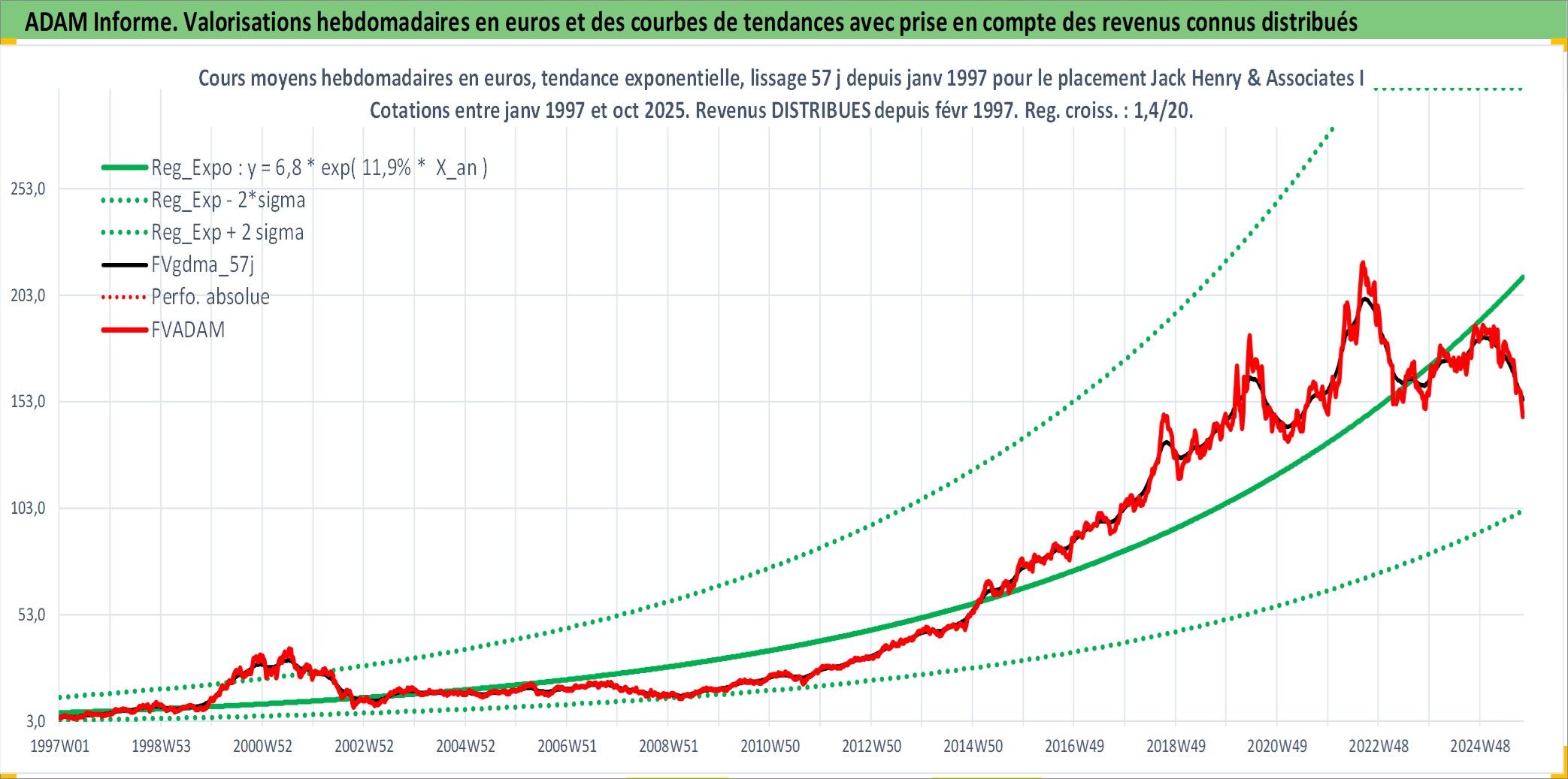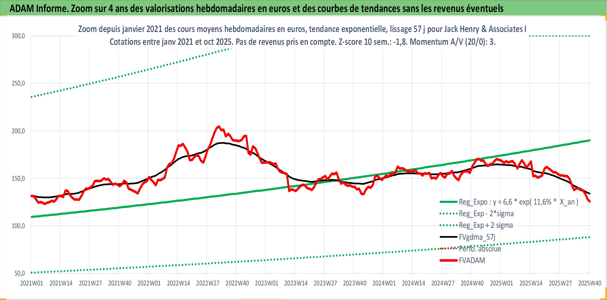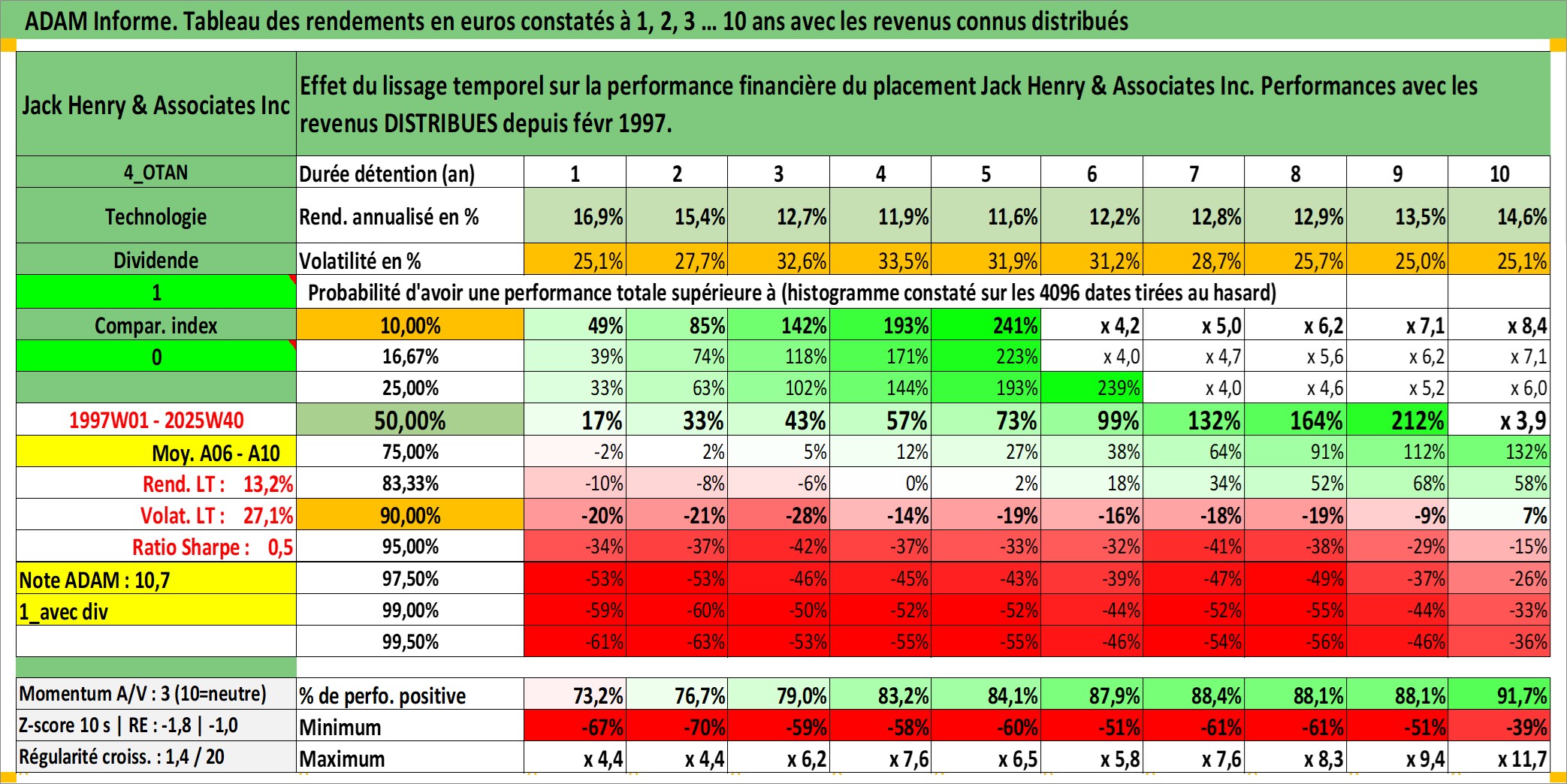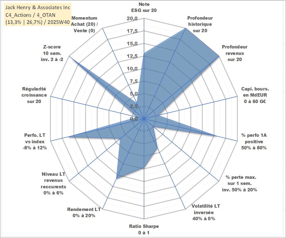 Site dédié aux investisseursPage dédiée sur site financeAnalyse des valorisations hebdomadaires de l'action Jack Henry & Associates Inc. Cet actif est cote en USD. Les valorisations sont en contrevaleur EURO et couvrent les semaines 1997W01 a 2025W40. Les revenus de cet actif financier sont pris en compte depuis la semaine 1997W08. La note globale ESG de cet actif est estimee a 13.0 (apres rebasage entre 0 et 20).