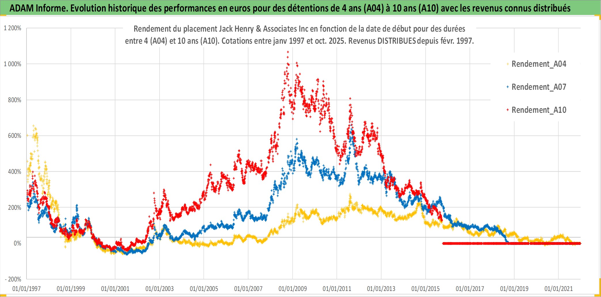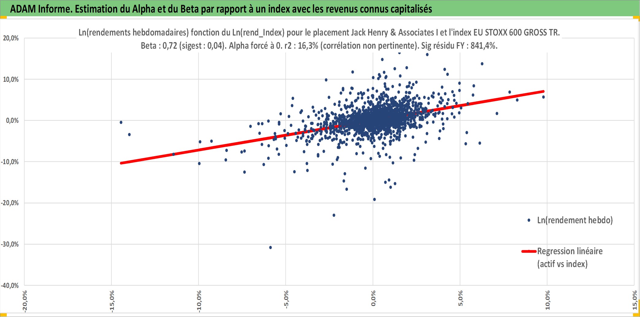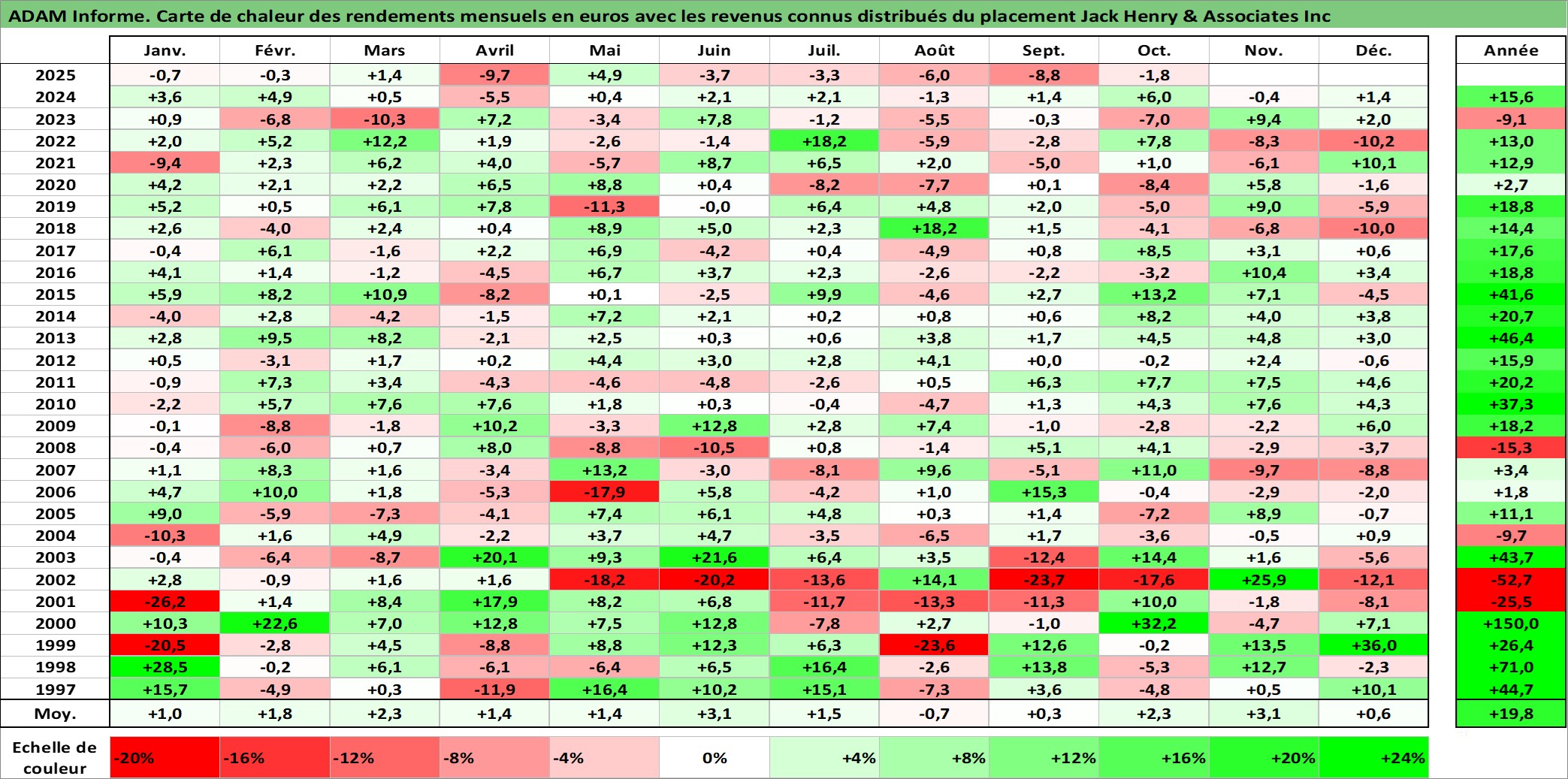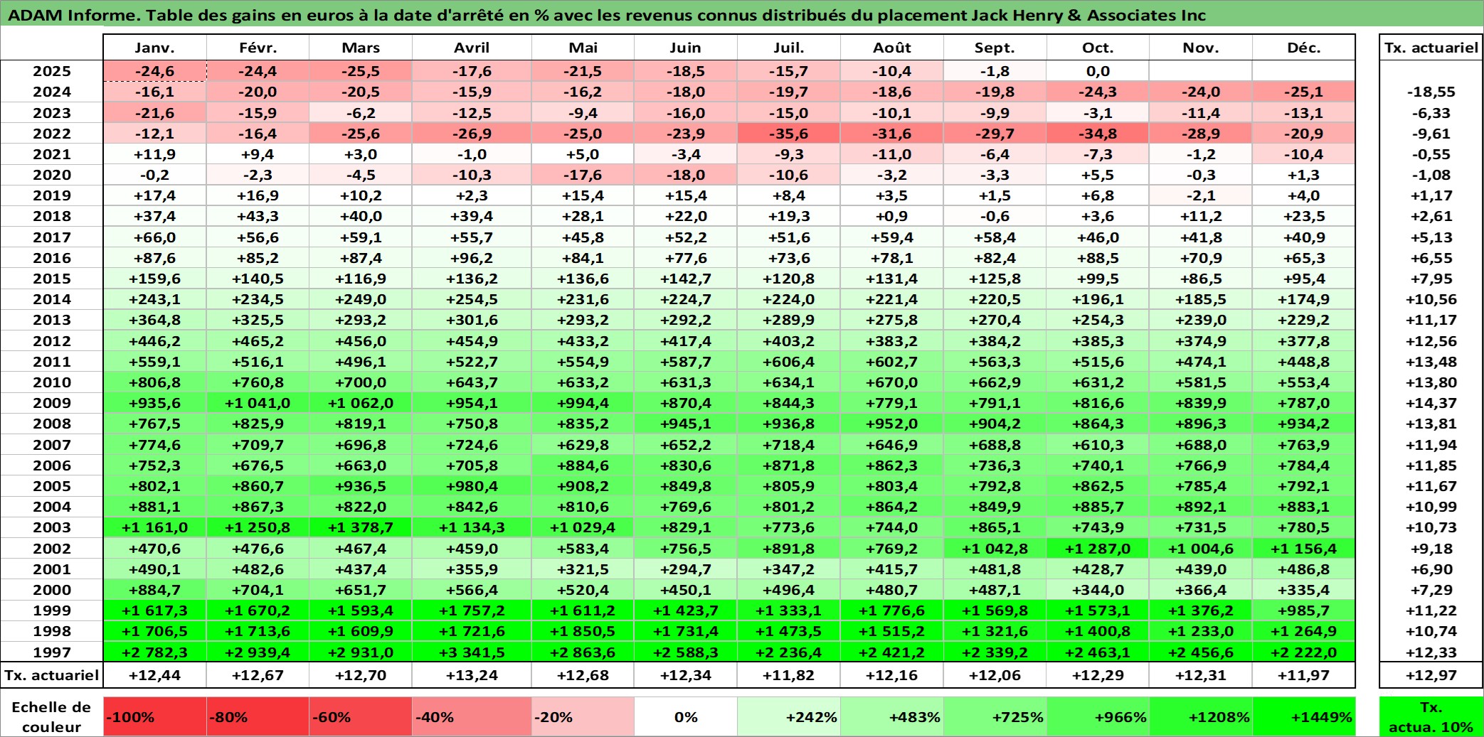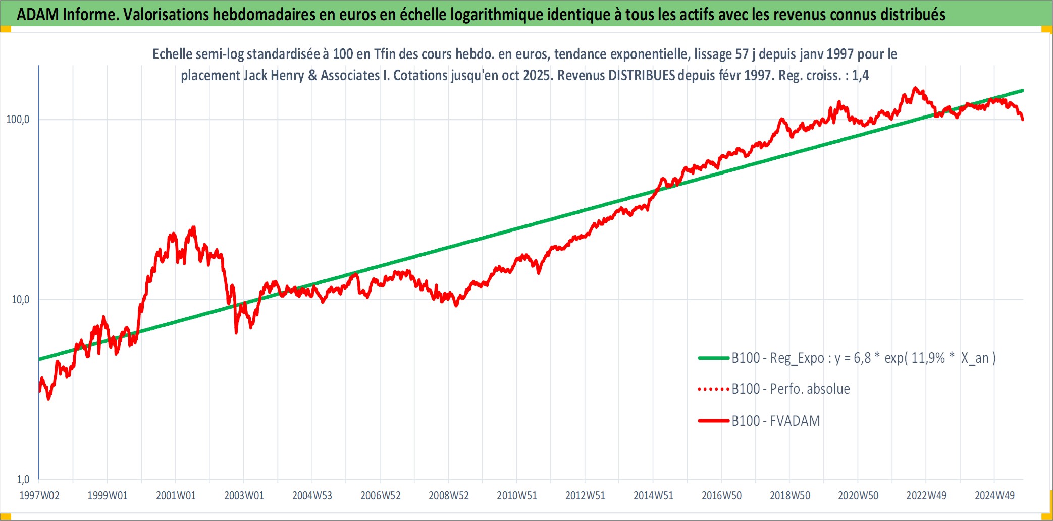 Site dédié aux investisseursPage dédiée sur site financeAnalyse des valorisations hebdomadaires de l'action Jack Henry & Associates Inc. Cet actif est cote en USD. Les valorisations sont en contrevaleur EURO et couvrent les semaines 1997W01 a 2025W40. Les revenus de cet actif financier sont pris en compte depuis la semaine 1997W08. La note globale ESG de cet actif est estimee a 13.0 (apres rebasage entre 0 et 20).