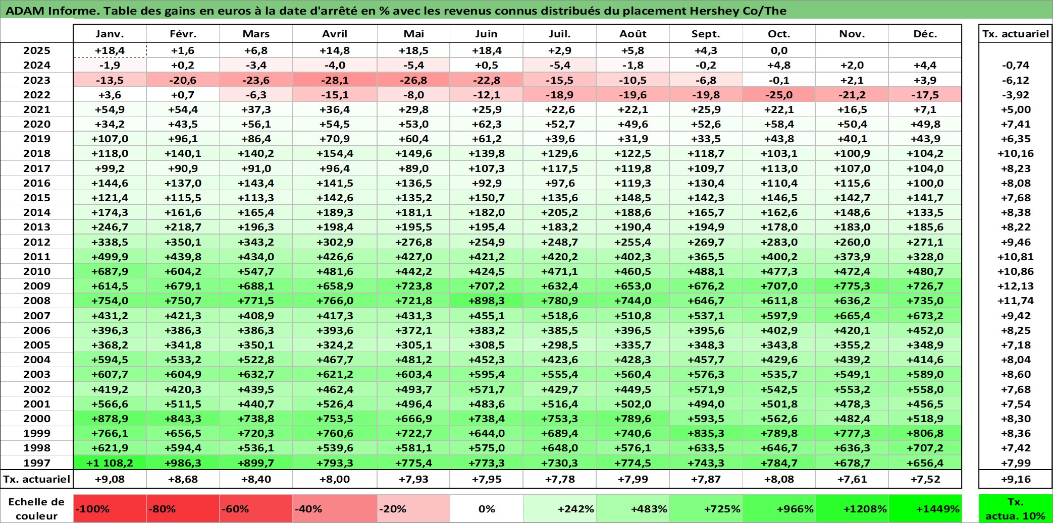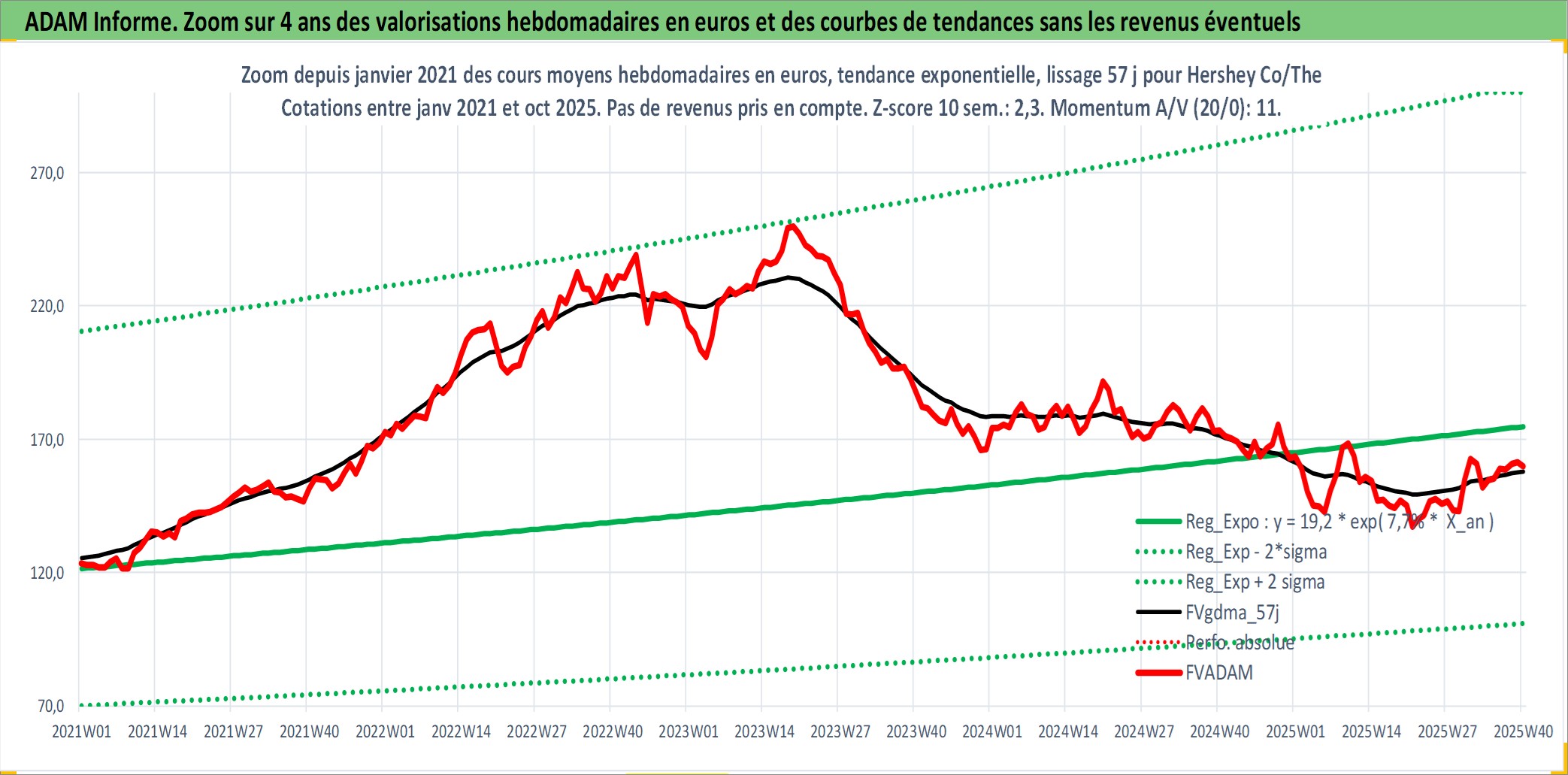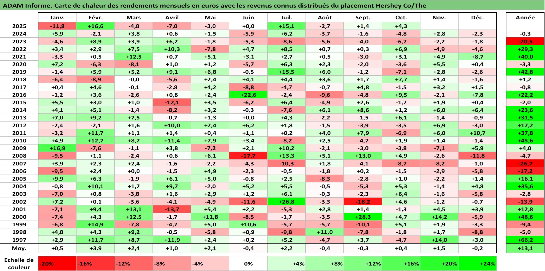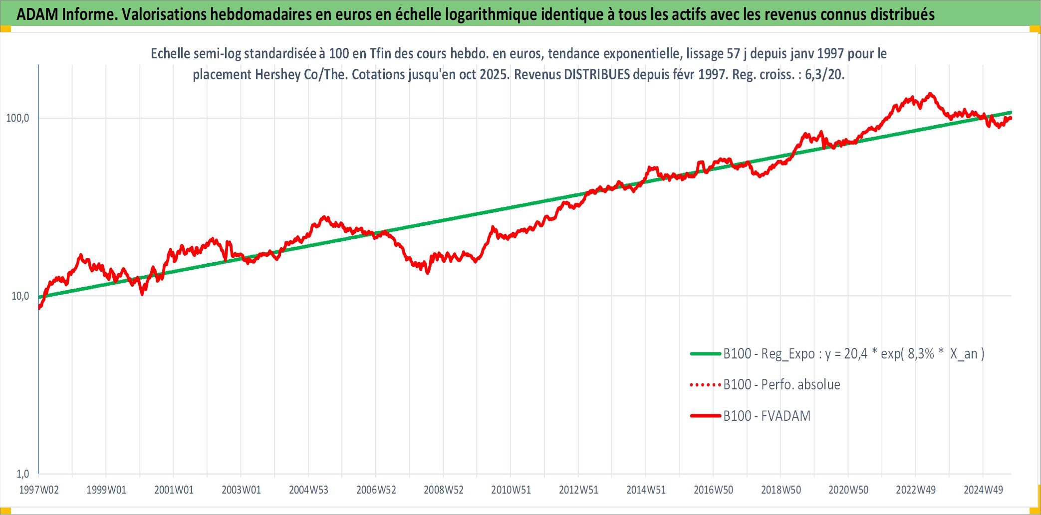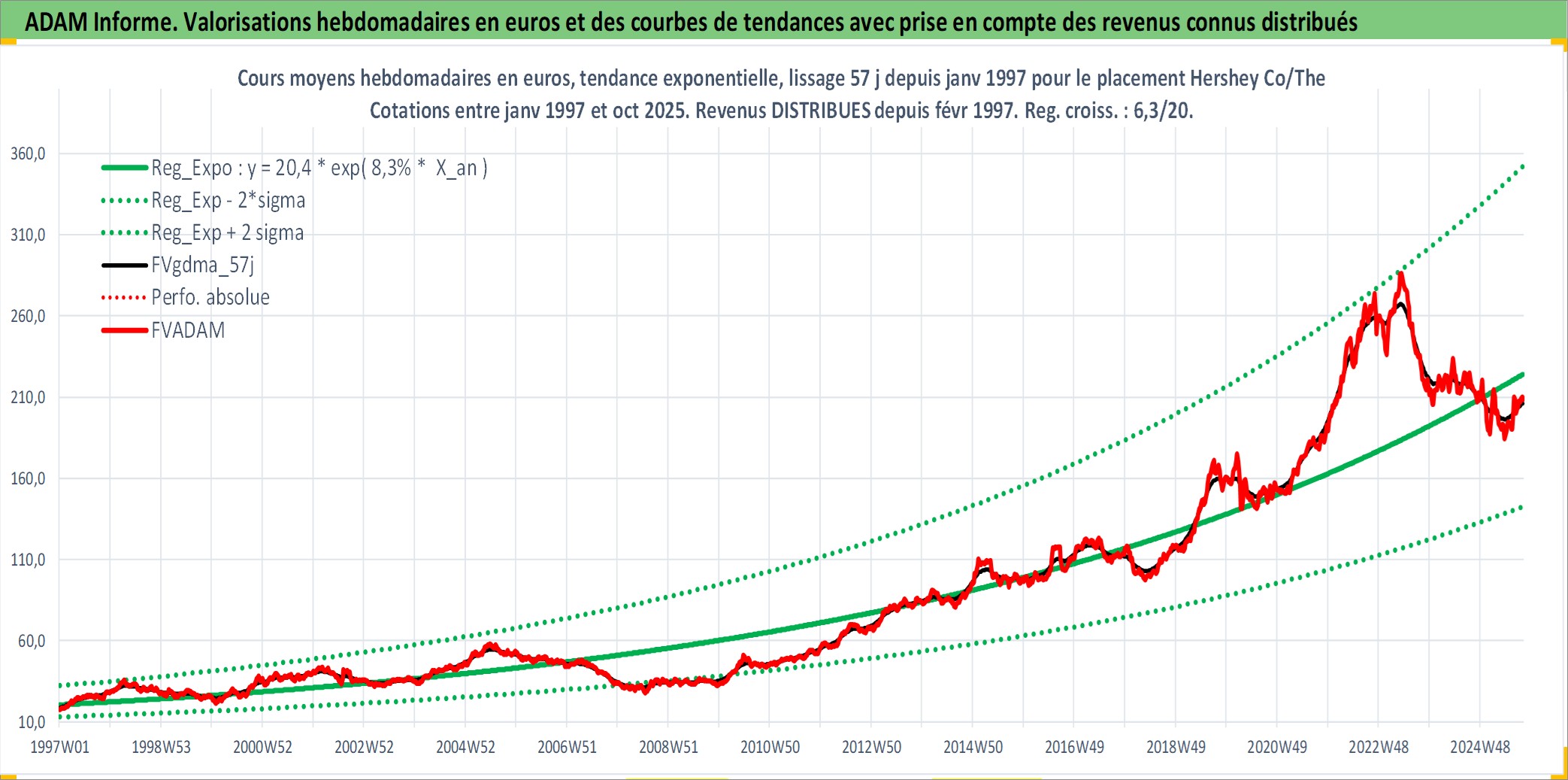 Site dédié aux investisseursPage dédiée sur site financeAnalyse des valorisations hebdomadaires de l'action Hershey Co/The. Cet actif est cote en USD. Les valorisations sont en contrevaleur EURO et couvrent les semaines 1997W01 a 2025W40. Les revenus de cet actif financier sont pris en compte depuis la semaine 1997W08. La note globale ESG de cet actif est estimee a 7.0 (apres rebasage entre 0 et 20).