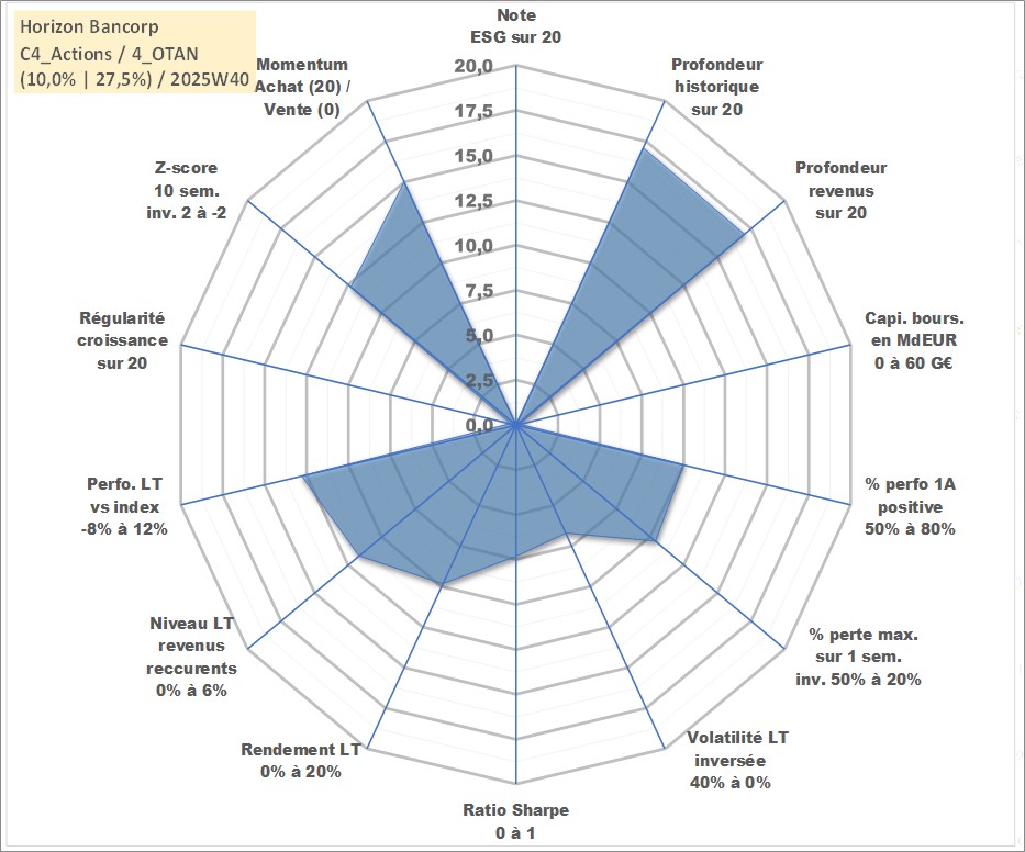 Site dédié aux investisseursPage dédiée sur site financeAnalyse des valorisations hebdomadaires de l'action Horizon Bancorp. Cet actif est cote en USD. Les valorisations sont en contrevaleur EURO et couvrent les semaines 2002W02 a 2025W40. Les revenus de cet actif financier sont pris en compte depuis la semaine 2002W13. La note ESG de cet actif n'est pas connue.