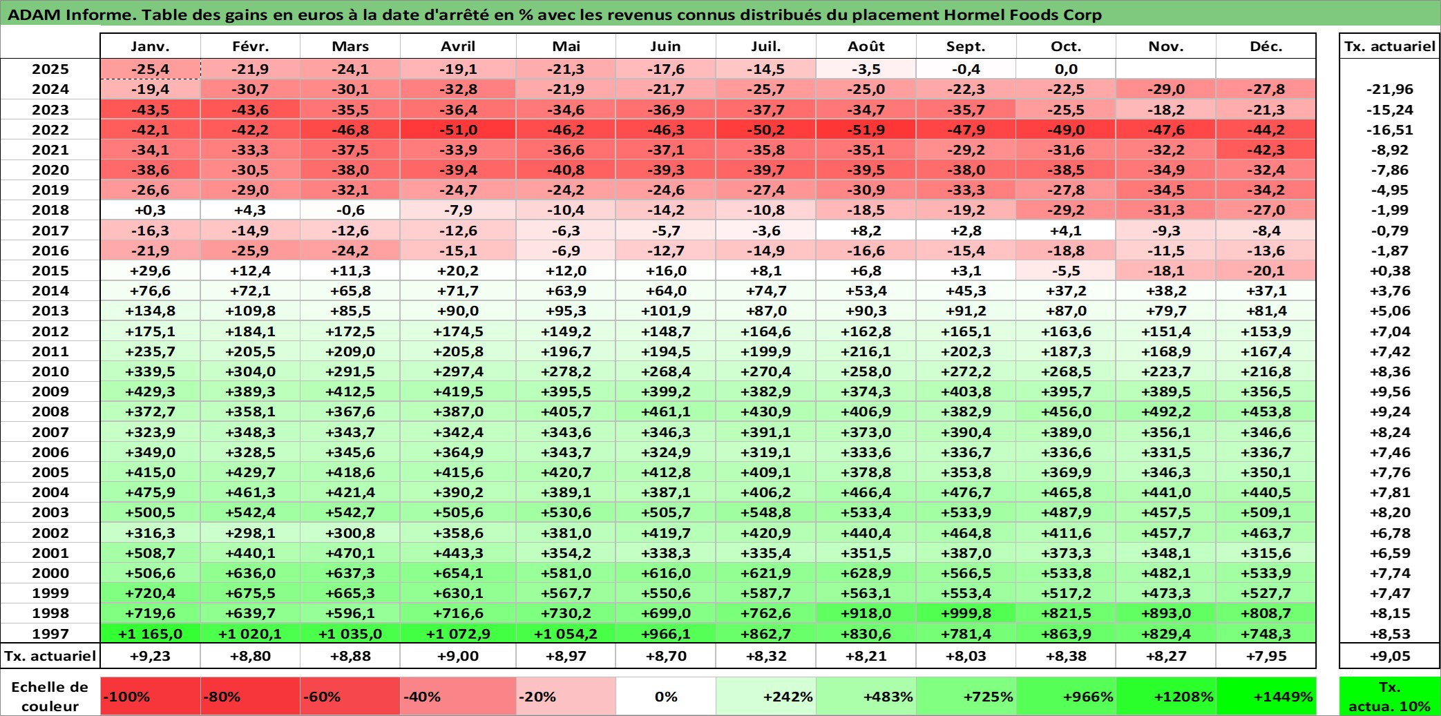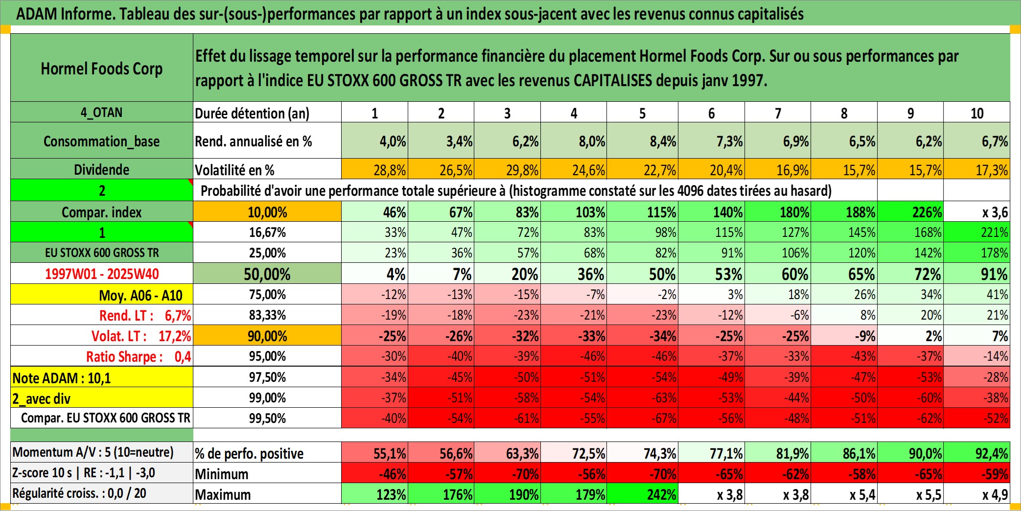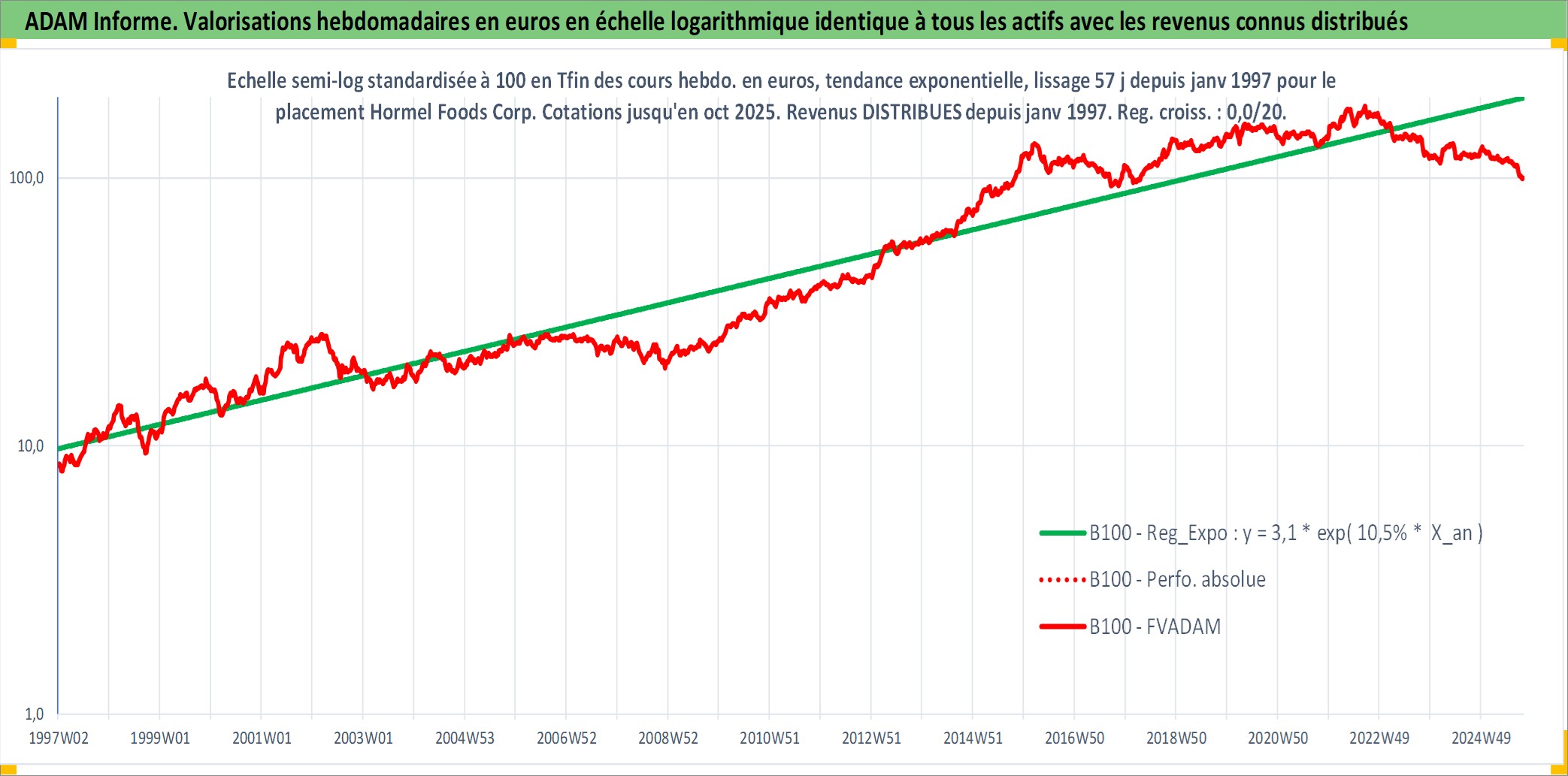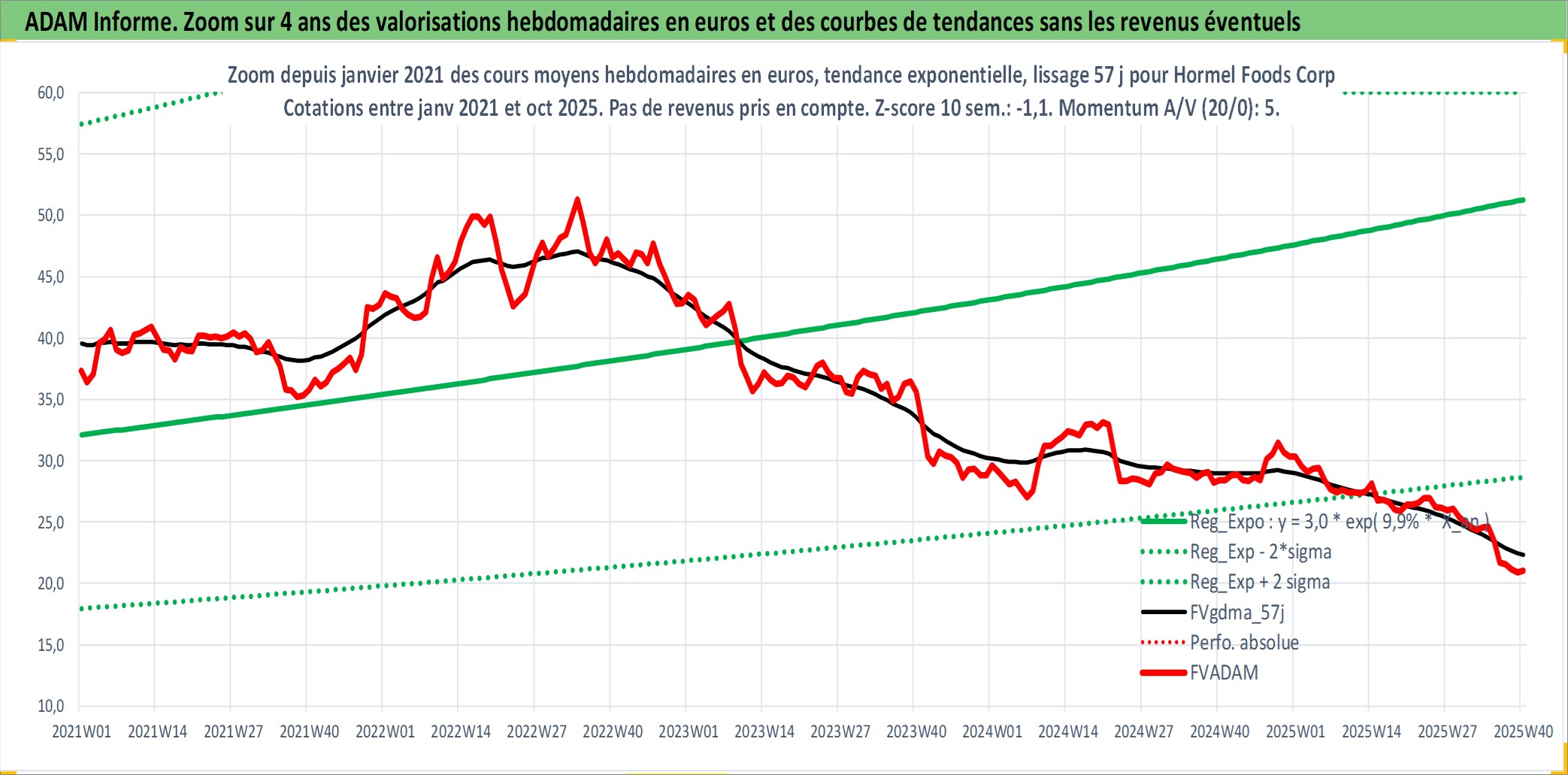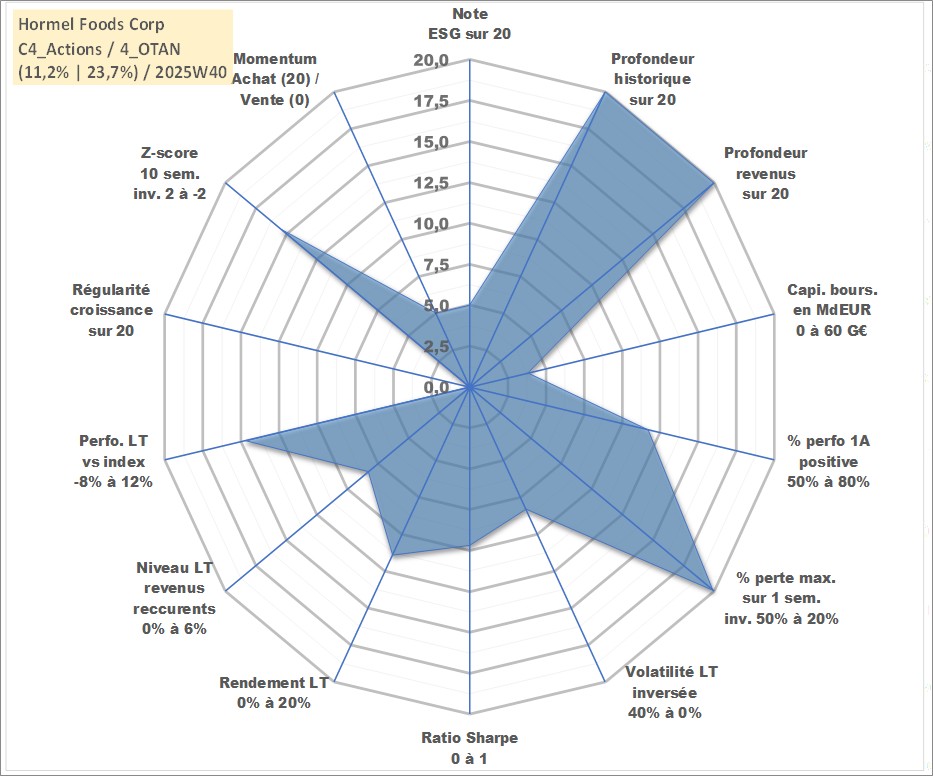 Site dédié aux investisseursPage dédiée sur site financeAnalyse des valorisations hebdomadaires de l'action Hormel Foods Corp. Cet actif est cote en USD. Les valorisations sont en contrevaleur EURO et couvrent les semaines 1997W01 a 2025W40. Les revenus de cet actif financier sont pris en compte depuis la semaine 1997W03. La note globale ESG de cet actif est estimee a 5.0 (apres rebasage entre 0 et 20).