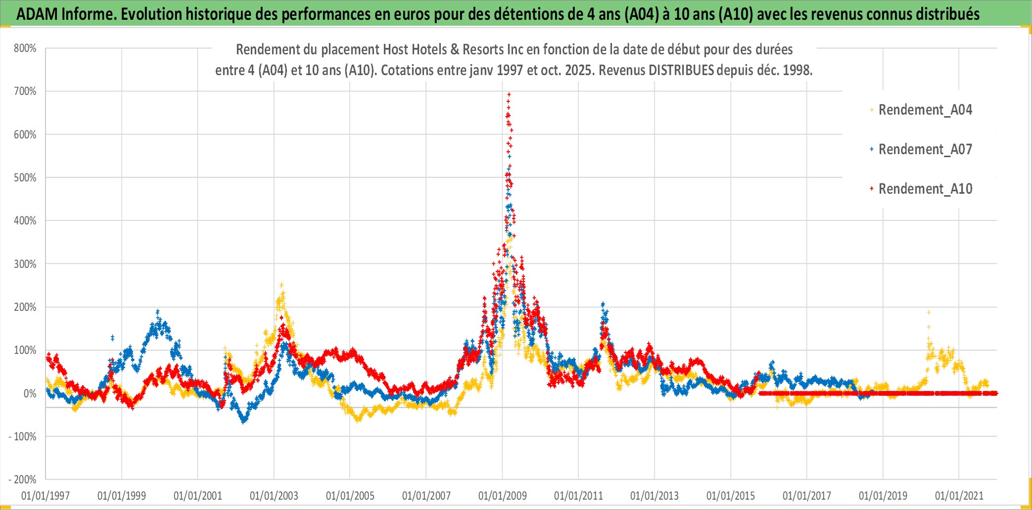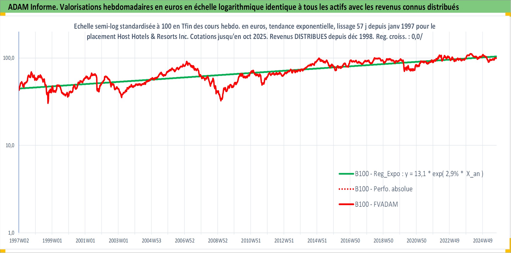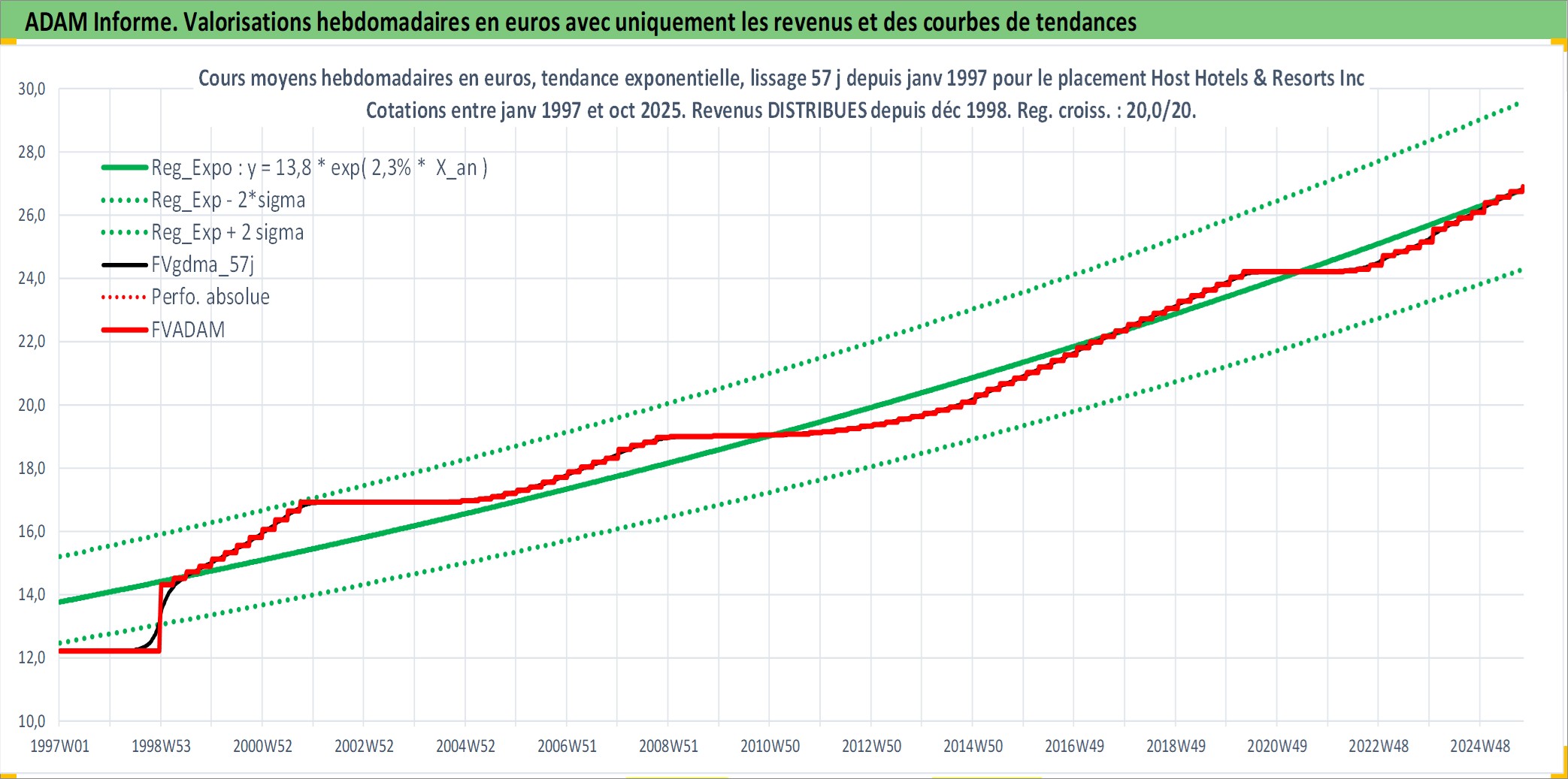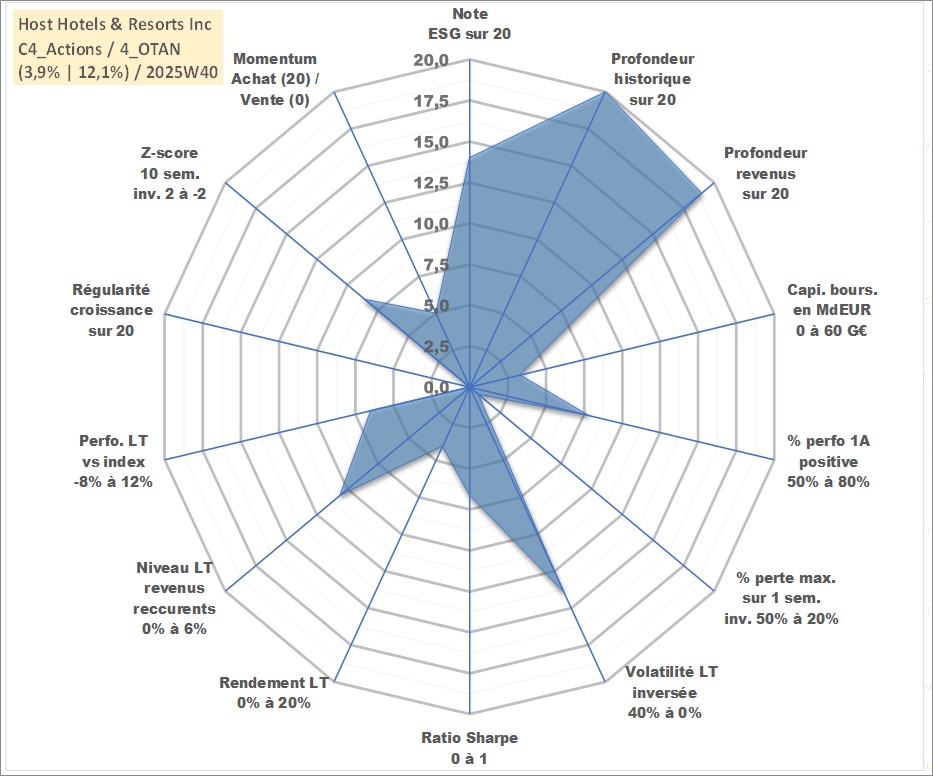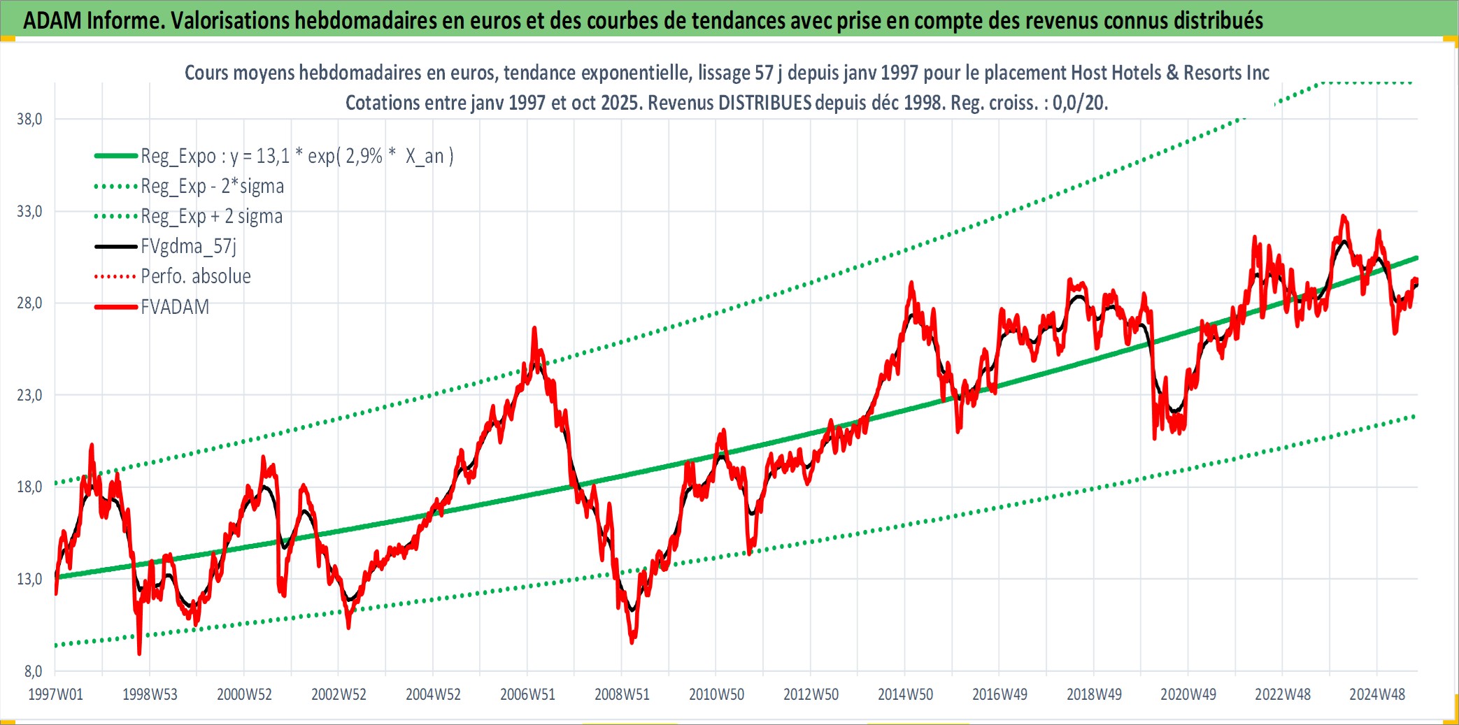 Site dédié aux investisseursPage dédiée sur site financeAnalyse des valorisations hebdomadaires de l'action Host Hotels & Resorts Inc. Cet actif est cote en USD. Les valorisations sont en contrevaleur EURO et couvrent les semaines 1997W01 a 2025W40. Les revenus de cet actif financier sont pris en compte depuis la semaine 1998W52. La note globale ESG de cet actif est estimee a 14.0 (apres rebasage entre 0 et 20).