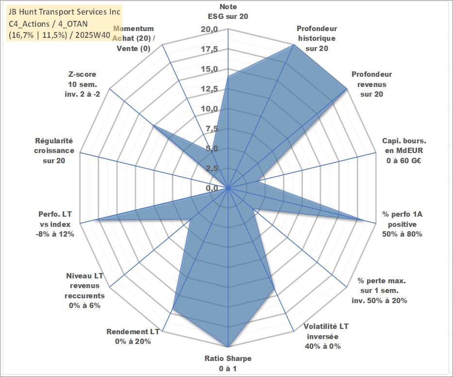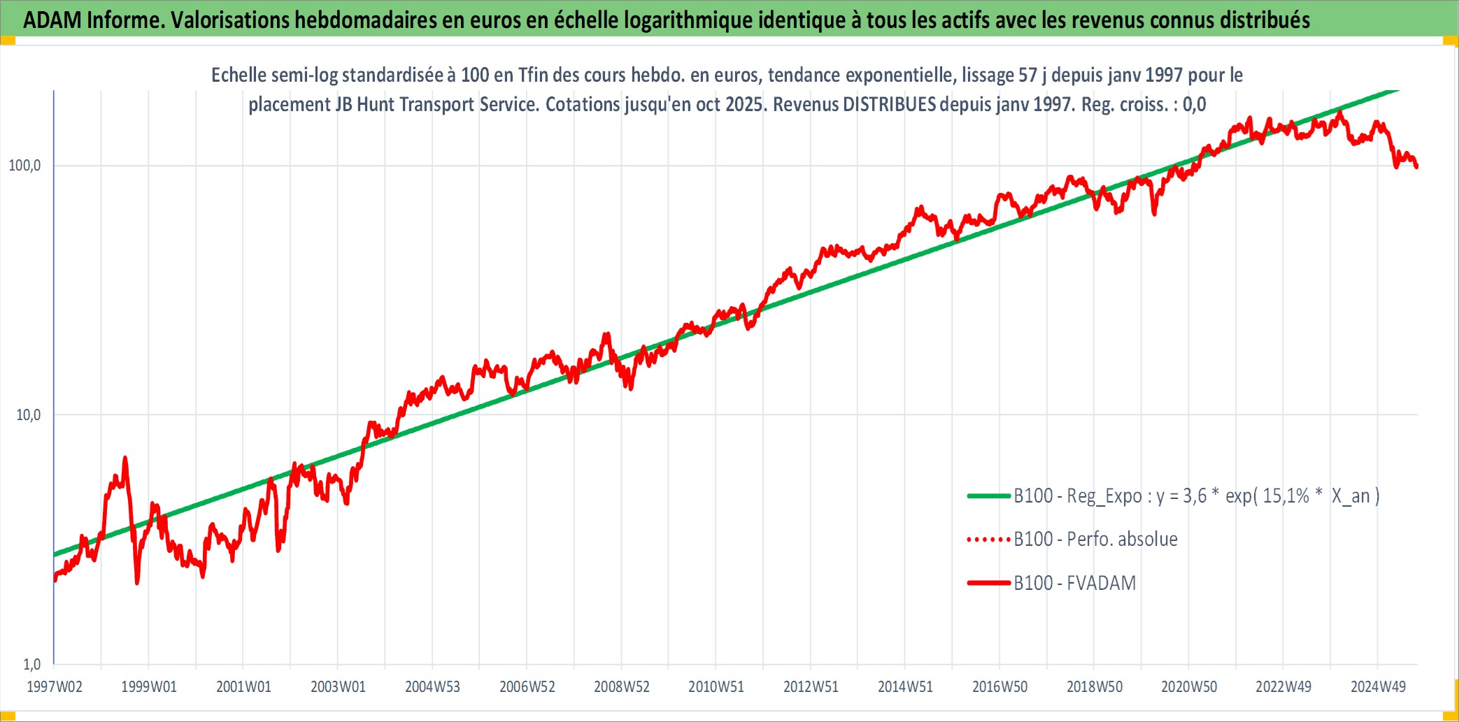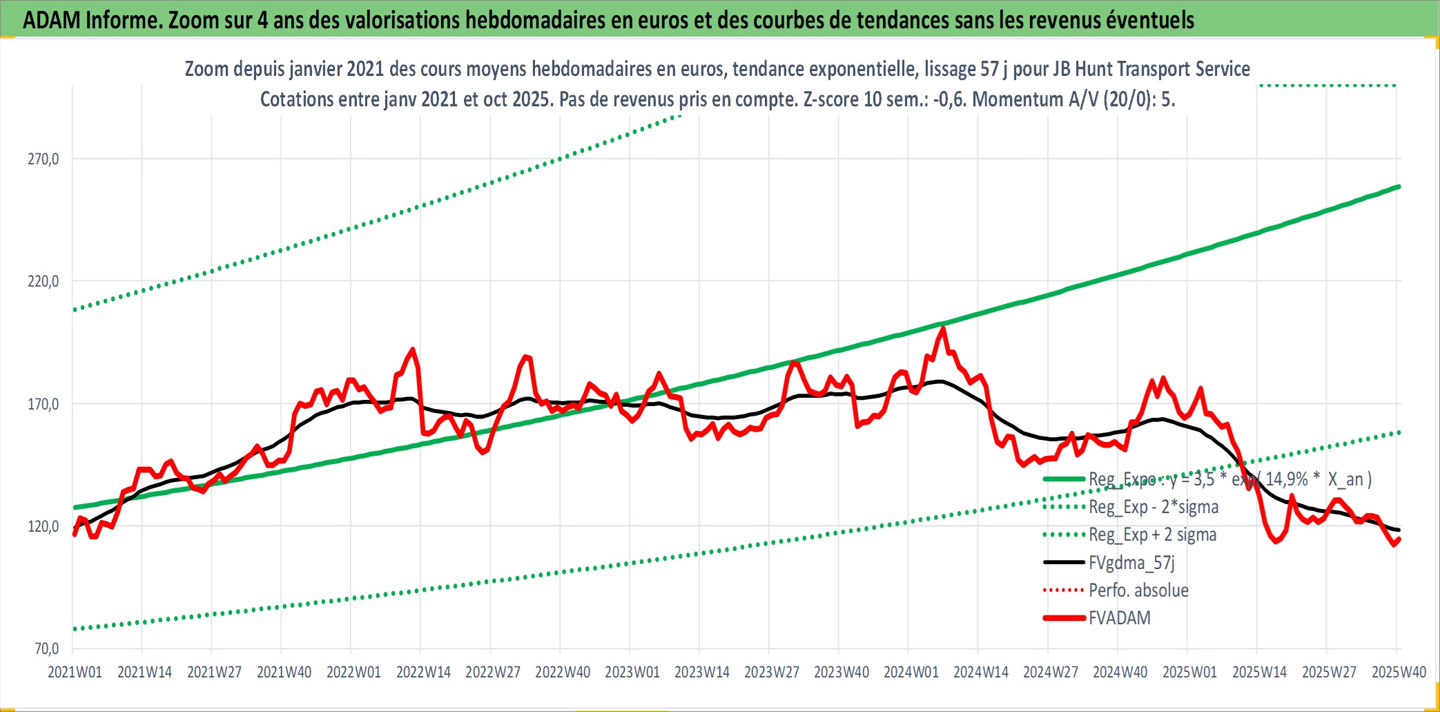 Site dédié aux investisseursPage dédiée sur site financeAnalyse des valorisations hebdomadaires de l'action JB Hunt Transport Services Inc. Cet actif est cote en USD. Les valorisations sont en contrevaleur EURO et couvrent les semaines 1997W01 a 2025W40. Les revenus de cet actif financier sont pris en compte depuis la semaine 1997W05. La note globale ESG de cet actif est estimee a 14.0 (apres rebasage entre 0 et 20).