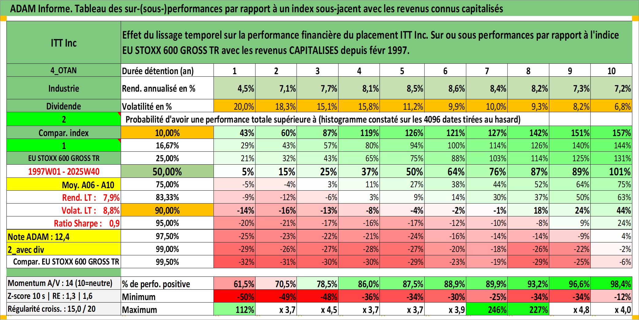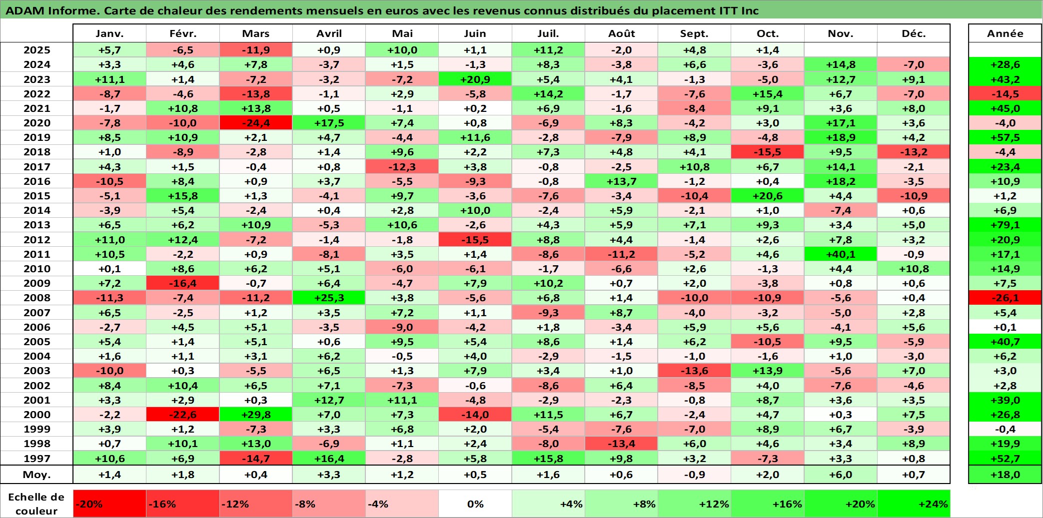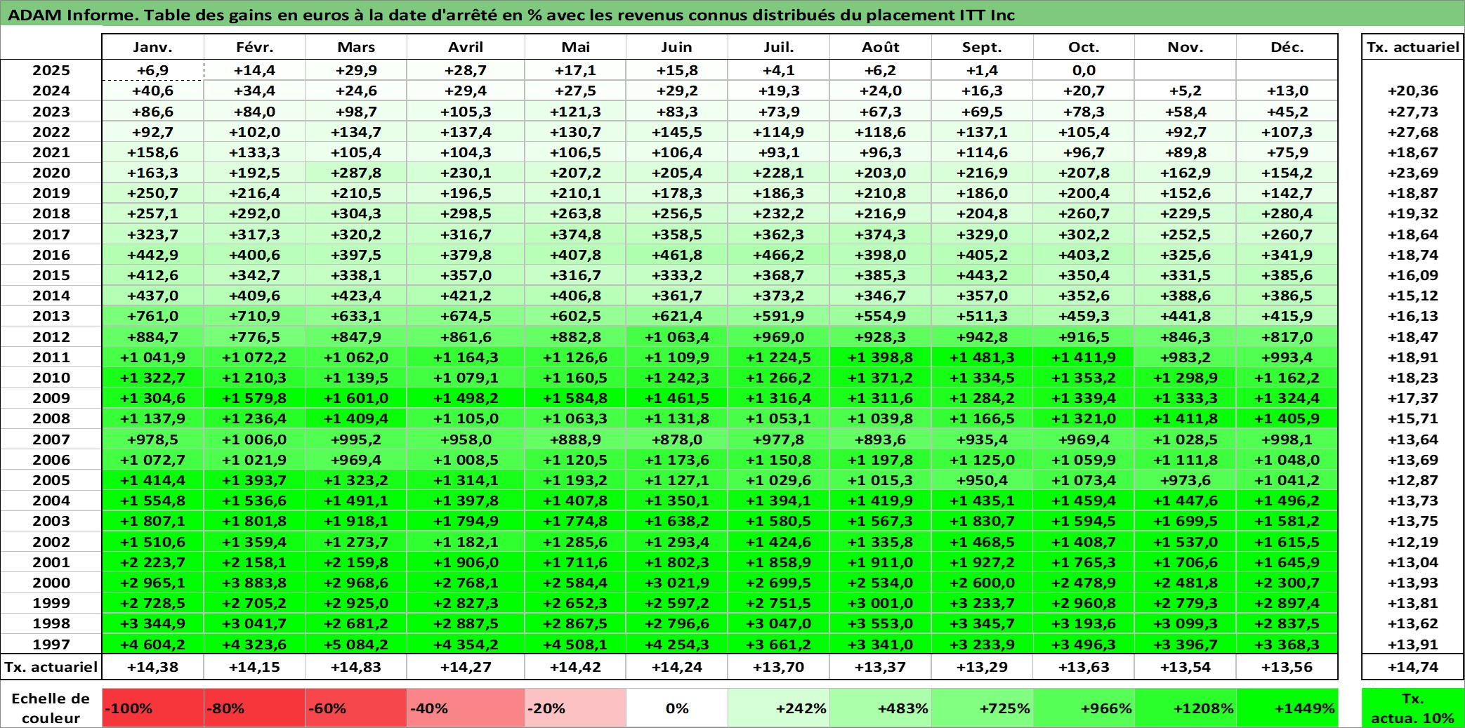 Site dédié aux investisseursPage dédiée sur site financeAnalyse des valorisations hebdomadaires de l'action ITT Inc. Cet actif est cote en USD. Les valorisations sont en contrevaleur EURO et couvrent les semaines 1997W01 a 2025W40. Les revenus de cet actif financier sont pris en compte depuis la semaine 1997W09. La note ESG de cet actif n'est pas connue.