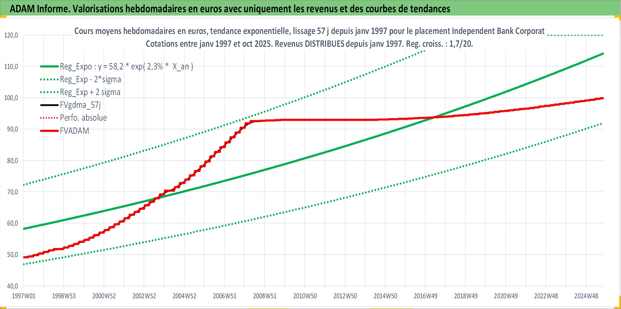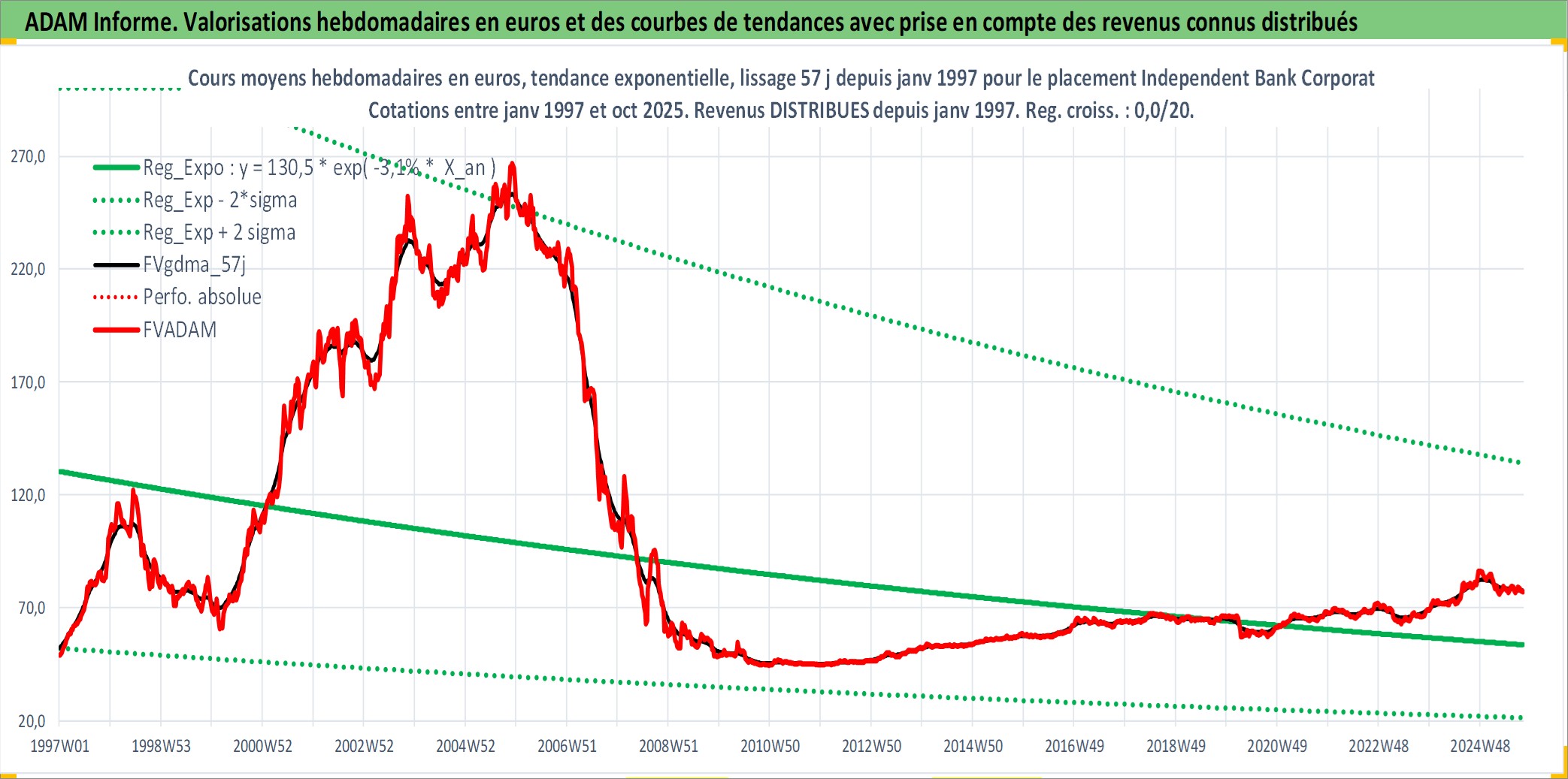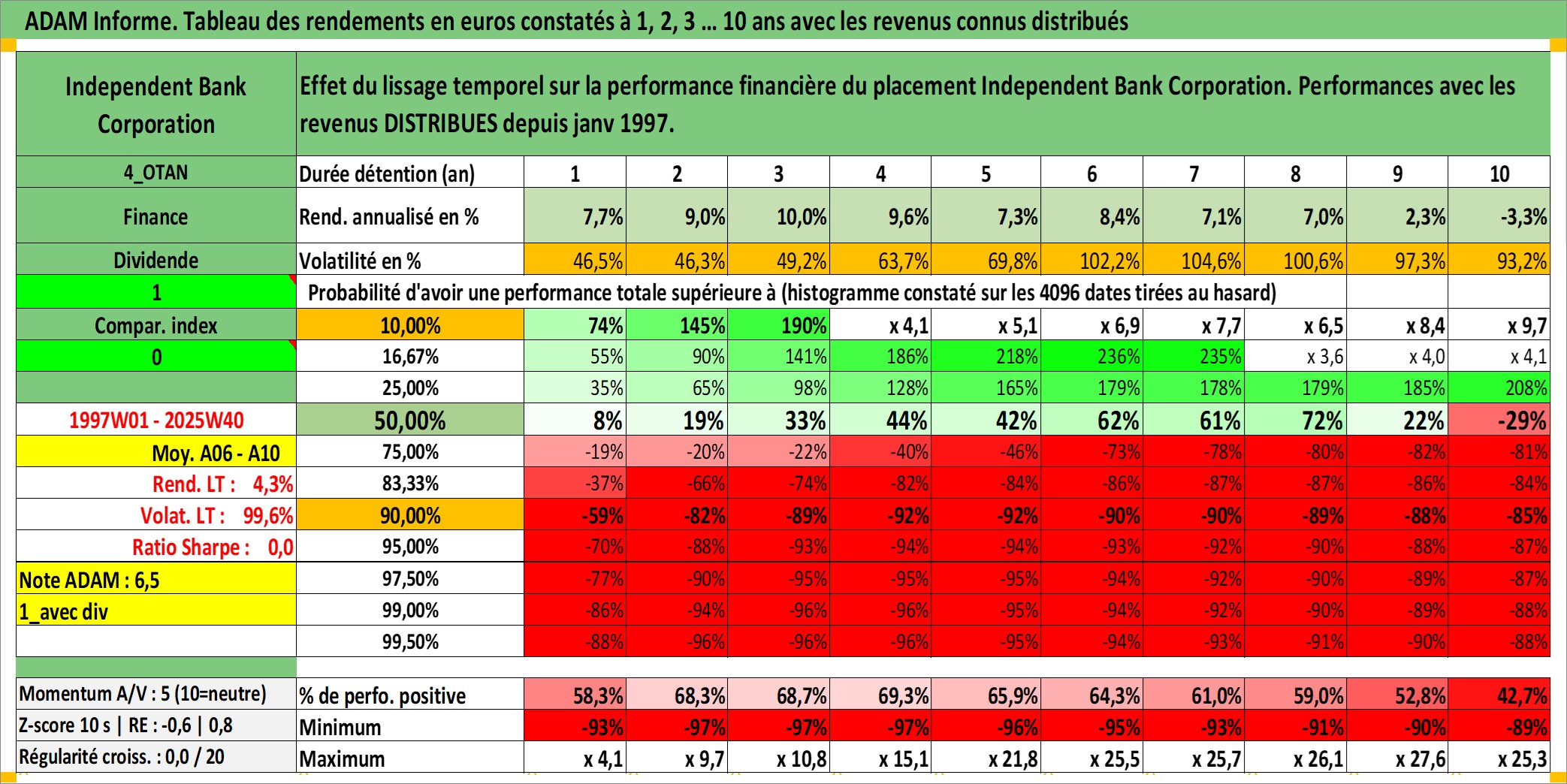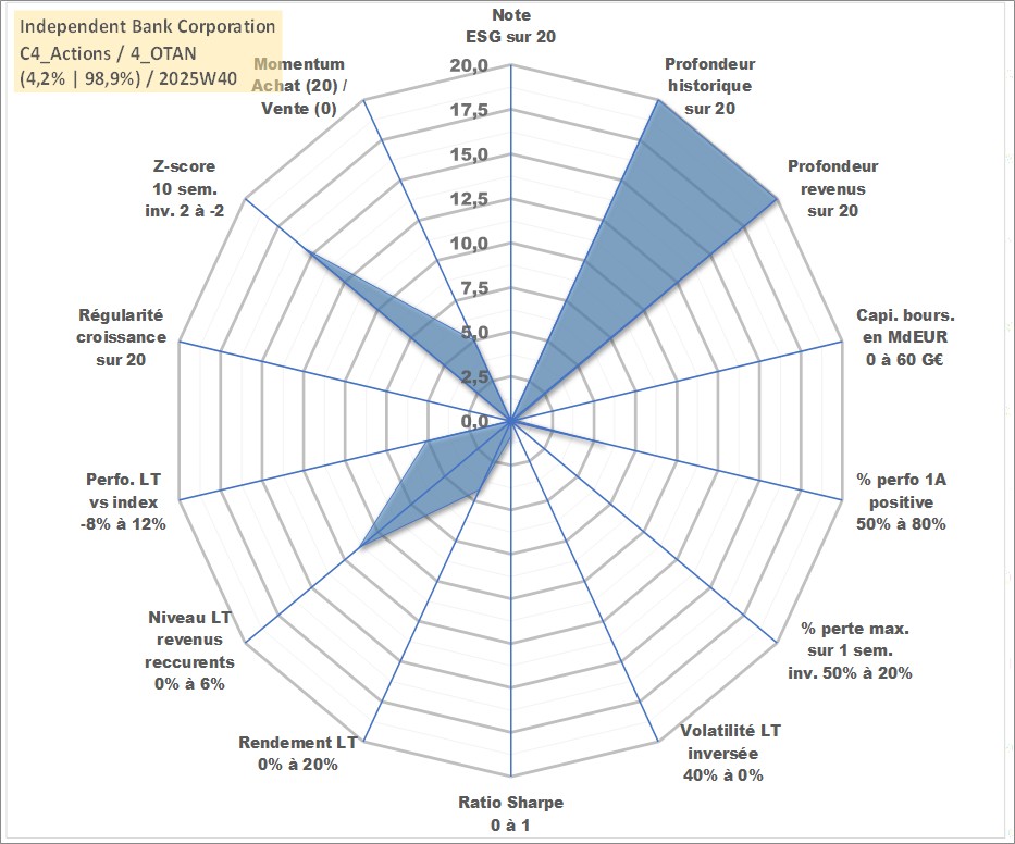 Site dédié aux investisseursPage dédiée sur site financeAnalyse des valorisations hebdomadaires de l'action Independent Bank Corporation. Cet actif est cote en USD. Les valorisations sont en contrevaleur EURO et couvrent les semaines 1997W01 a 2025W40. Les revenus de cet actif financier sont pris en compte depuis la semaine 1997W01. La note ESG de cet actif n'est pas connue.