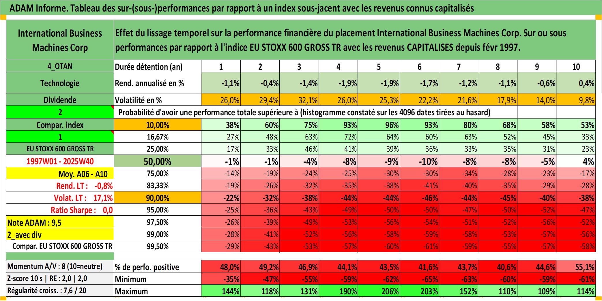 Site dédié aux investisseursPage dédiée sur site financeAnalyse des valorisations hebdomadaires de l'action International Business Machines Corp. Cet actif est cote en USD. Les valorisations sont en contrevaleur EURO et couvrent les semaines 1997W01 a 2025W40. Les revenus de cet actif financier sont pris en compte depuis la semaine 1997W06. La note globale ESG de cet actif est estimee a 13.0 (apres rebasage entre 0 et 20).