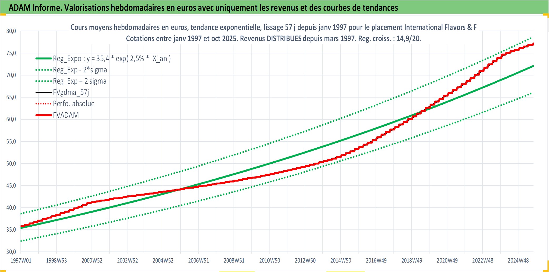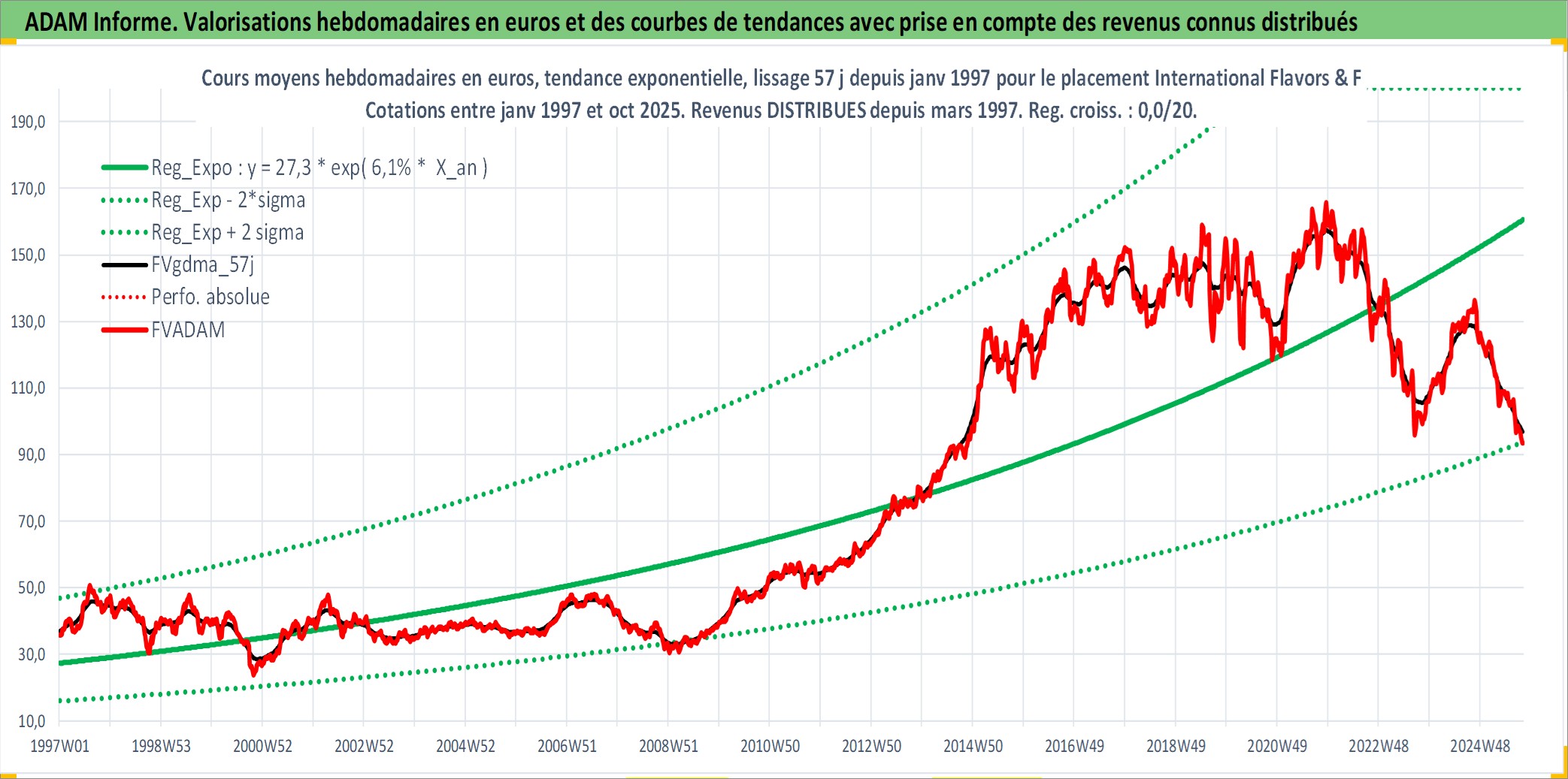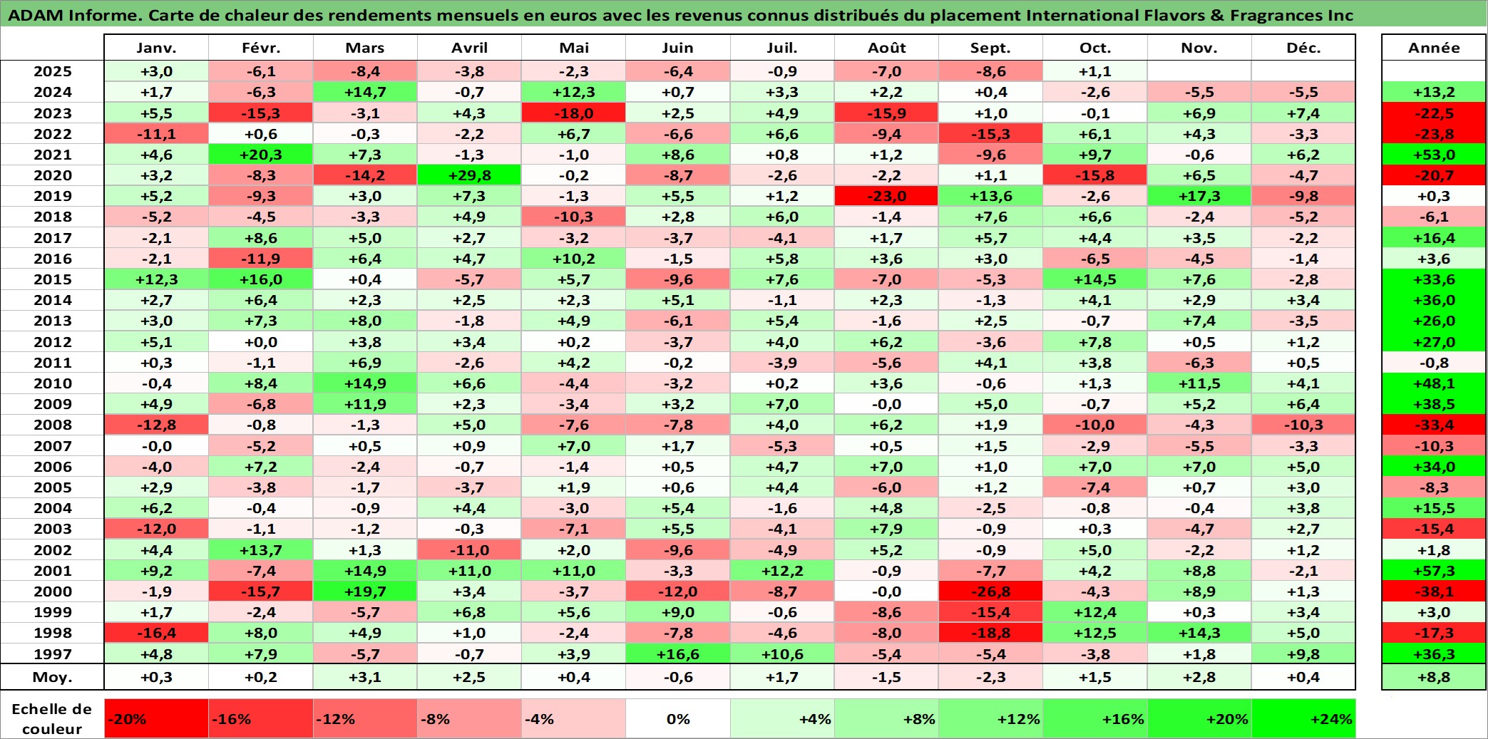 Site dédié aux investisseursPage dédiée sur site financeAnalyse des valorisations hebdomadaires de l'action International Flavors & Fragrances Inc. Cet actif est cote en USD. Les valorisations sont en contrevaleur EURO et couvrent les semaines 1997W01 a 2025W40. Les revenus de cet actif financier sont pris en compte depuis la semaine 1997W12. La note globale ESG de cet actif est estimee a 9.0 (apres rebasage entre 0 et 20).