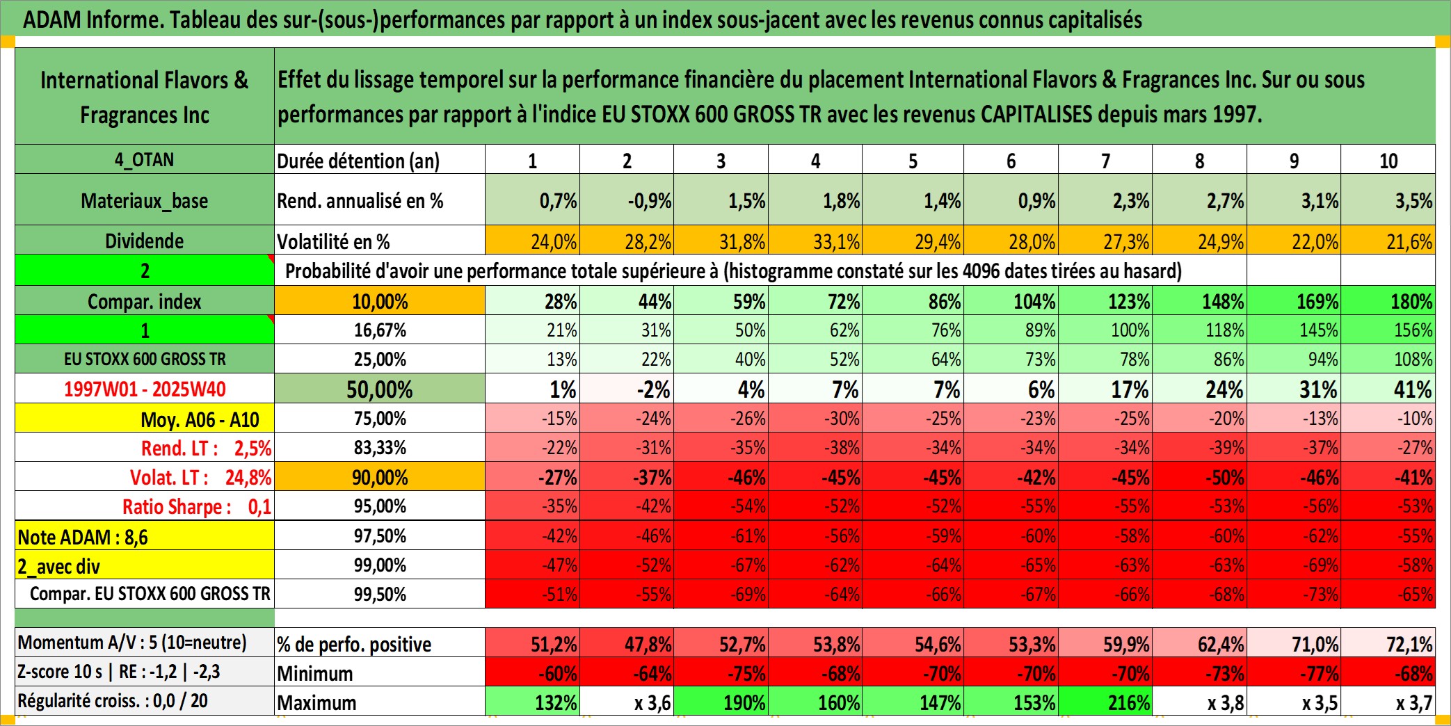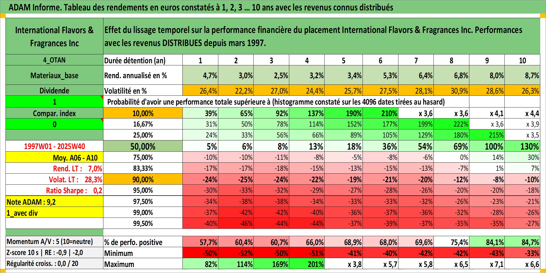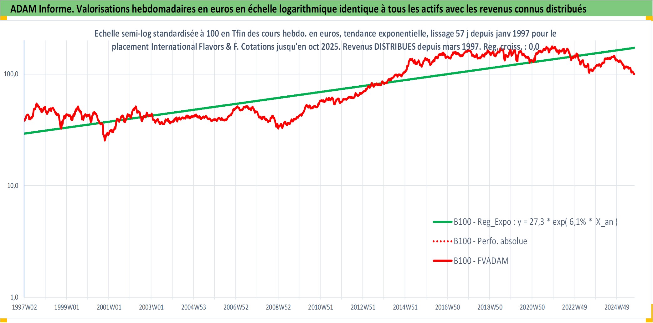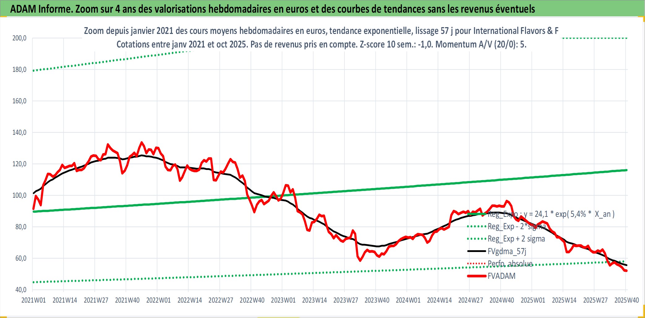 Site dédié aux investisseursPage dédiée sur site financeAnalyse des valorisations hebdomadaires de l'action International Flavors & Fragrances Inc. Cet actif est cote en USD. Les valorisations sont en contrevaleur EURO et couvrent les semaines 1997W01 a 2025W40. Les revenus de cet actif financier sont pris en compte depuis la semaine 1997W12. La note globale ESG de cet actif est estimee a 9.0 (apres rebasage entre 0 et 20).