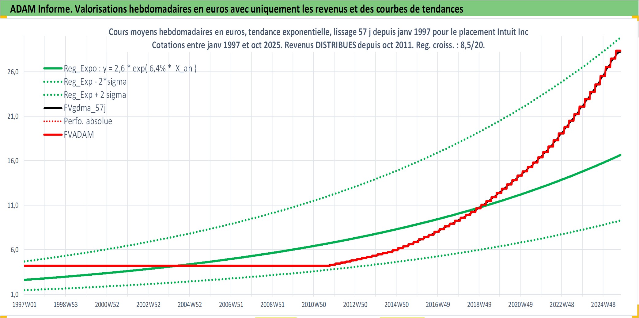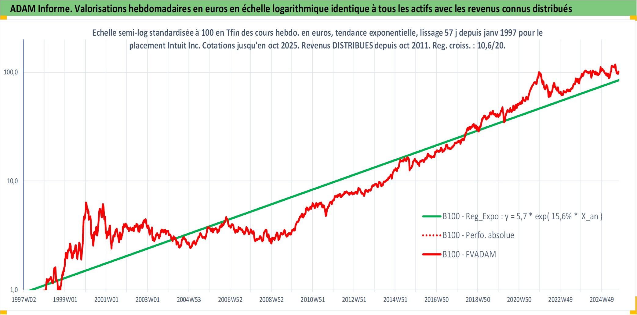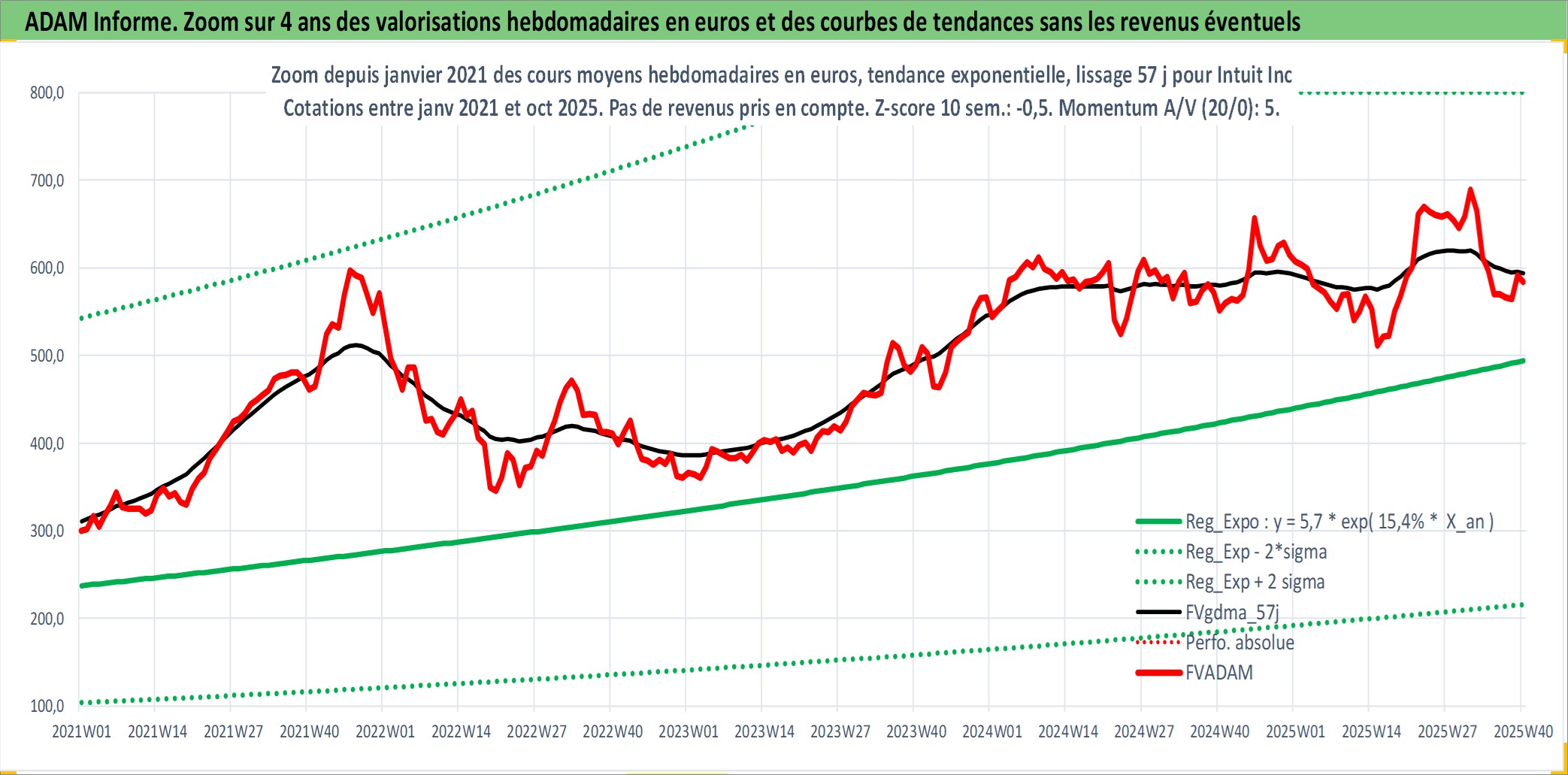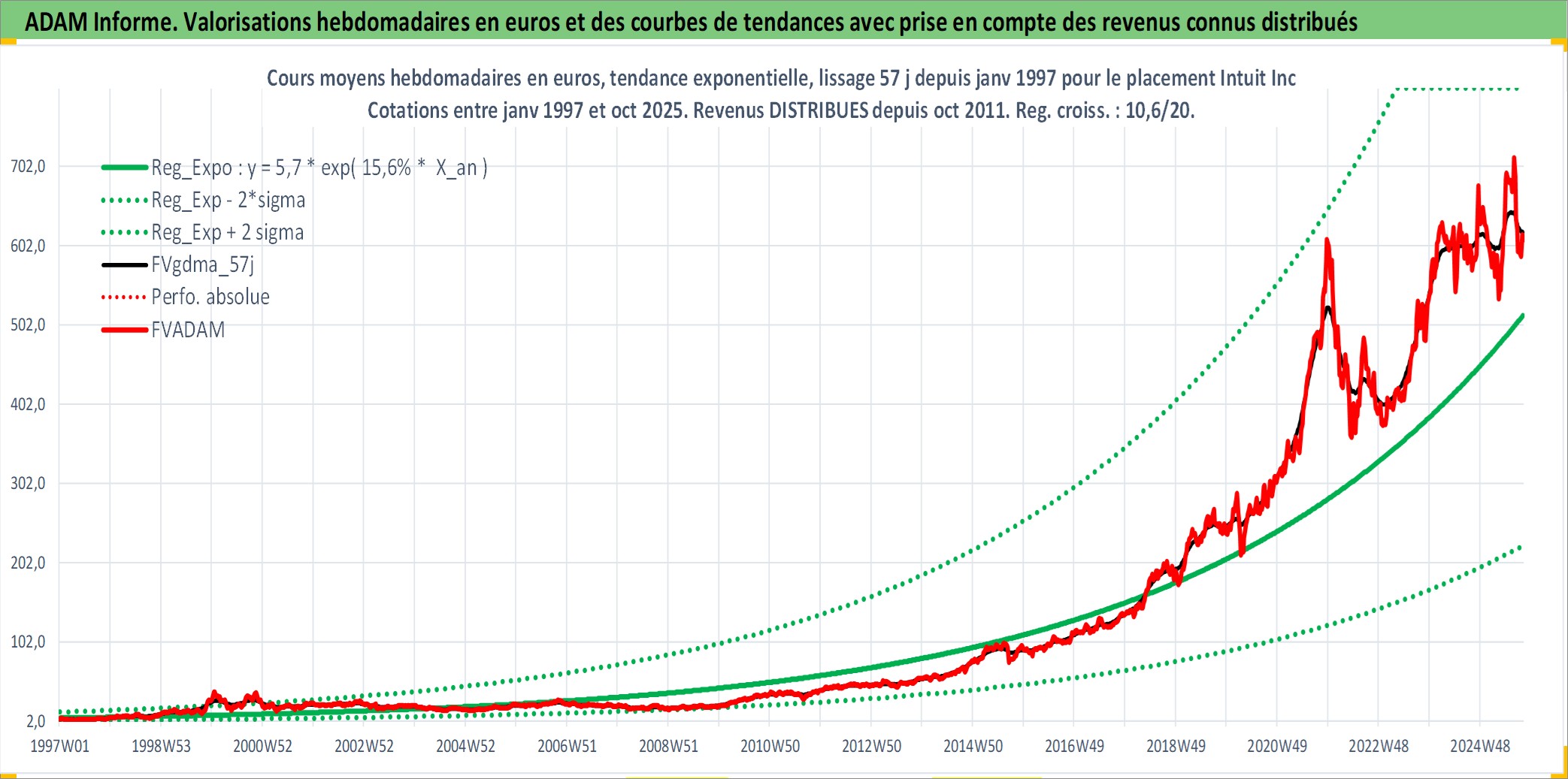 Site dédié aux investisseursPage dédiée sur site financeAnalyse des valorisations hebdomadaires de l'action Intuit Inc. Cet actif est cote en USD. Les valorisations sont en contrevaleur EURO et couvrent les semaines 1997W01 a 2025W40. Les revenus de cet actif financier sont pris en compte depuis la semaine 2011W40. La note globale ESG de cet actif est estimee a 13.0 (apres rebasage entre 0 et 20).