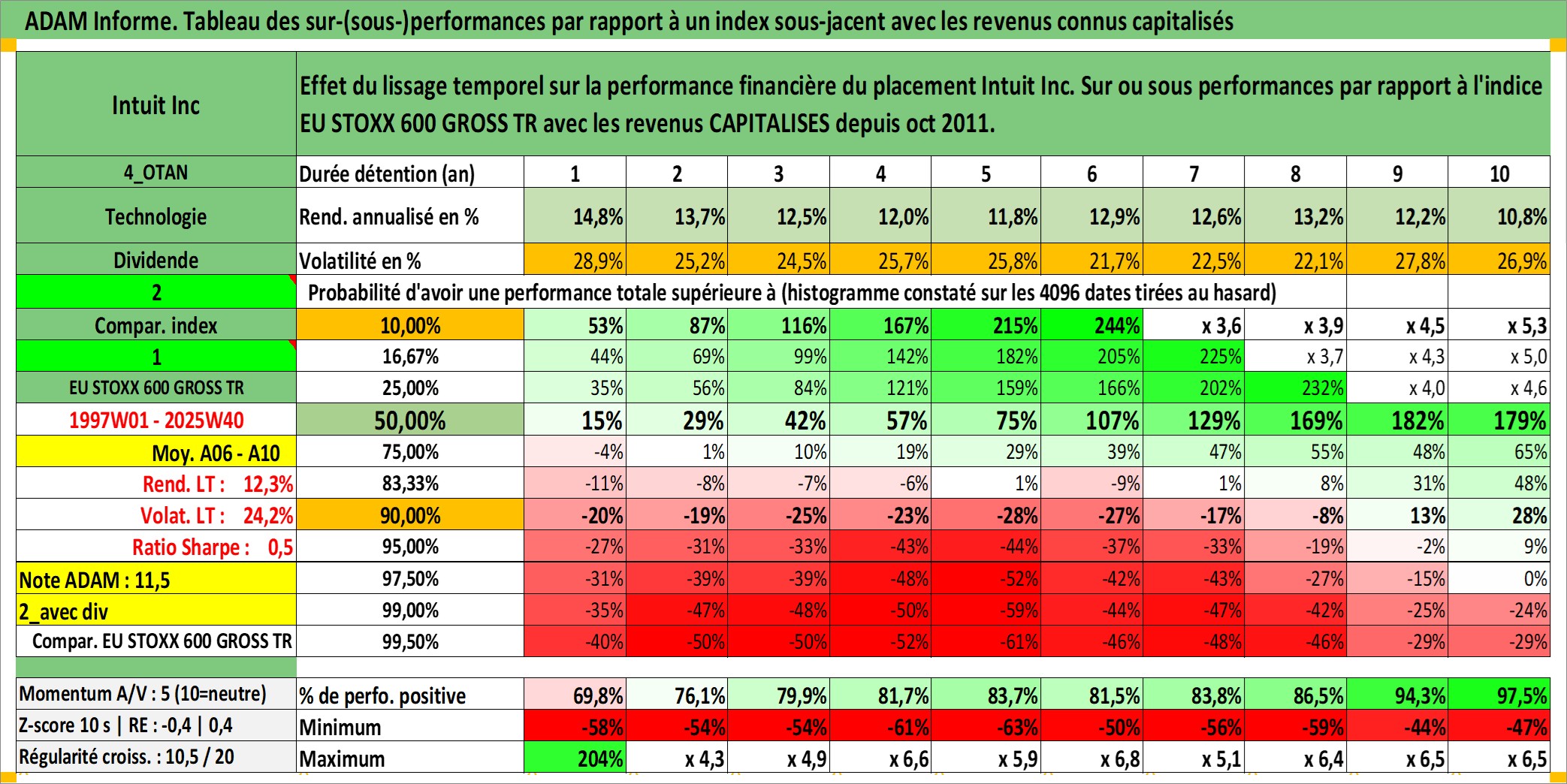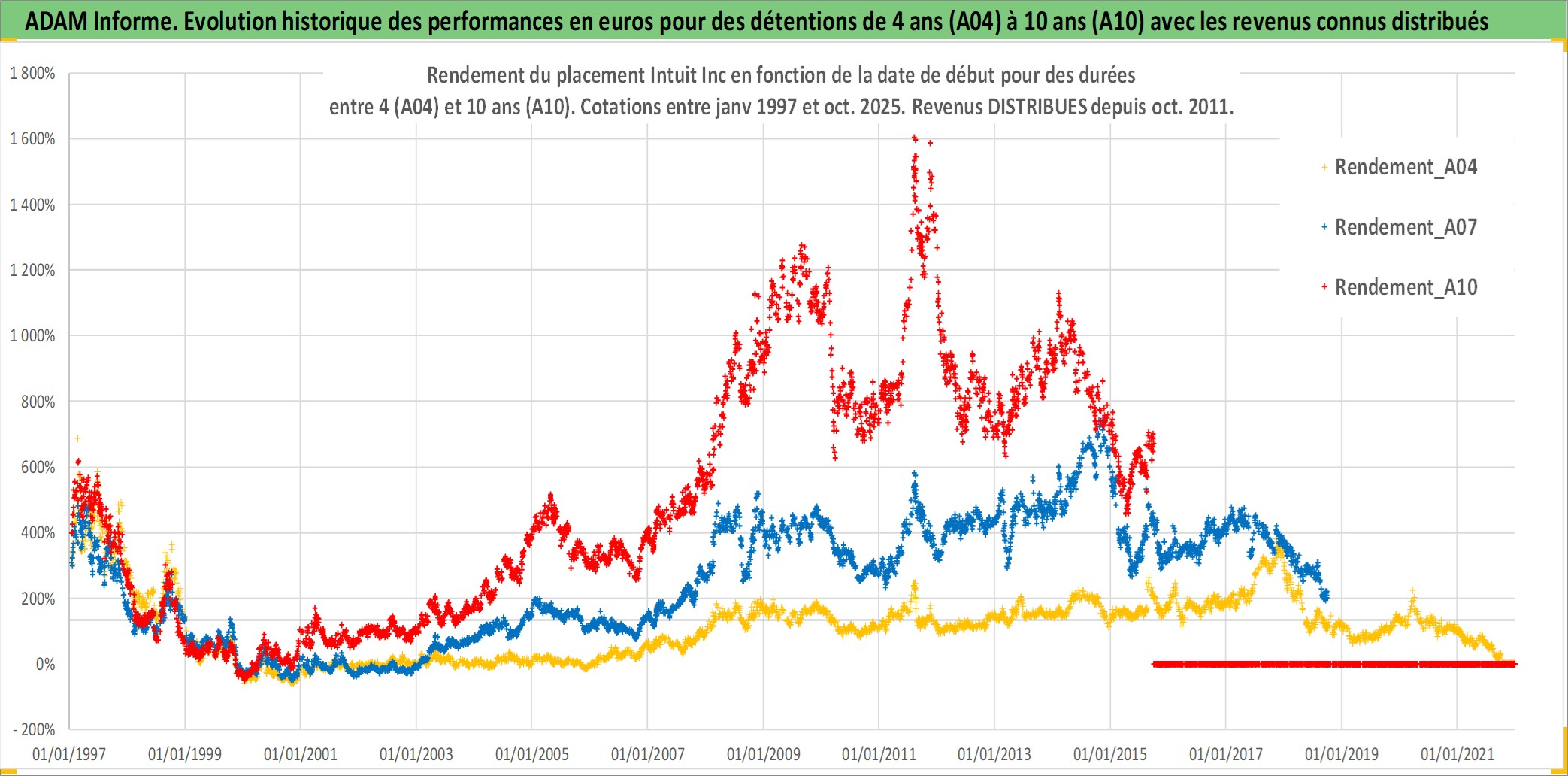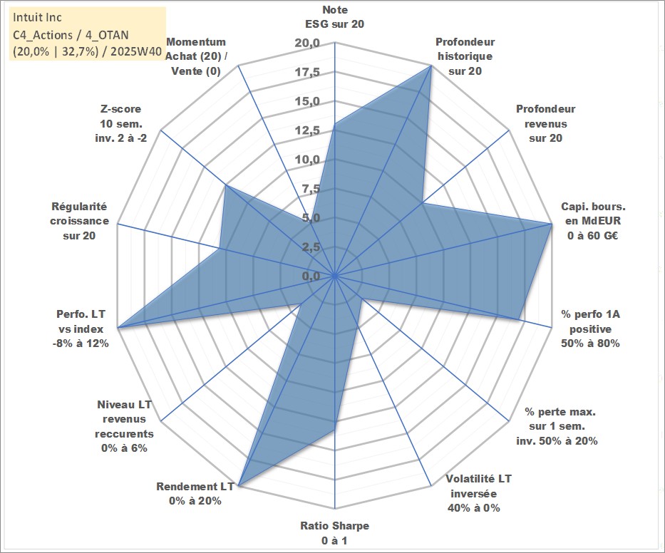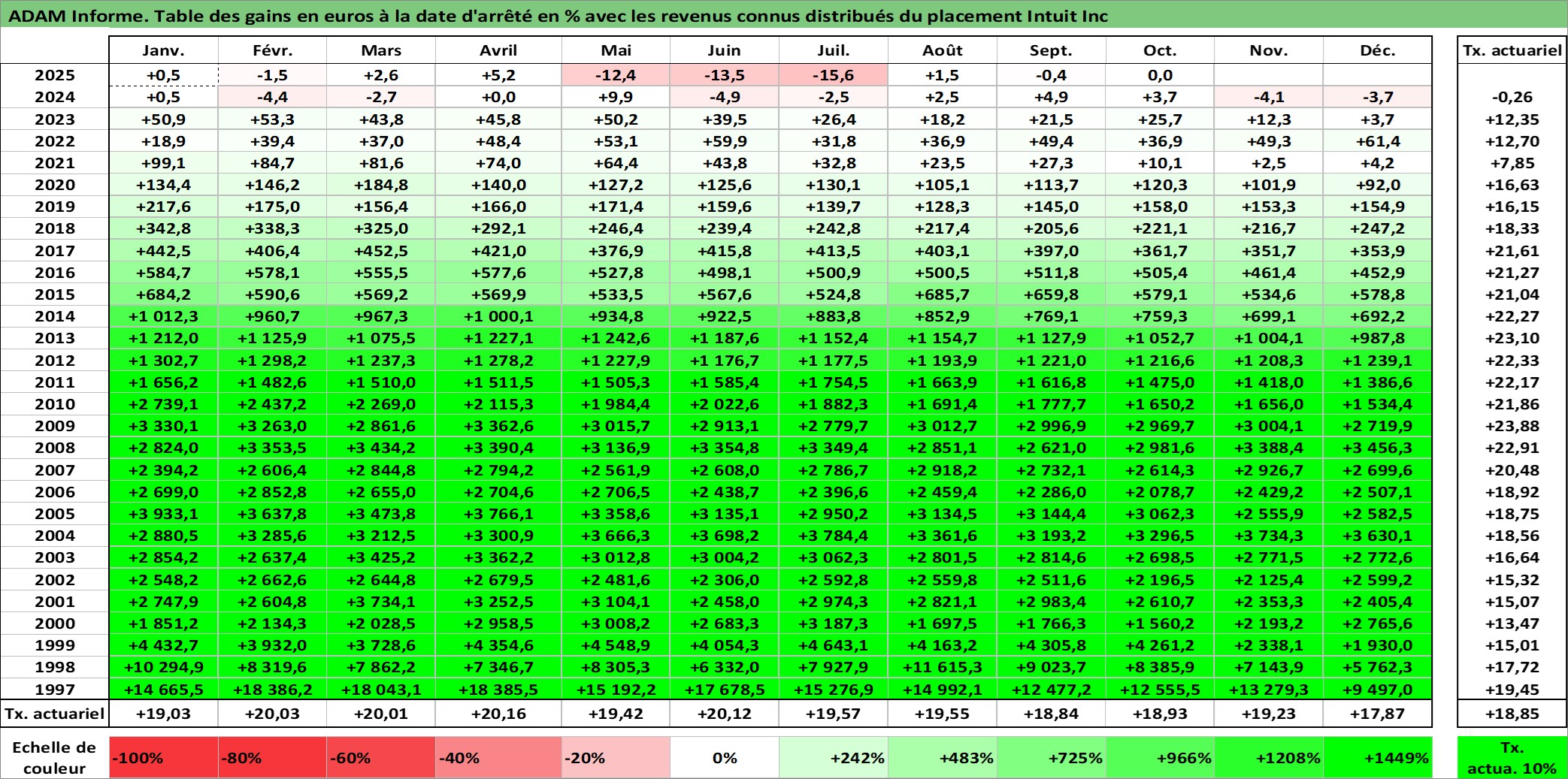 Site dédié aux investisseursPage dédiée sur site financeAnalyse des valorisations hebdomadaires de l'action Intuit Inc. Cet actif est cote en USD. Les valorisations sont en contrevaleur EURO et couvrent les semaines 1997W01 a 2025W40. Les revenus de cet actif financier sont pris en compte depuis la semaine 2011W40. La note globale ESG de cet actif est estimee a 13.0 (apres rebasage entre 0 et 20).