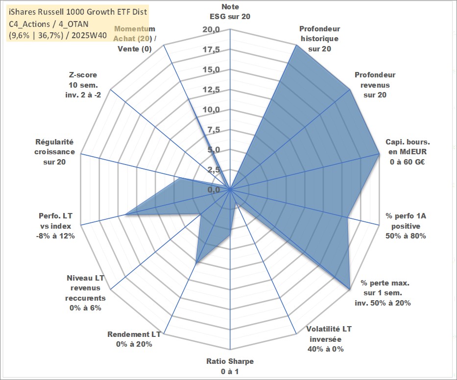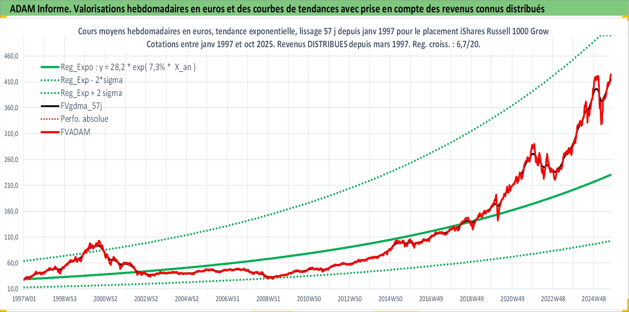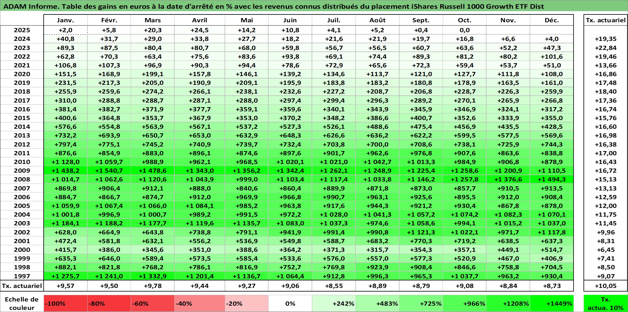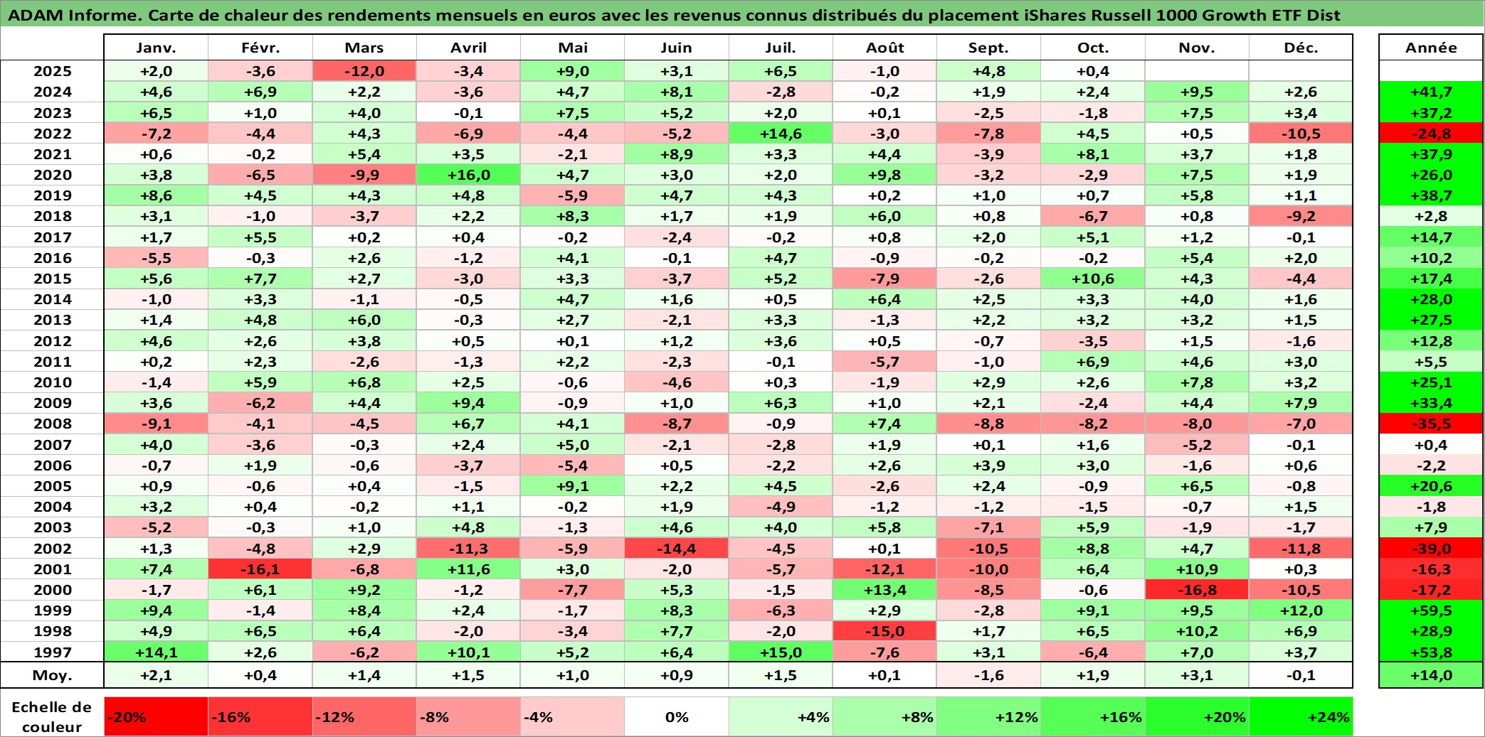 Site dédié aux investisseursPage dédiée sur site financeAnalyse des valorisations hebdomadaires du fonds iShares Russell 1000 Growth ETF Dist. Cet actif est cote en USD. Les valorisations sont en contrevaleur EURO et couvrent les semaines 1997W01 a 2025W40. Les revenus de cet actif financier sont pris en compte depuis la semaine 1997W13. La note ESG de cet actif n'est pas connue.