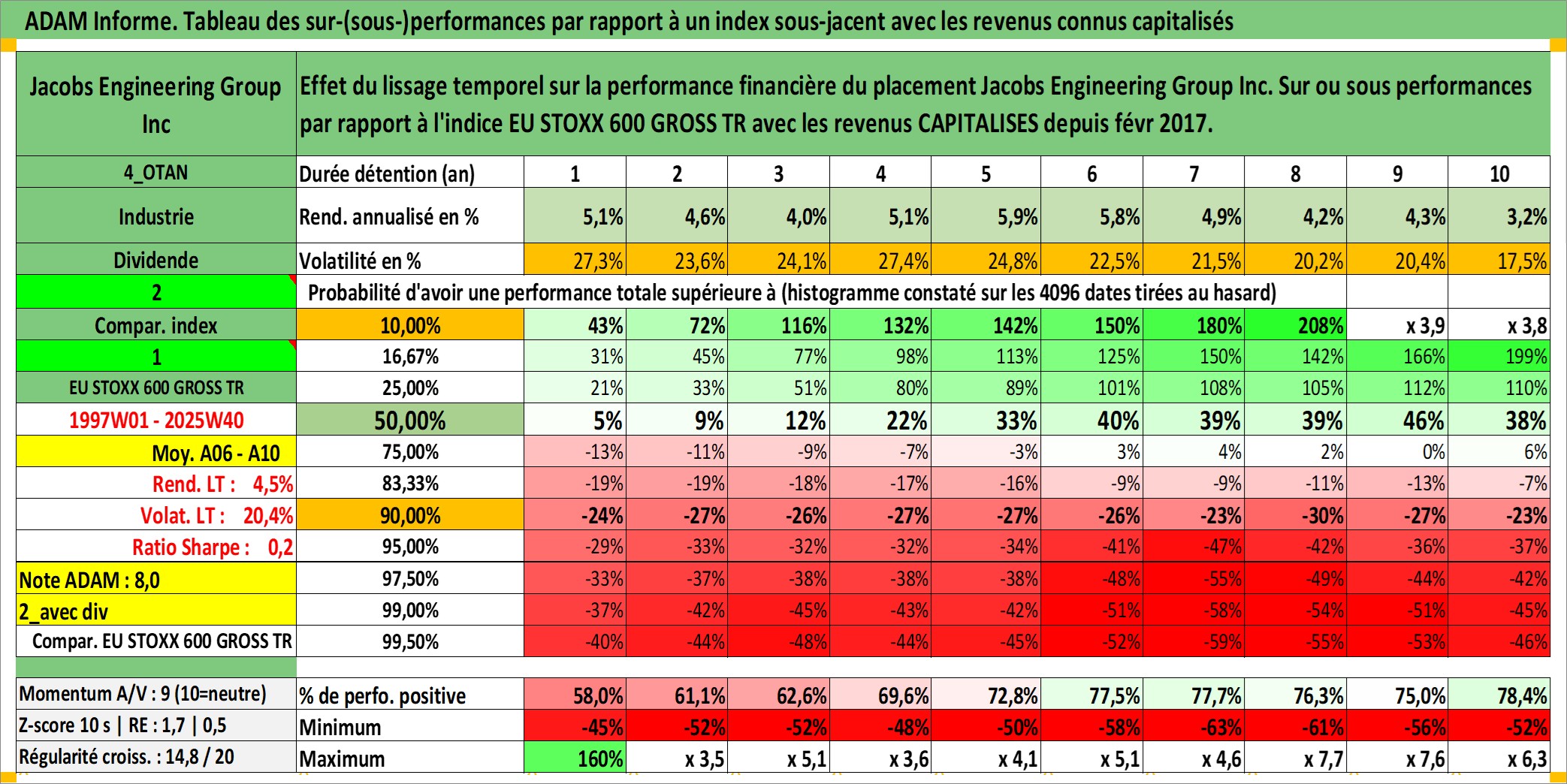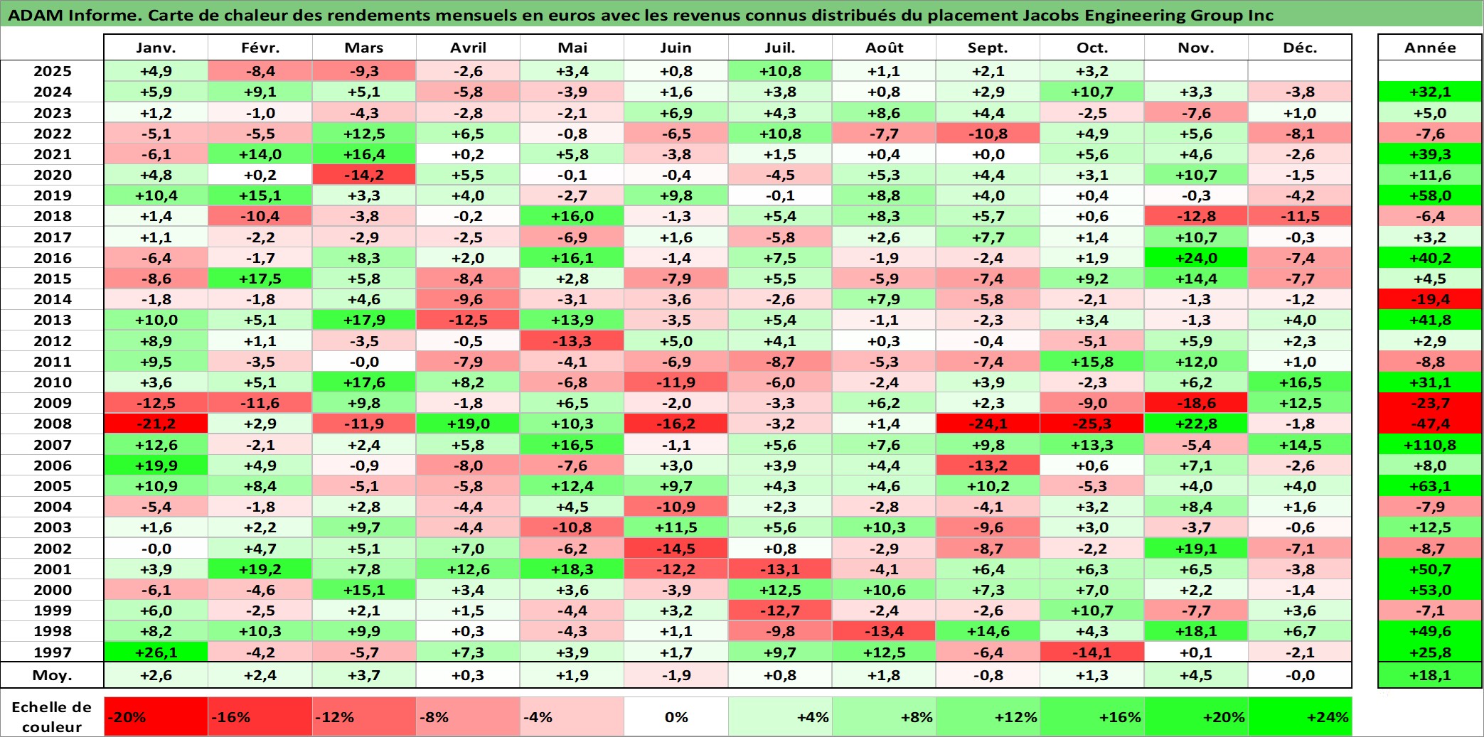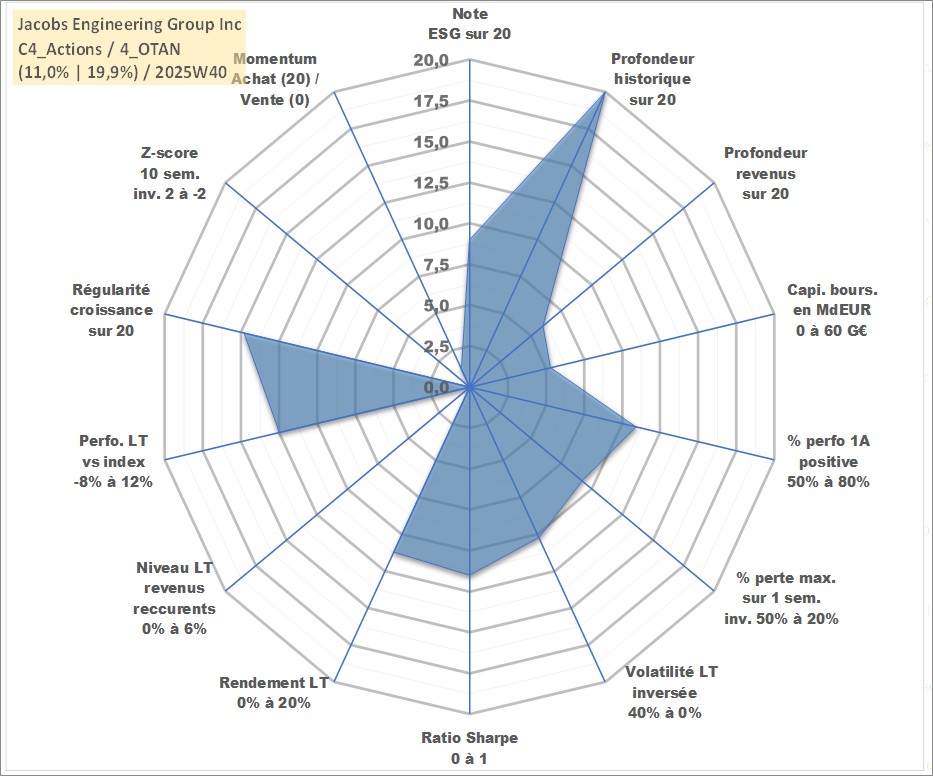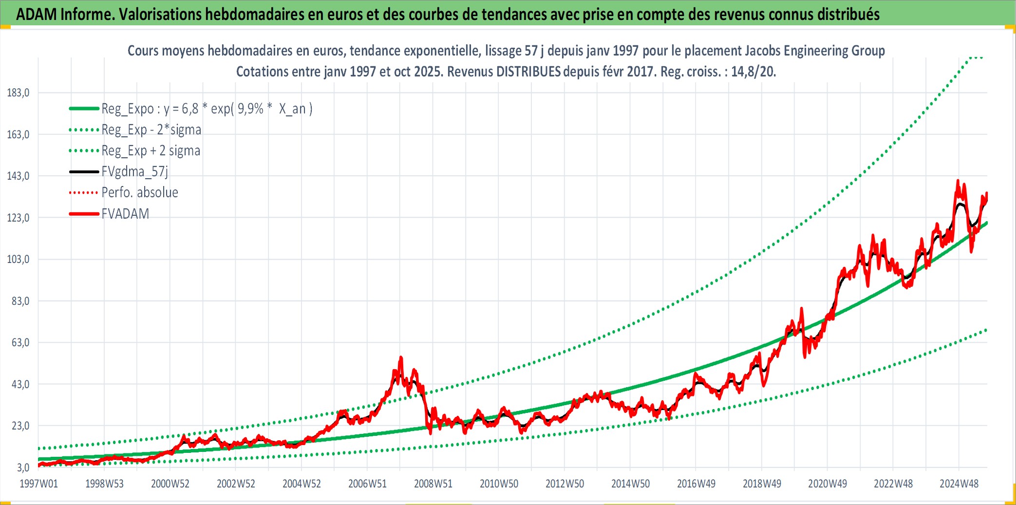 Site dédié aux investisseursPage dédiée sur site financeAnalyse des valorisations hebdomadaires de l'action Jacobs Engineering Group Inc. Cet actif est cote en USD. Les valorisations sont en contrevaleur EURO et couvrent les semaines 1997W01 a 2025W40. Les revenus de cet actif financier sont pris en compte depuis la semaine 2017W07. La note globale ESG de cet actif est estimee a 9.0 (apres rebasage entre 0 et 20).